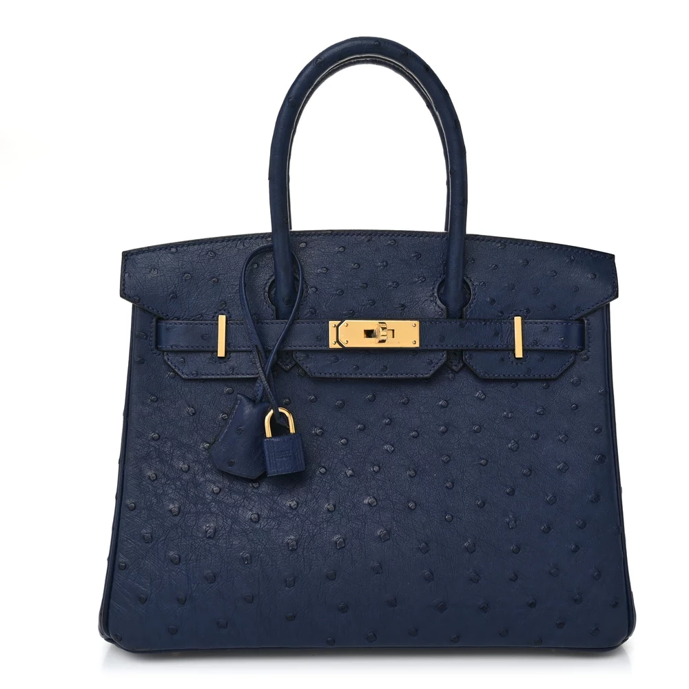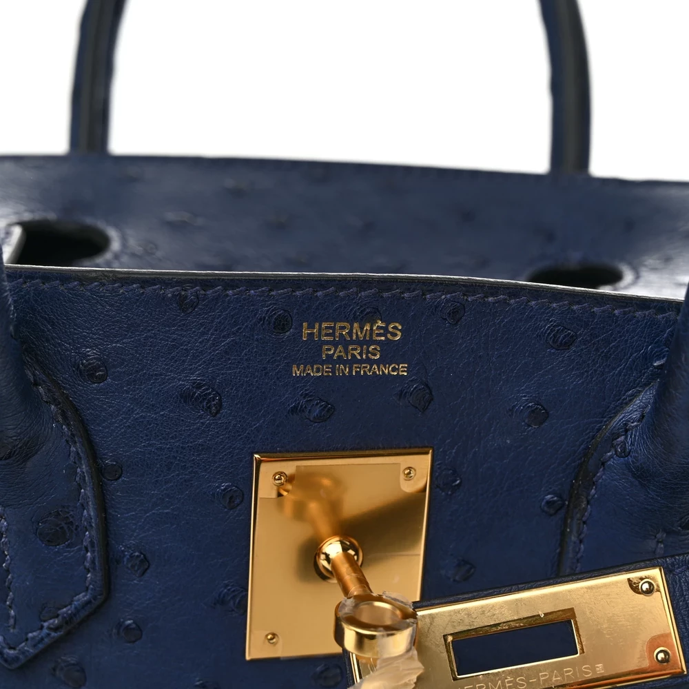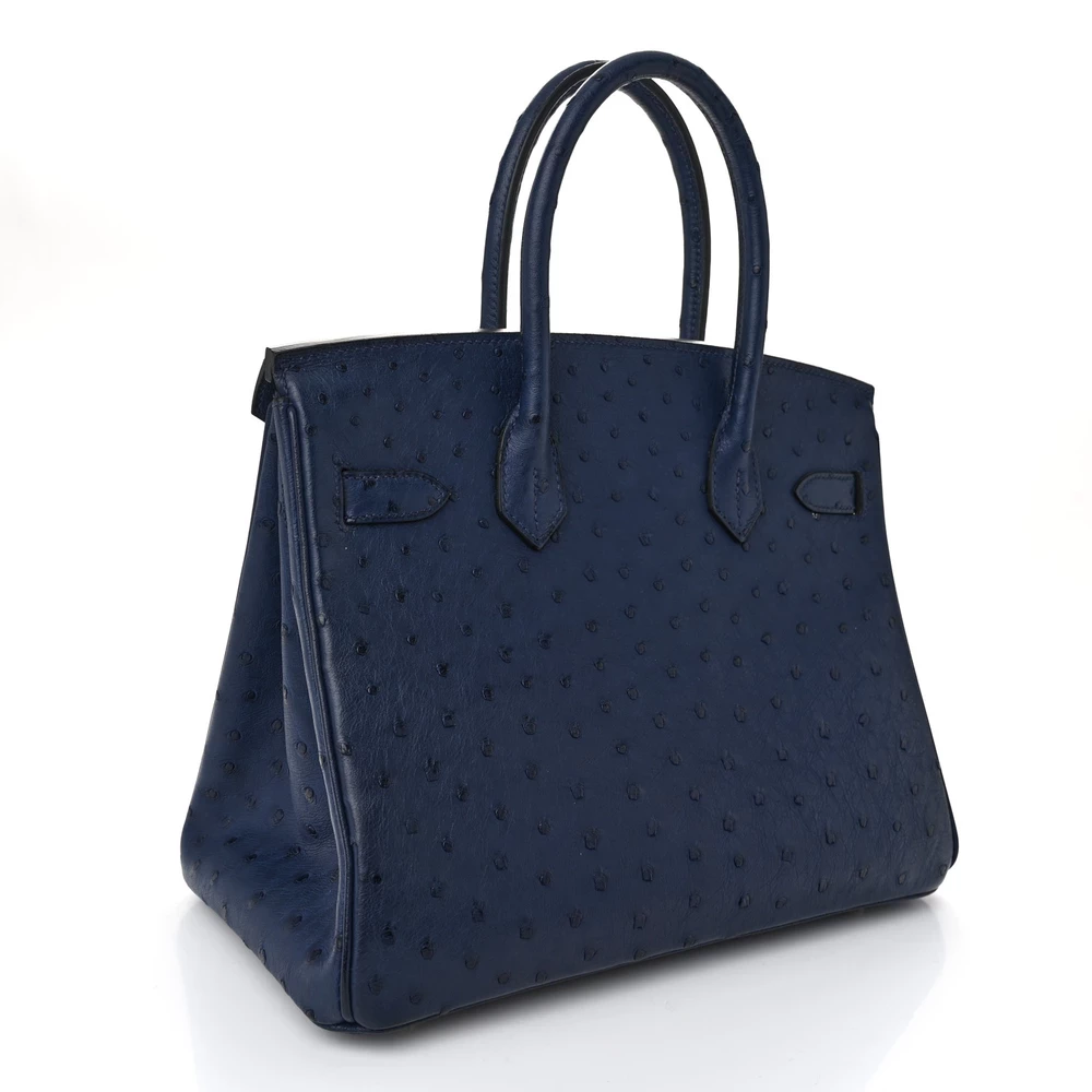 This Hermès Ostrich Birkin 30 in Bleu Iris is an exquisite handbag crafted from ostrich leather, renowned for its unique texture and durability. The Bleu Iris color offers a deep and captivating hue, adding a touch of luxury to any outfit. At 30 cm, it balances functionality with elegance, providing sufficient space for essentials. The palladium hardware complements the rich color, enhancing its overall allure.