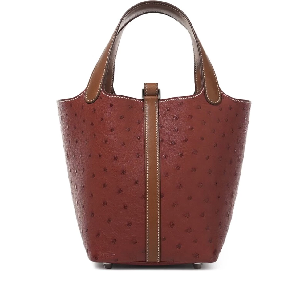 This Hermès Fauve Barenia and Brique Ostrich Touch Picotin Lock 18 with Palladium Hardware is an ultra-rare and luxurious handbag featuring a mix of smooth Barenia leather and exotic ostrich accents. The warm brown tones are complemented by the unique texture of the ostrich leather, creating a visually rich contrast. The palladium hardware adds a sleek, modern finish. This Picotin is a collector’s dream, combining heritage craftsmanship with exotic elegance.