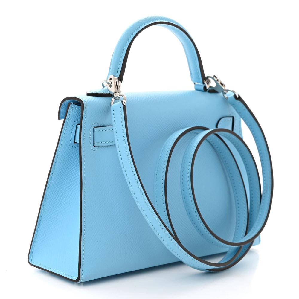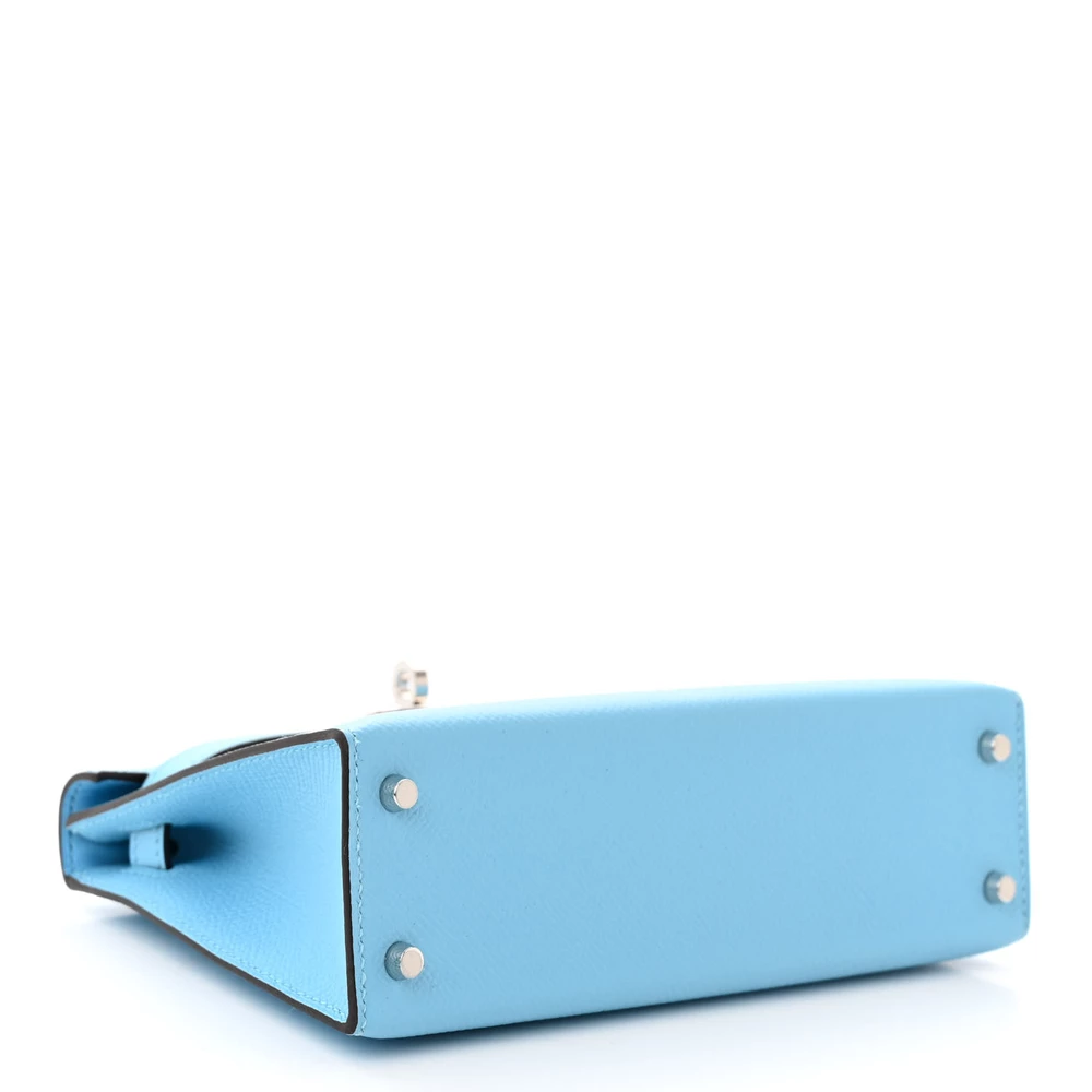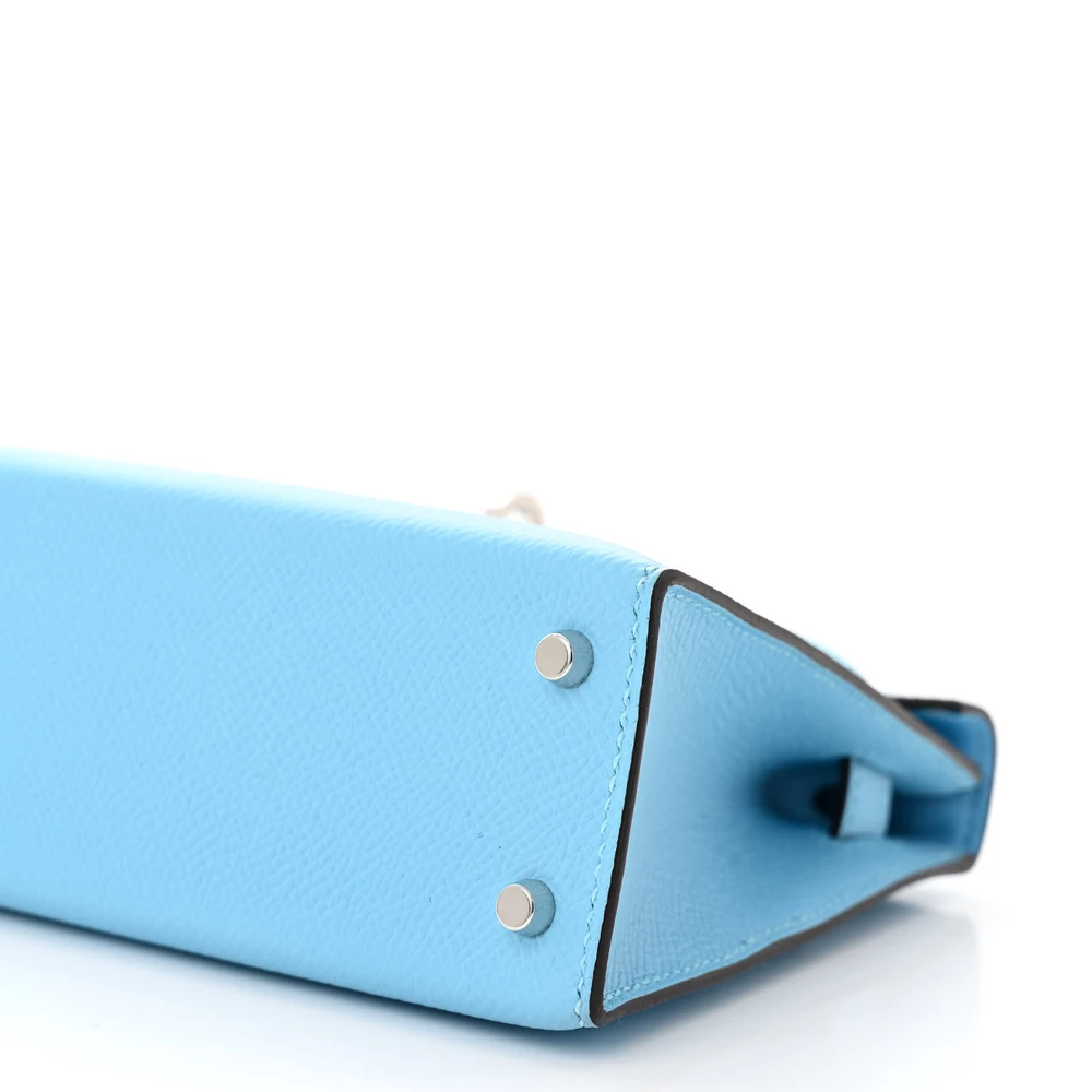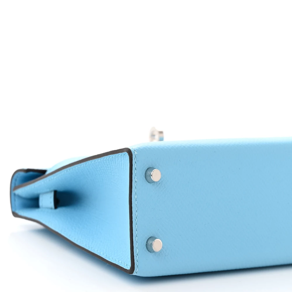 This Hermès Epsom Mini Kelly Sellier 20 Céleste is a dreamy and compact handbag in a soft, sky-blue shade. The Epsom leather ensures a structured, scratch-resistant finish, maintaining its crisp silhouette. The Mini Kelly size adds to its delicate and elegant appeal. Palladium hardware provides a sleek and modern contrast. This Kelly is a charming and sophisticated statement piece.