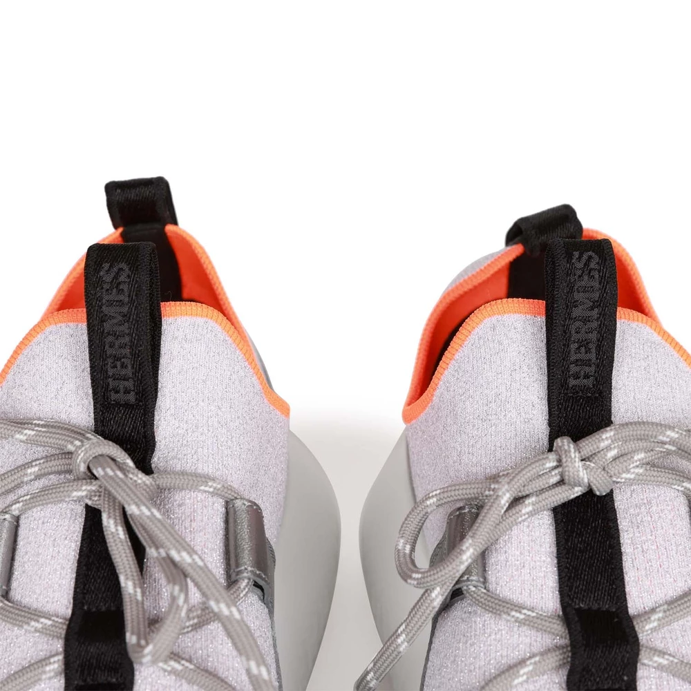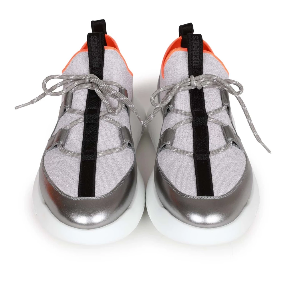 This Hermès Duel Sneaker in silver, black, and orange calfskin with a rubber sole is a bold and contemporary footwear choice. The striking color combination enhances its sporty yet high-fashion appeal. The premium leather construction ensures durability and comfort for everyday wear. The dynamic design, complemented by the sleek silhouette, makes it a standout piece. This sneaker is perfect for those who love to make a stylish statement while maintaining practicality.