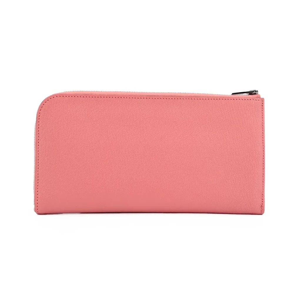 This Hermès long wallet in Rose Azalee (8W) is a charming and elegant piece, crafted from luxurious Chevre leather known for its fine grain and durability. The Palladium hardware adds a modern touch, complementing the soft pink hue with a subtle contrast. Measuring approximately 20cm in width and 10.5cm in height, it offers a sleek and practical design for everyday essentials. Accompanied by its original box, this wallet is a refined addition to any collection. Currently available in Singapore, it embodies Hermès’ timeless craftsmanship and sophistication.