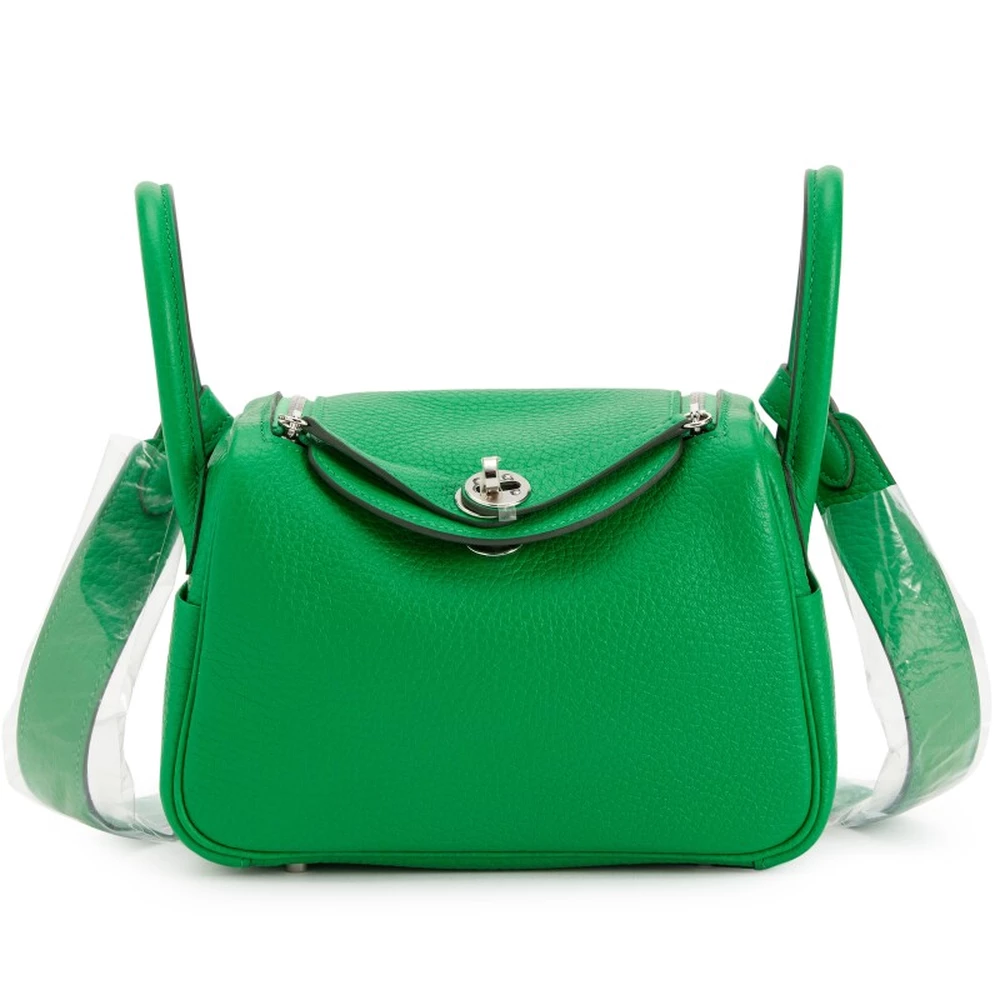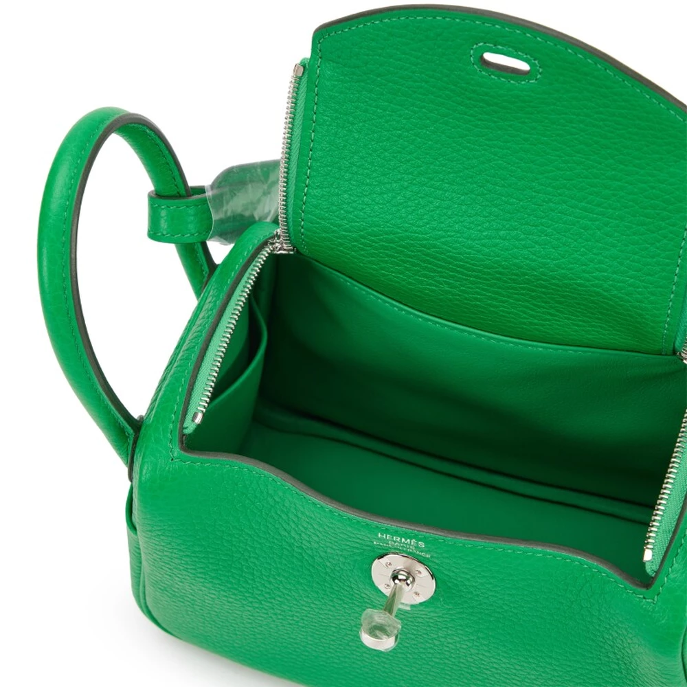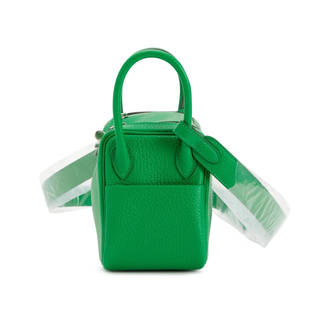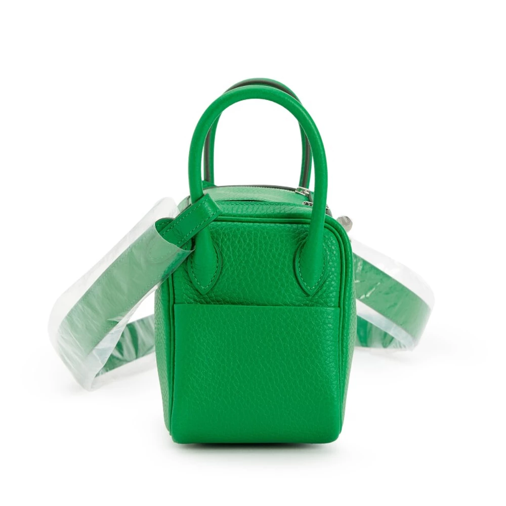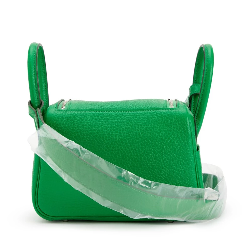 This Hermès Bambou Clémence Mini Lindy 20 with Palladium Hardware is a bold and vibrant handbag in a rich green hue. The grained Clémence leather provides a soft yet structured feel, while the palladium hardware offers a sleek contrast. Its playful yet sophisticated look makes it a perfect addition to any collection.