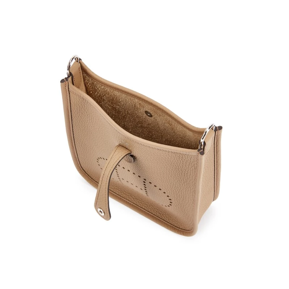 This Hermès Beige Marfa Clémence Mini Evelyne II TPM 16 with Palladium Hardware is a beautifully neutral and versatile crossbody bag. The soft beige hue pairs elegantly with the grained Clémence leather, while the palladium hardware maintains a sleek and contemporary feel. The perforated “H” logo and lightweight design make it a must-have everyday piece.
