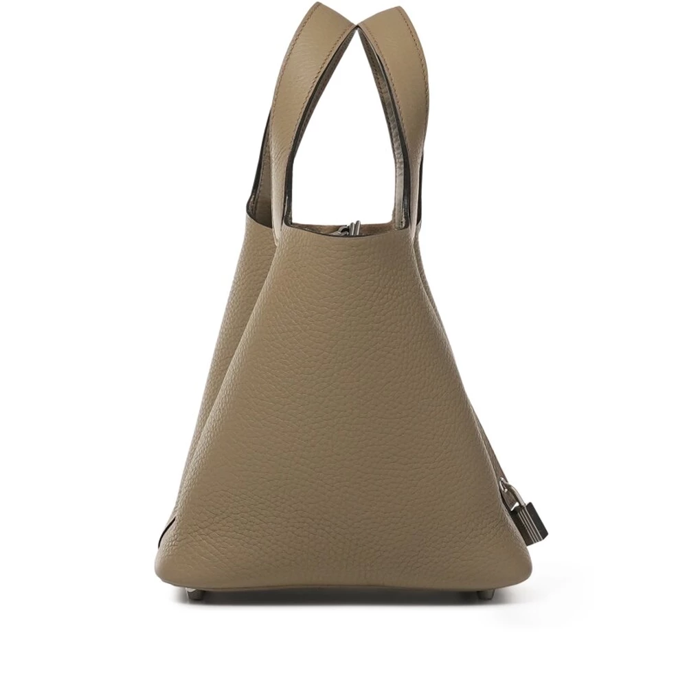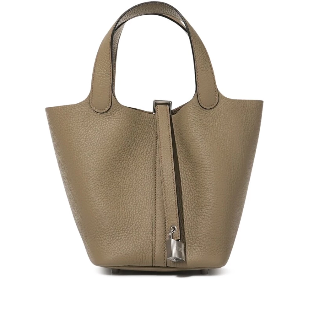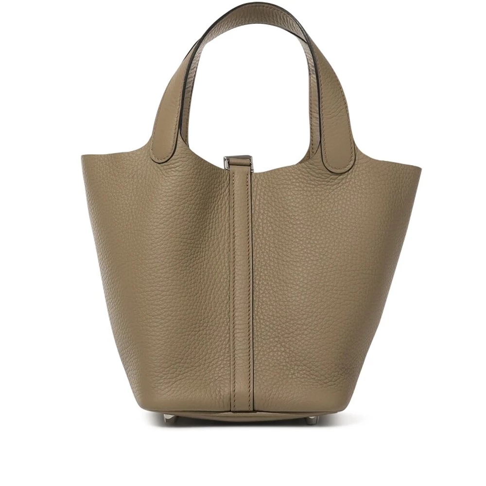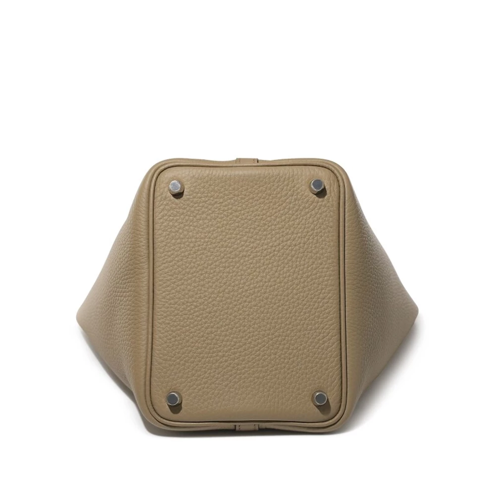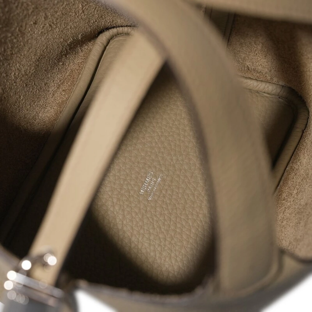 This Hermès Beige Marfa Clémence Picotin Lock 18 with Palladium Hardware is a beautifully neutral and versatile handbag. The soft beige tone pairs effortlessly with the relaxed drape of Clémence leather, while the palladium hardware adds a cool, modern contrast. The bucket design makes it both stylish and functional. This Picotin is a refined everyday choice.