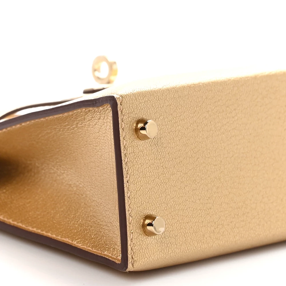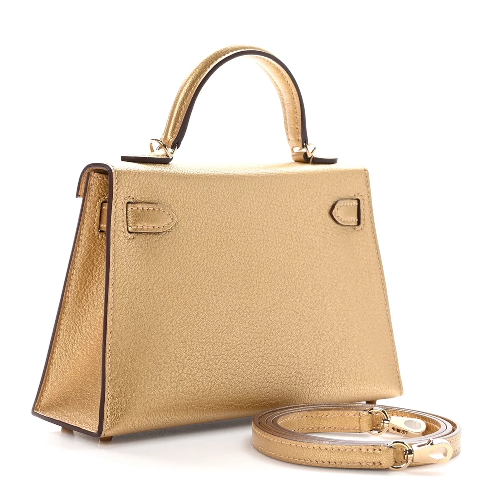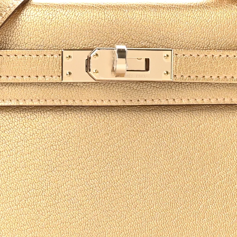 This Hermès Metallic Chèvre Chamkilight Mini Kelly Sellier 20 Doré is a dazzling and rare handbag with a metallic gold finish. The Chèvre Chamkilight leather offers a fine grain with a stunning shimmer, making it a unique statement piece. The compact 20 cm size is perfect for special occasions. Gold hardware blends seamlessly with the radiant tone, elevating its luxurious appeal. This Mini Kelly is a dream piece for collectors who love glamorous and rare designs.