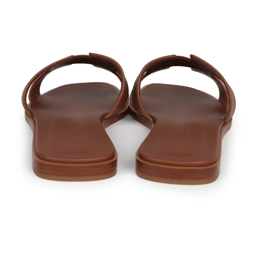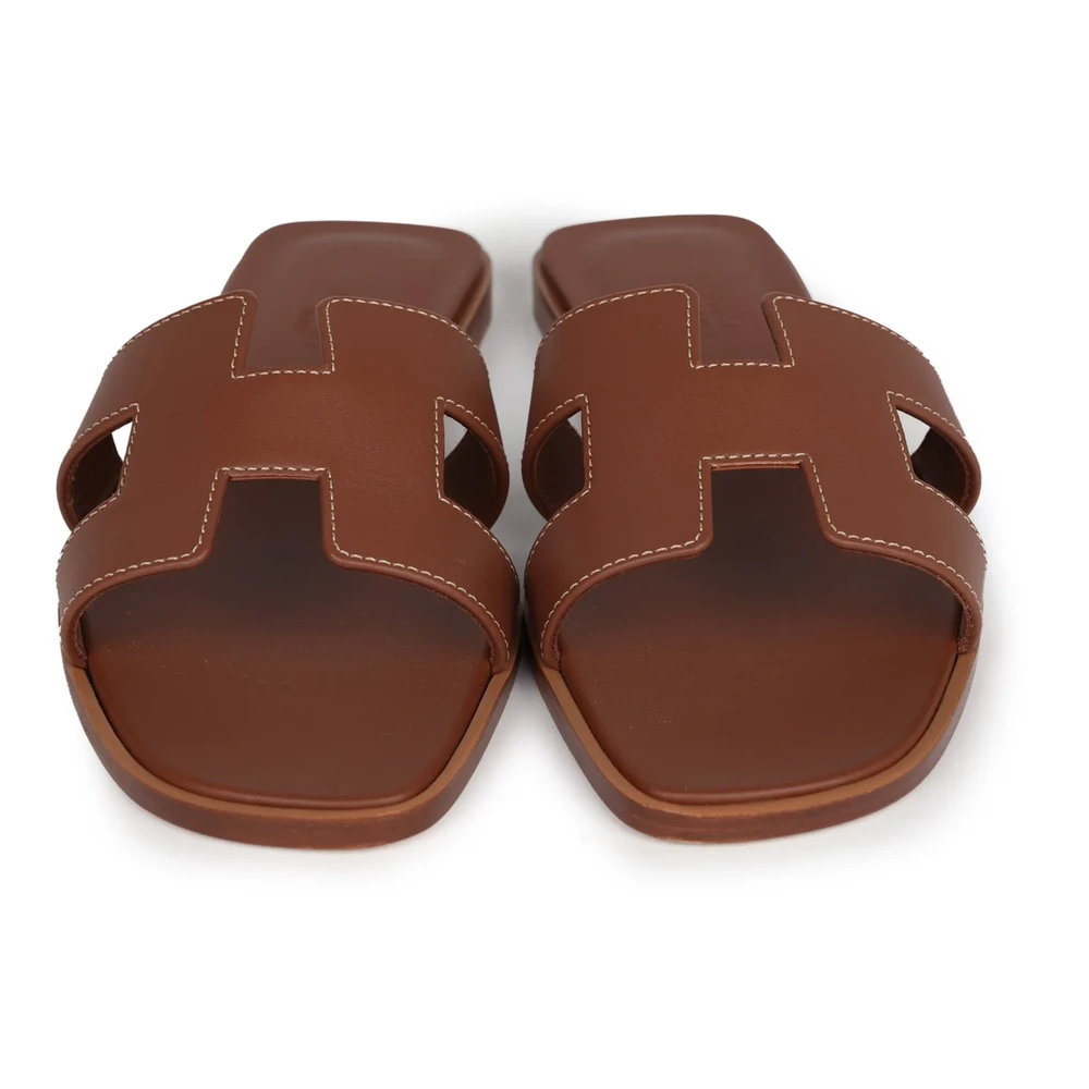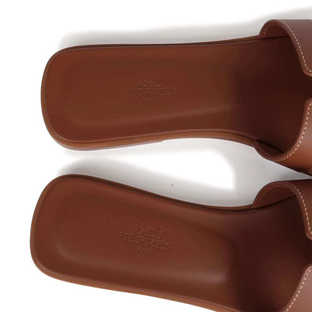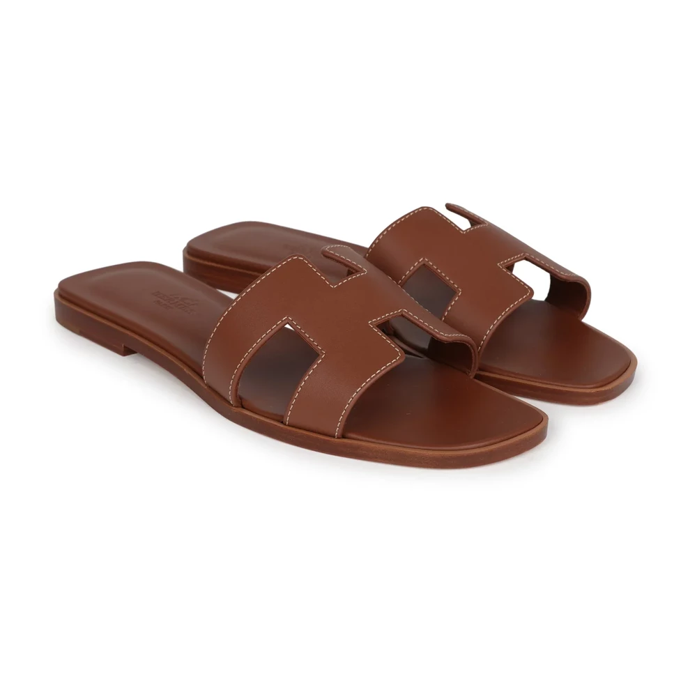 This Hermès Oran sandal in Gold box calfskin is a timeless luxury essential. The structured box calfskin in a warm caramel shade provides a polished finish. The signature H-cut design adds elegance, while the flat sole ensures ease of wear. This sandal seamlessly complements both casual and sophisticated outfits.