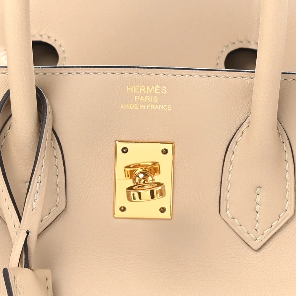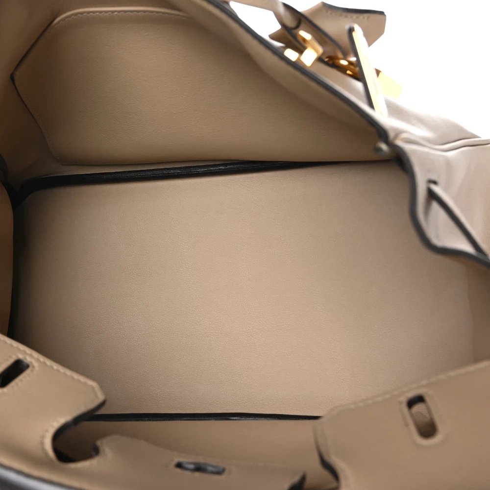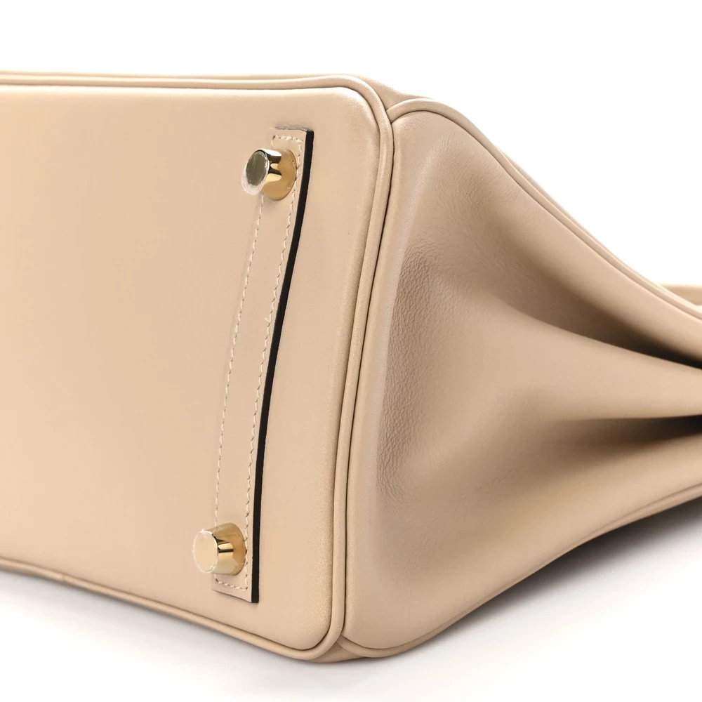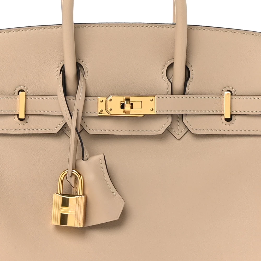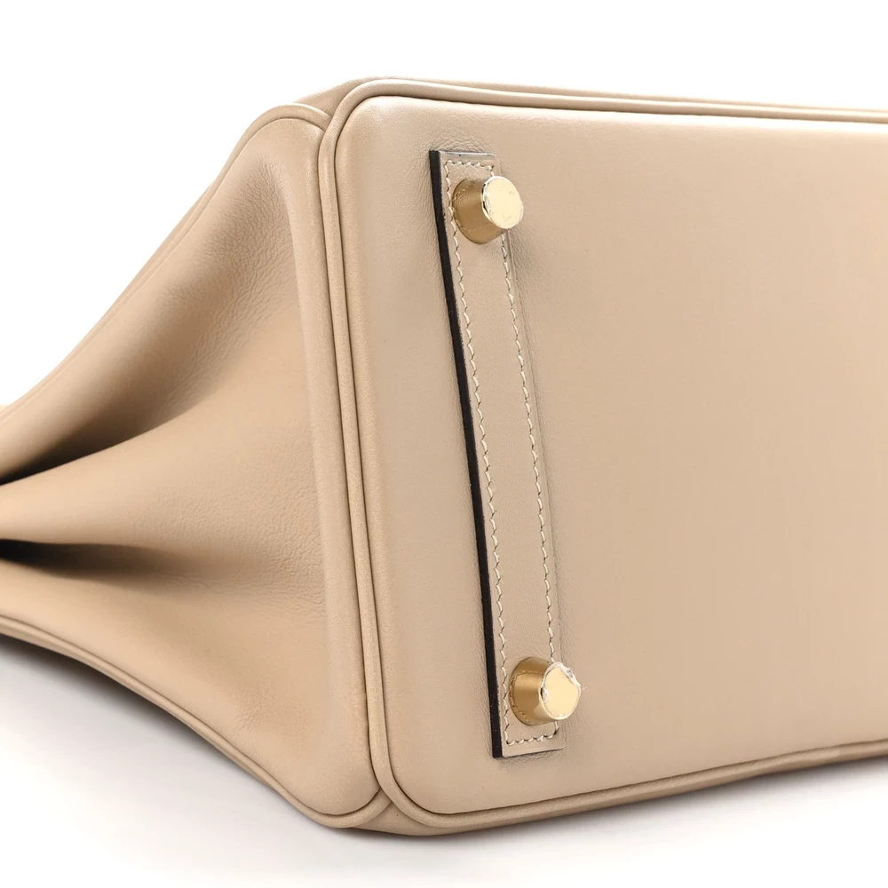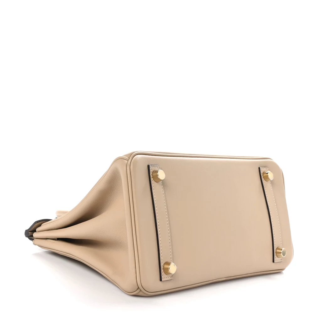 This Hermès Swift Birkin 25 in Trench is a refined and neutral handbag in a beige-taupe hue. Crafted from Swift leather, it has a smooth, soft finish that gives it a delicate yet luxurious look. The 25 cm size makes it a stylish and compact companion for both day and evening wear. Palladium hardware adds a contemporary touch to the warm neutral tone. This is a timeless and effortlessly chic piece.