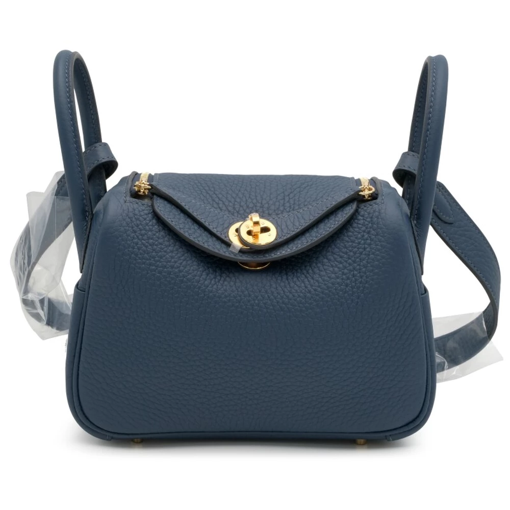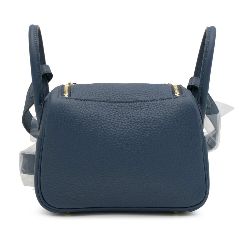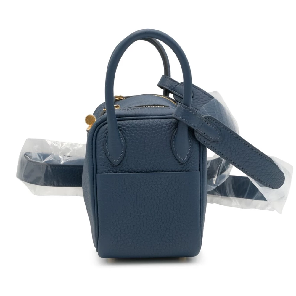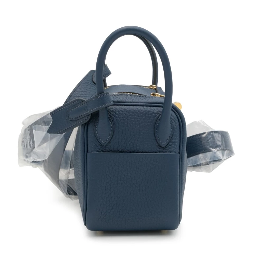 This Hermès Bleu de Prusse Clémence Mini Lindy 20 with Gold Hardware is a striking and sophisticated handbag in a rich navy blue shade. The soft Clémence leather enhances its relaxed yet structured silhouette, while the gold hardware adds a luxurious contrast. Its compact design makes it a versatile statement piece.