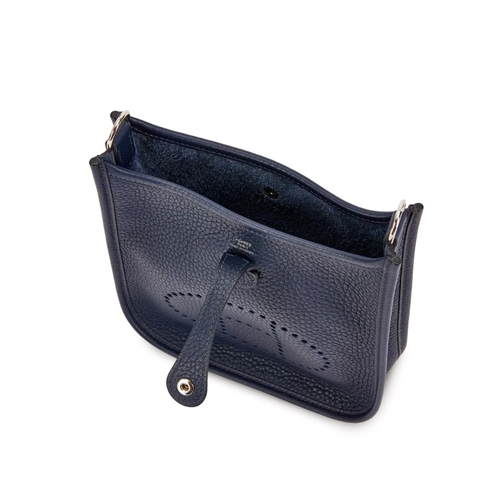 This Hermès Bleu Nuit Clémence Mini Evelyne II TPM 16 with Palladium Hardware is a refined crossbody bag in a deep midnight blue. The soft Clémence leather enhances its supple structure, while the palladium hardware provides a sleek and contemporary contrast. The perforated “H” logo and compact silhouette make it a sophisticated yet practical accessory.