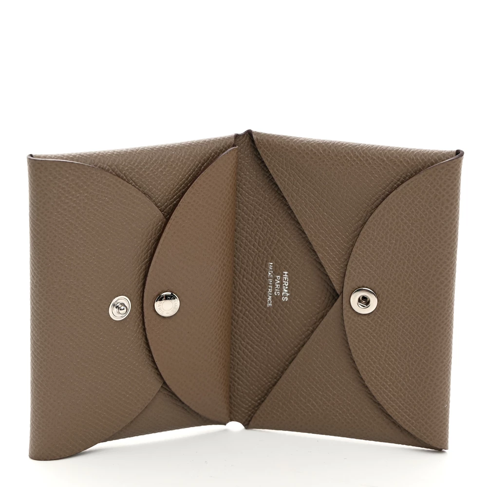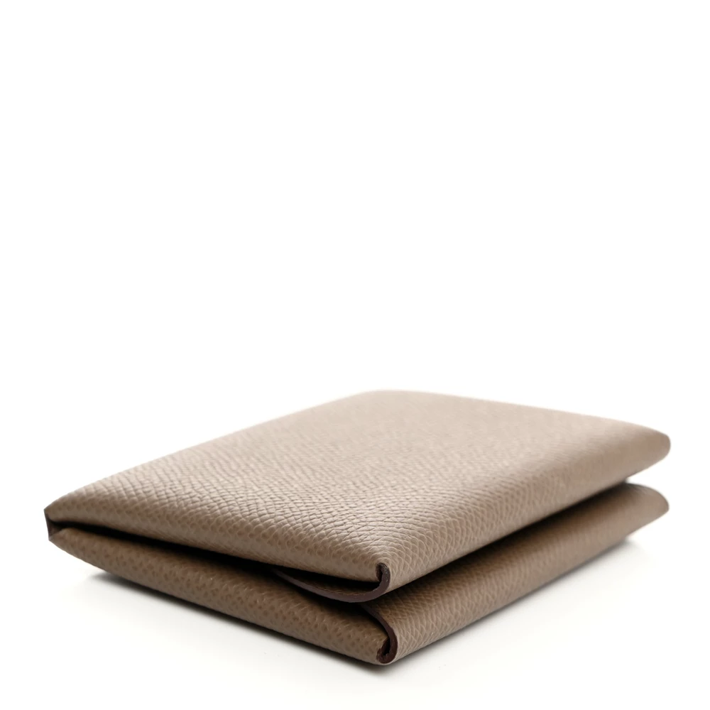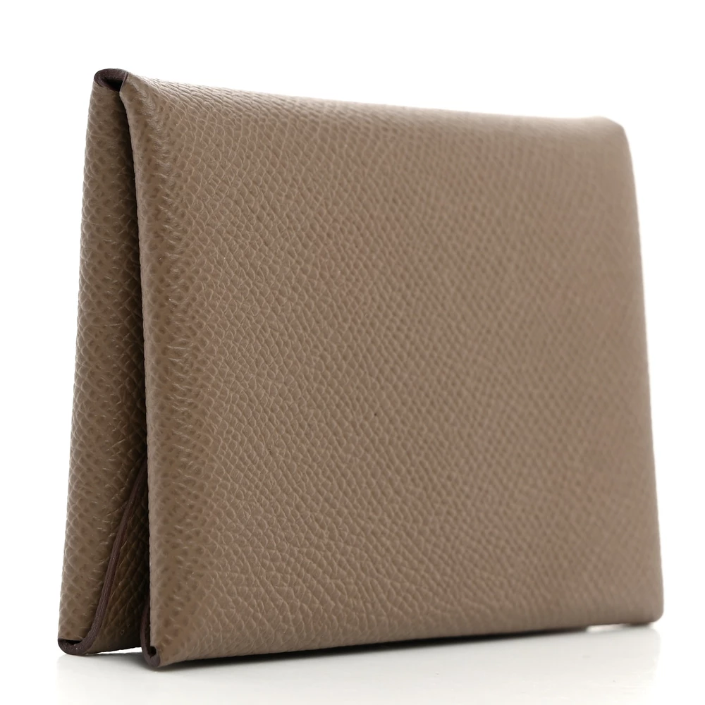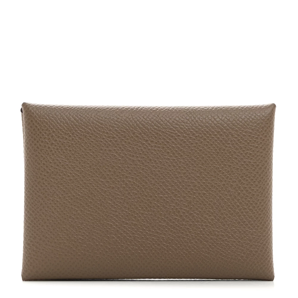 This Hermès Epsom Calvi Duo Card Case in Etoupe is a minimalist yet functional piece. The neutral hue enhances the fine texture of Epsom leather, ensuring a durable and sophisticated finish. Featuring an envelope-style design with multiple compartments, it keeps cards neatly organized. A sleek and practical choice for those who appreciate refined craftsmanship.