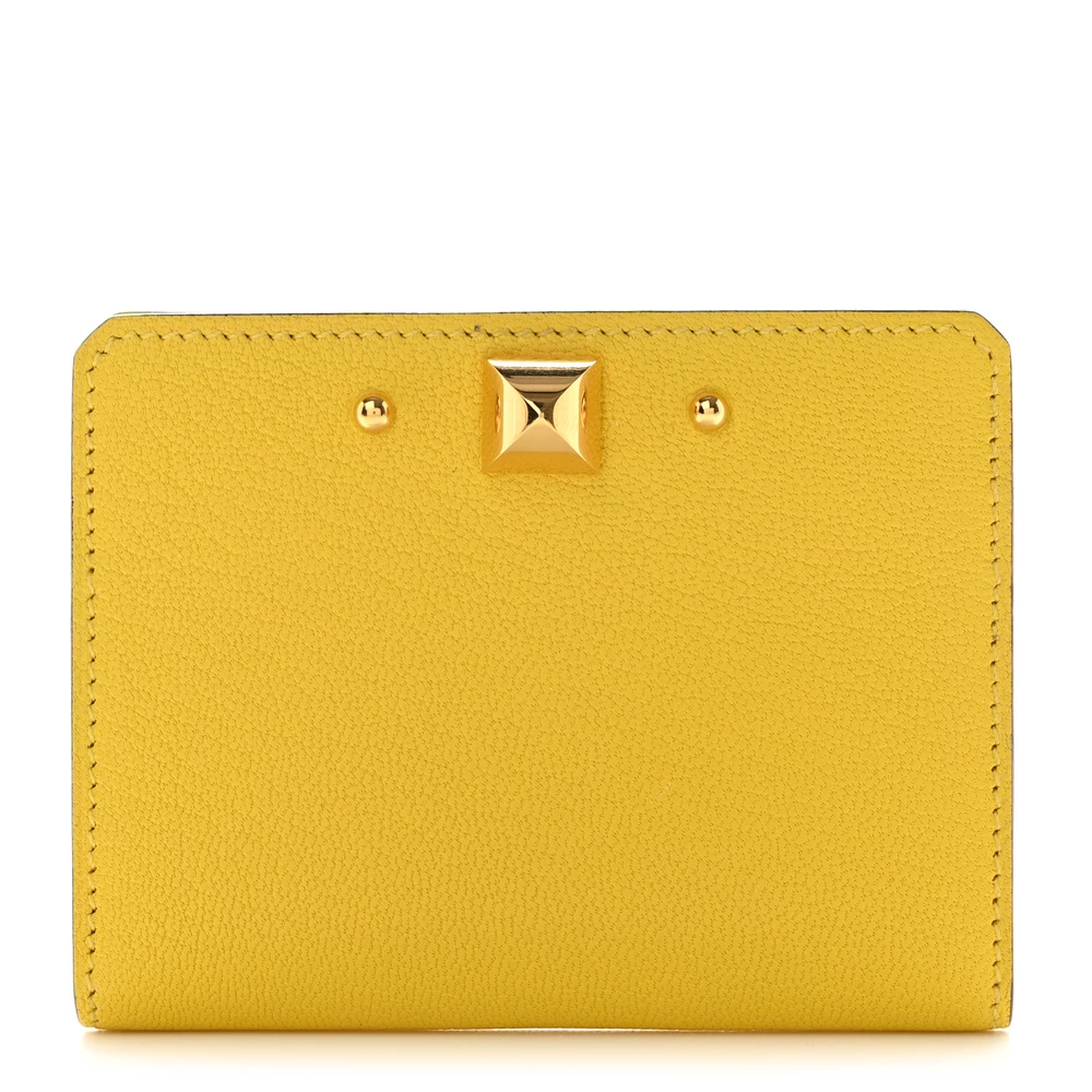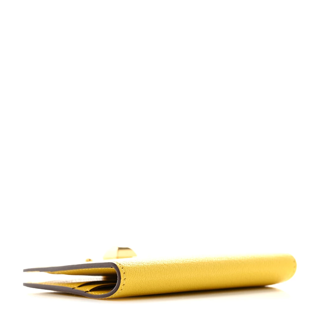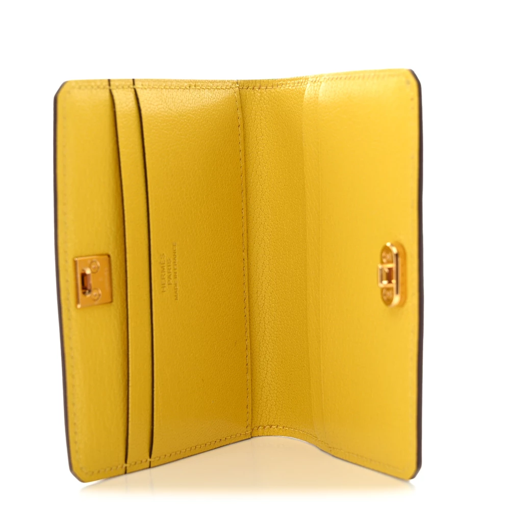 This Hermès Chevre Chamkila Medor Card Holder in Jaune De Naples is a vibrant and stylish accessory that combines bold color with luxurious craftsmanship. Made from textured goatskin leather known as Chevre Chamkila, this wallet is finished in a striking yellow that instantly captures attention. The polished gold Medor press lock adds a touch of elegance and sophistication, perfectly complementing the rich hue. The interior, crafted from matching leather, features flat card slots for optimal organization while maintaining a sleek and compact profile. This piece is perfect for those who appreciate a statement accessory with both style and functionality.