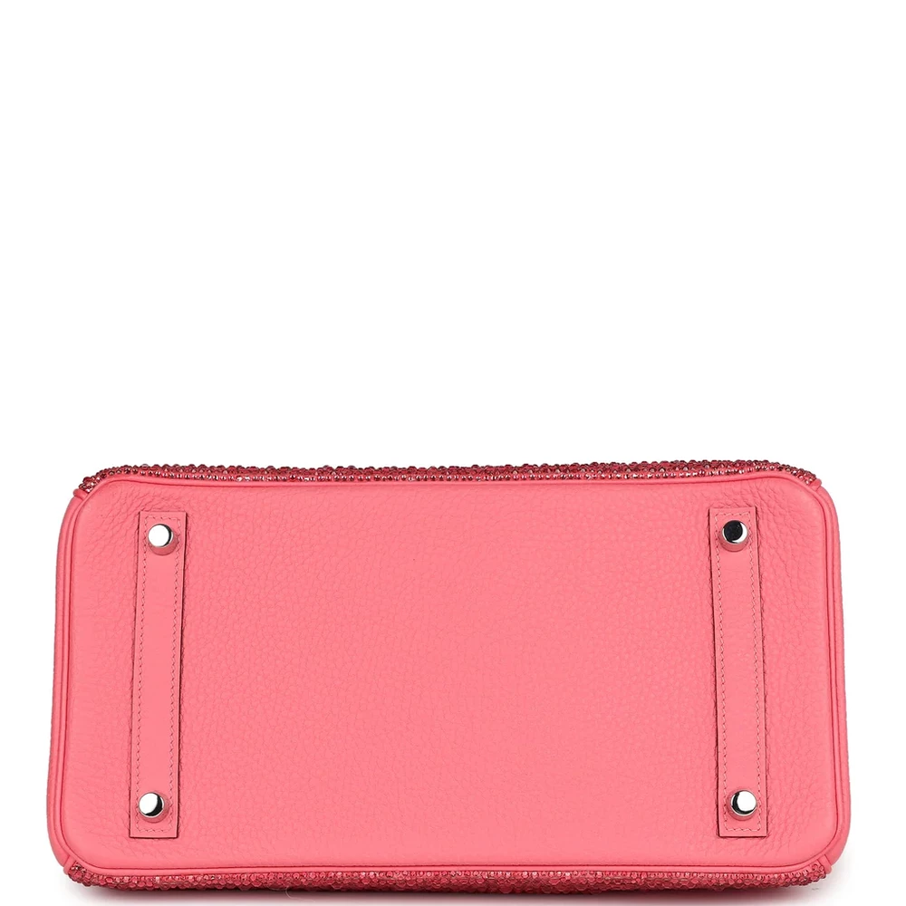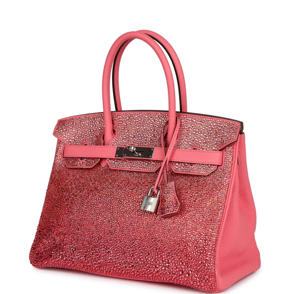 This Hermès Birkin is a customized Rose Azalee Clemence leather Birkin 30, with varying shades of pink Swarovski crystals hand-placed on the front, back, and flap of the bag, as well as the clochette, creating a stunning ombre effect. The bag features palladium hardware and tonal stitching, with a front flap, two straps, and a center toggle closure for secure fastening. The double rolled handles ensure comfort while carrying. The interior is lined with Rose Azalee Chevre leather, offering a luxurious feel. It includes one zip pocket with an Hermès engraved zipper pull and an open pocket on the opposite side for easy organization.