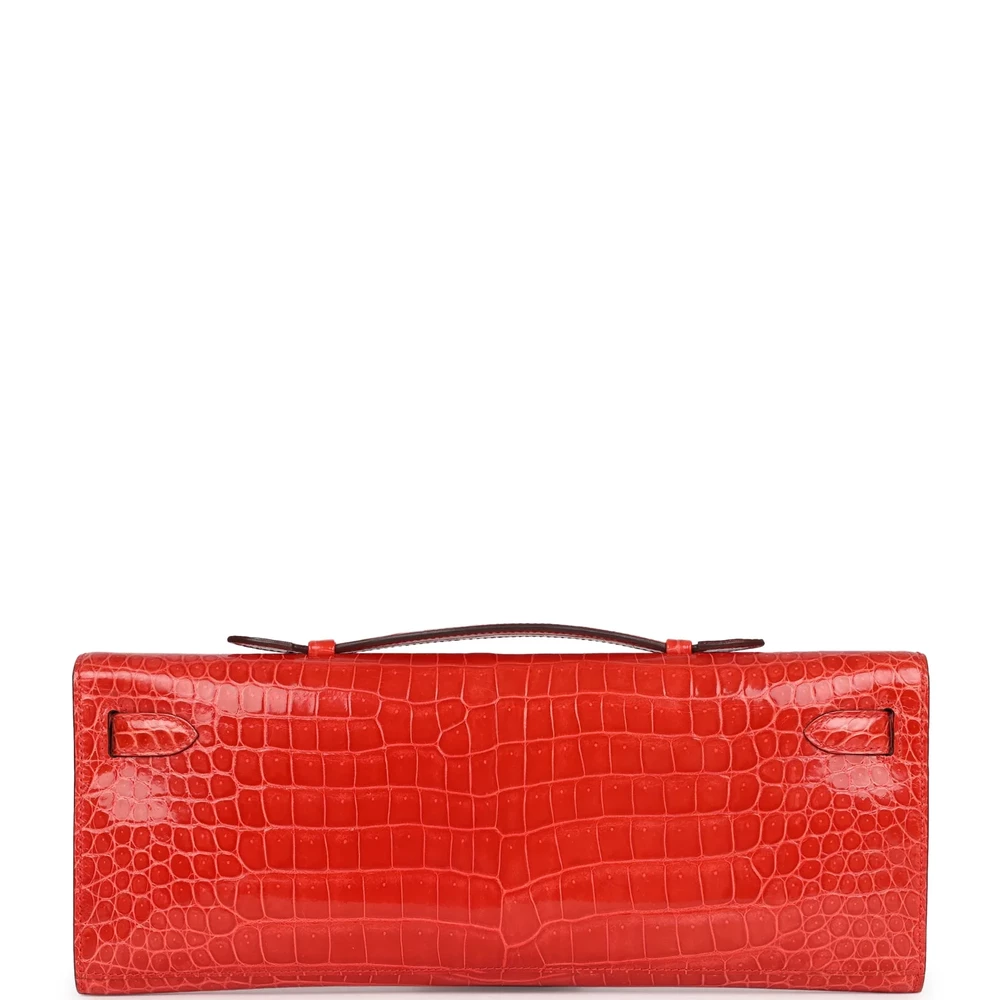 This Hermès Kelly Cut in Orange Poppy is a sleek and luxurious accessory. Crafted from Shiny Porosus Crocodile leather, it exudes opulence. The Gold hardware adds a glamorous touch. Its vibrant orange hue is perfect for making a bold statement. The compact design ensures versatility. A must-have for those who appreciate minimalist sophistication. This bag is a true statement of understated luxury.