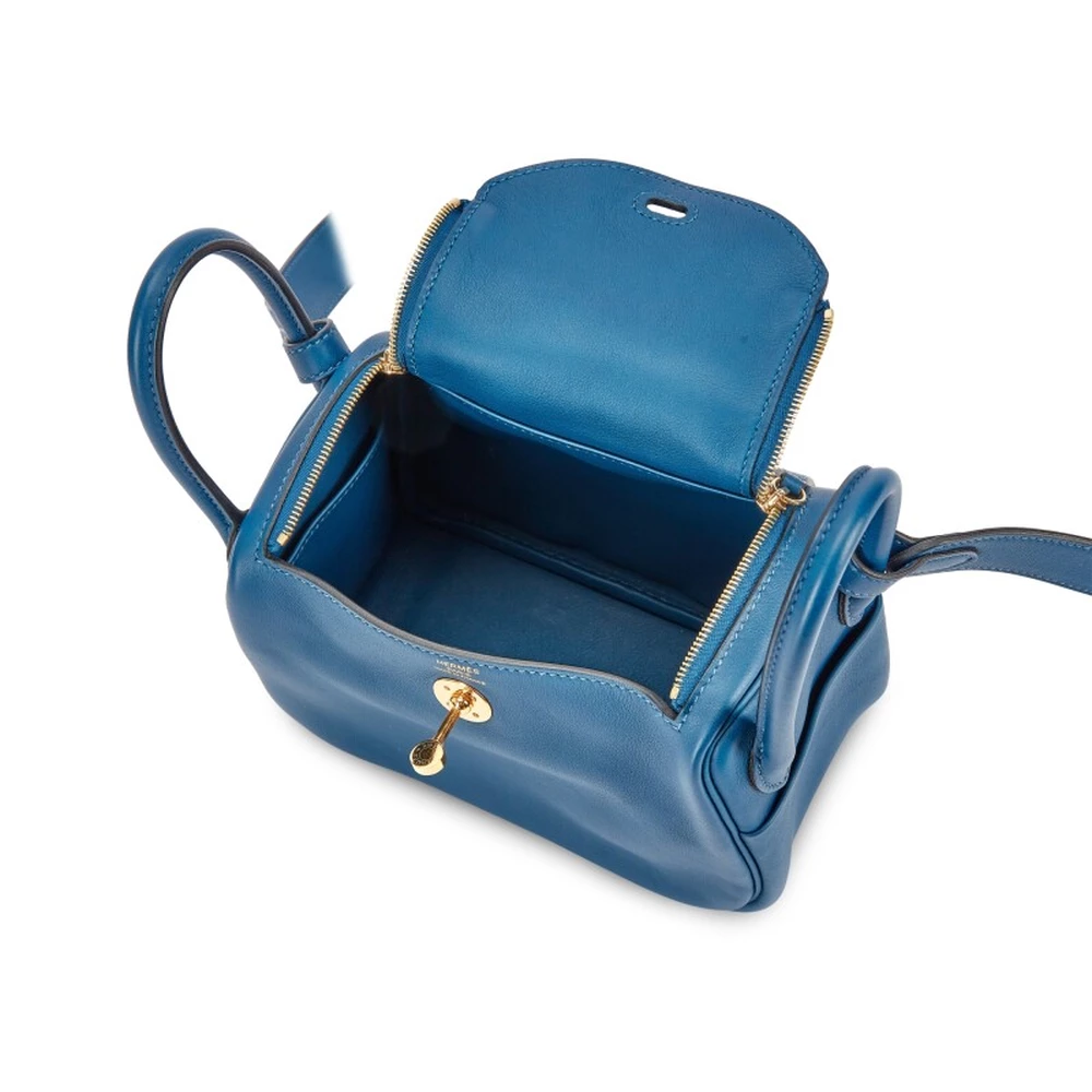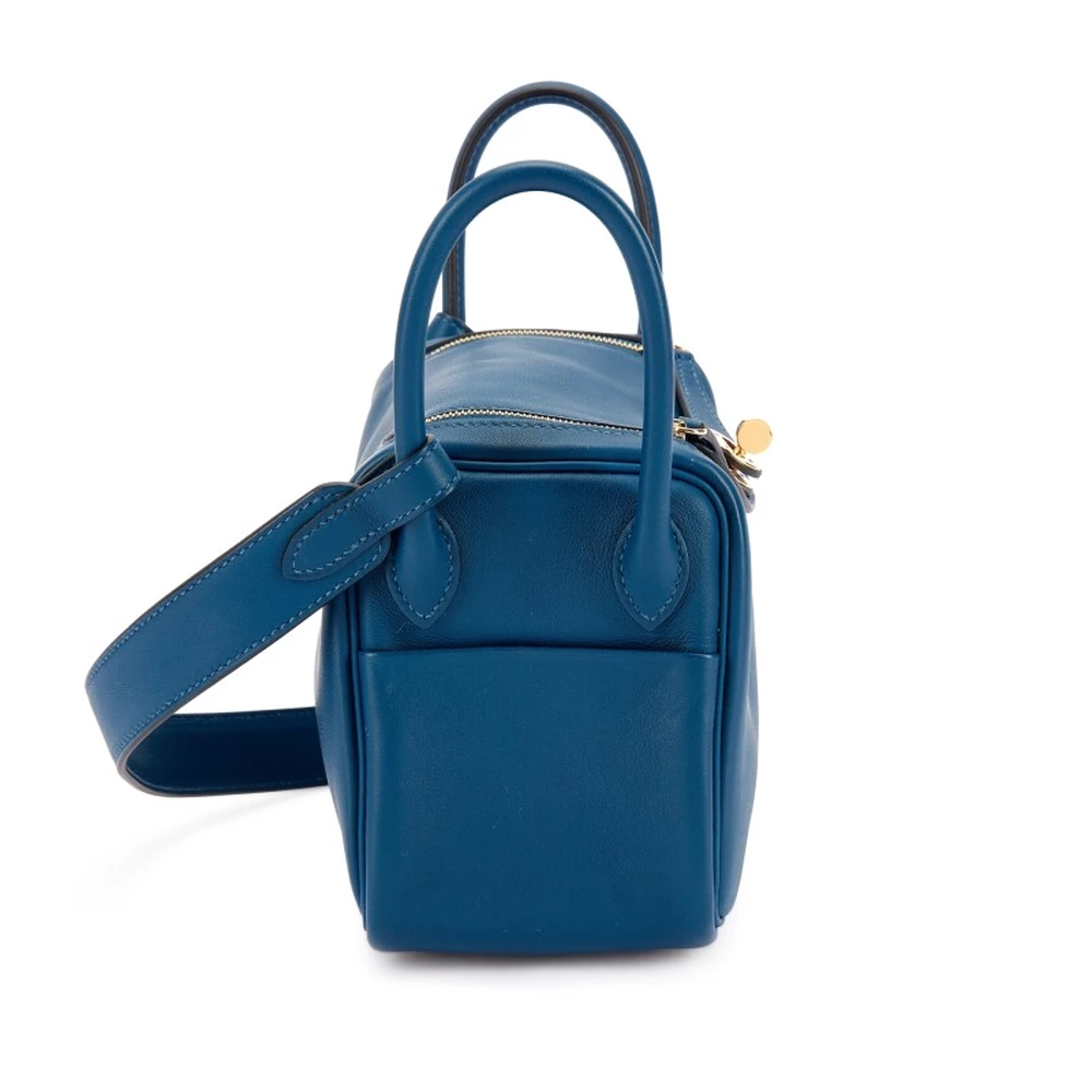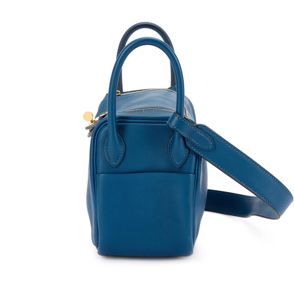 This Hermès Deep Blue Swift Mini Lindy 20 with Gold Hardware is a sleek and modern handbag in a rich navy tone. The smooth Swift leather gives it a polished finish, while the gold hardware adds an elegant contrast. Its compact size makes it a refined and versatile everyday option.