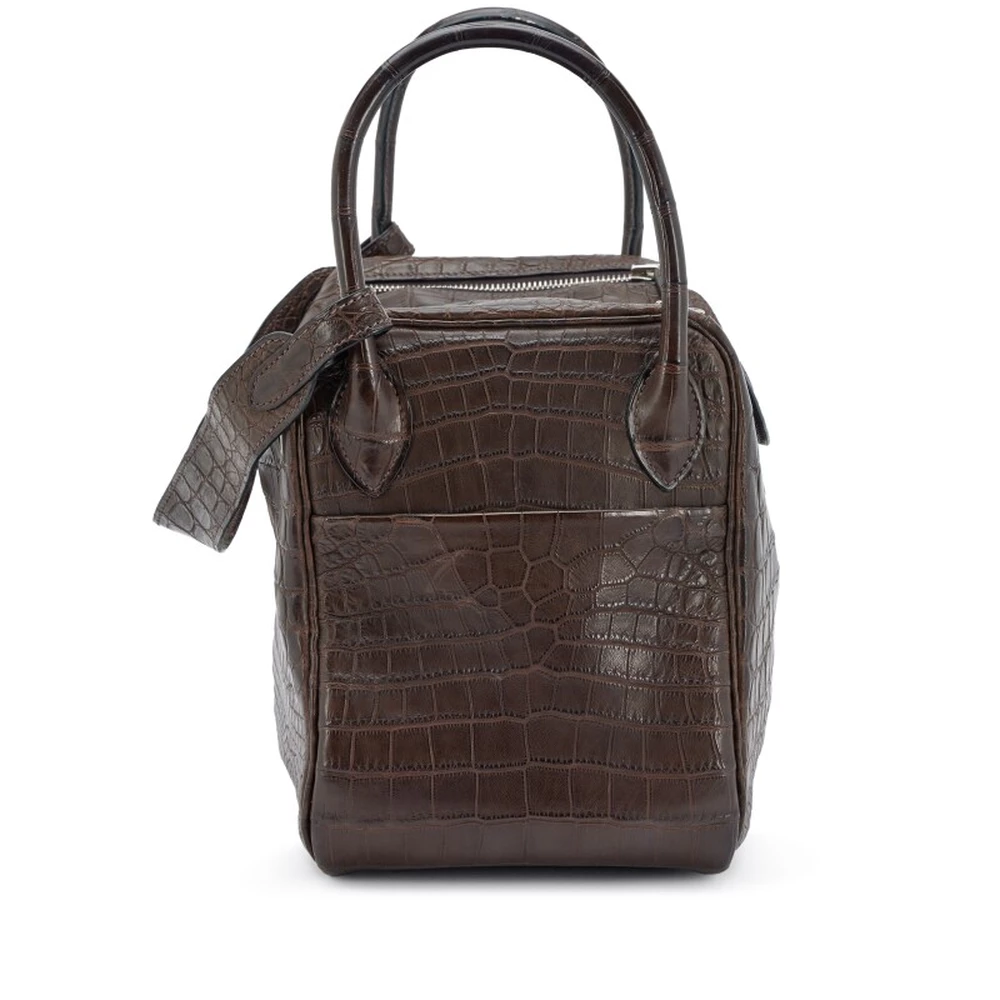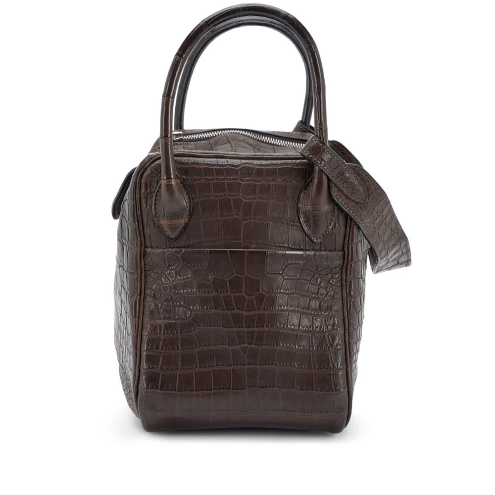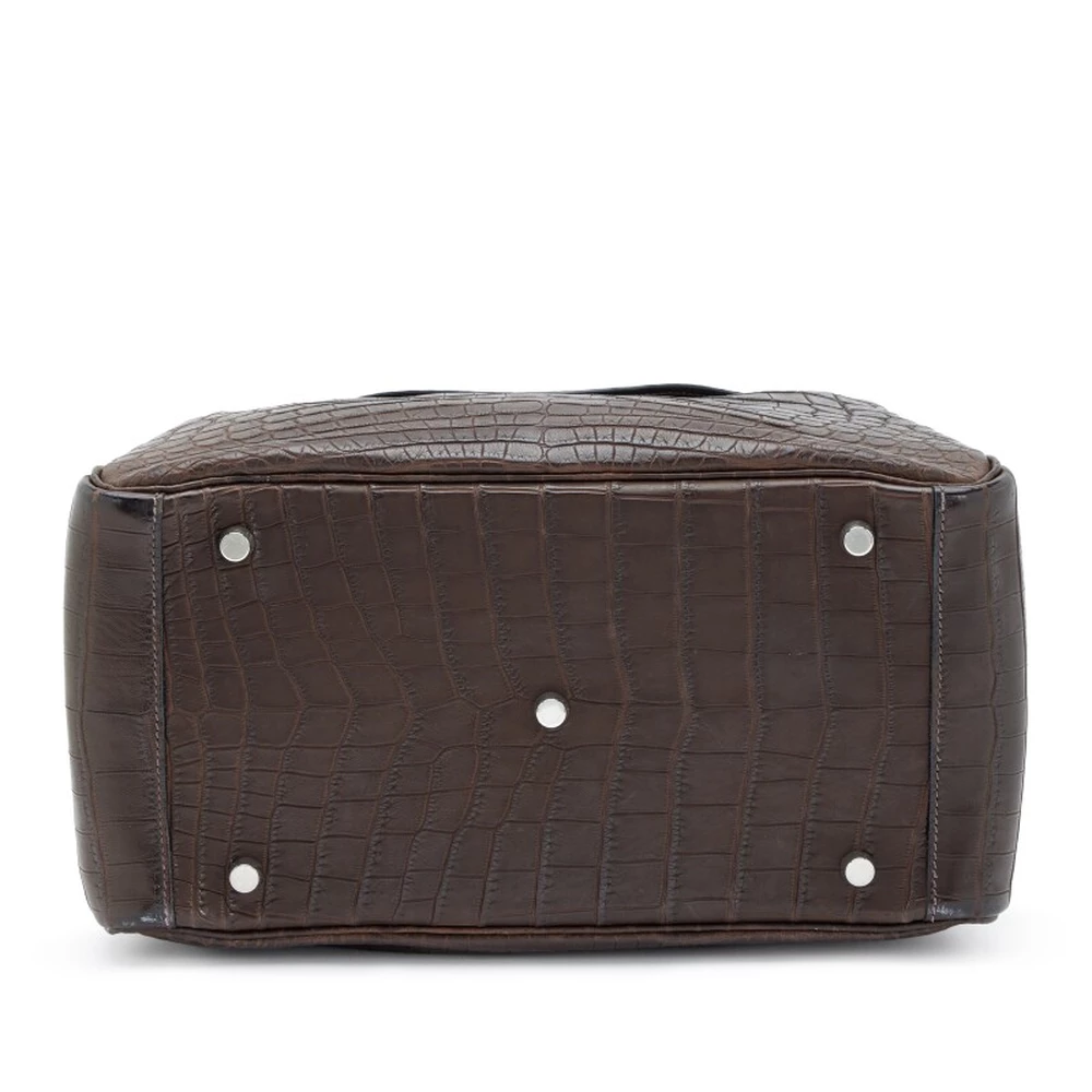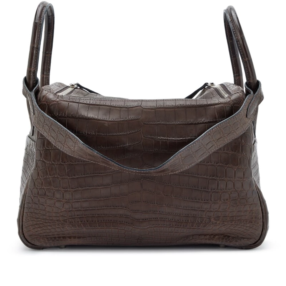 This Hermès Chocolat Matte Niloticus Crocodile Lindy 30 with Palladium Hardware is a rare and opulent handbag in a deep brown shade. The exotic Niloticus crocodile leather adds texture and luxury, while the palladium hardware provides a contemporary touch. Its elegant structure makes it an extraordinary investment piece.