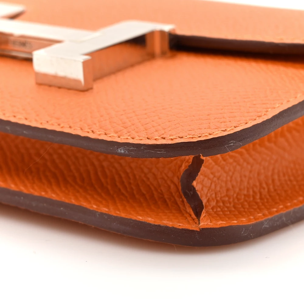 This Hermès Epsom Constance Slim Wallet in Orange is a bold and practical statement piece. The vibrant orange hue complements the structured Epsom leather, offering both durability and a striking aesthetic. Featuring the signature Constance H clasp, it provides secure storage with a touch of luxury. A perfect blend of functionality and style.