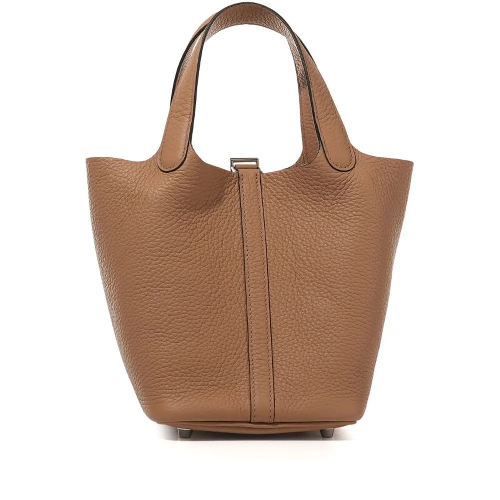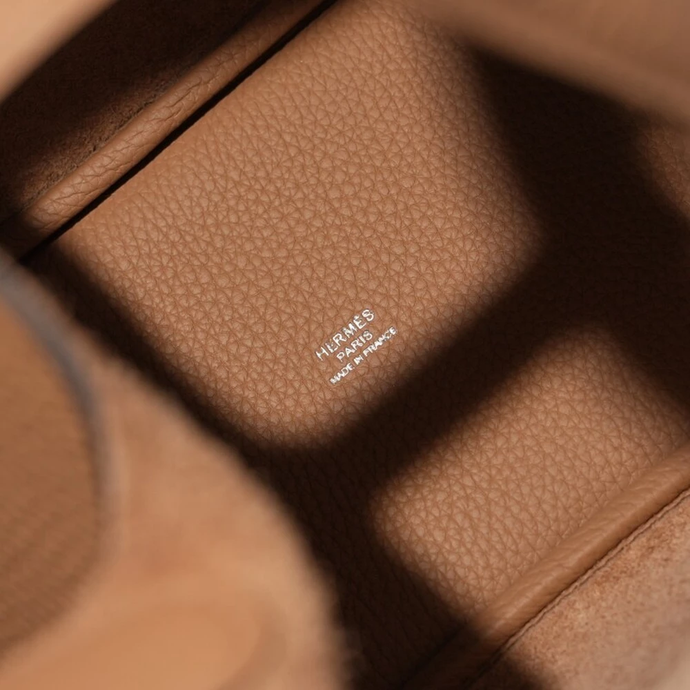 This Hermès Chai Clemence Picotin Lock 18 is a refined and warm-toned handbag in a soft beige-brown shade. The Clemence leather’s slouchy texture gives it a relaxed yet elegant feel. The Picotin Lock 18’s minimalist bucket shape offers practicality and style. Palladium hardware provides a contemporary contrast, enhancing its neutral aesthetic. This Picotin is a sophisticated everyday luxury.