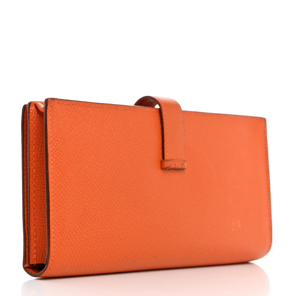 This Hermès Béarn Gusset Wallet in Orange is a vibrant and practical statement piece. Crafted from Epsom leather, its structured grain enhances both durability and elegance. The classic “H” clasp in palladium-plated hardware provides a distinguished touch, while the gusseted interior offers ample space for essentials. A luxurious choice for those who appreciate timeless sophistication.