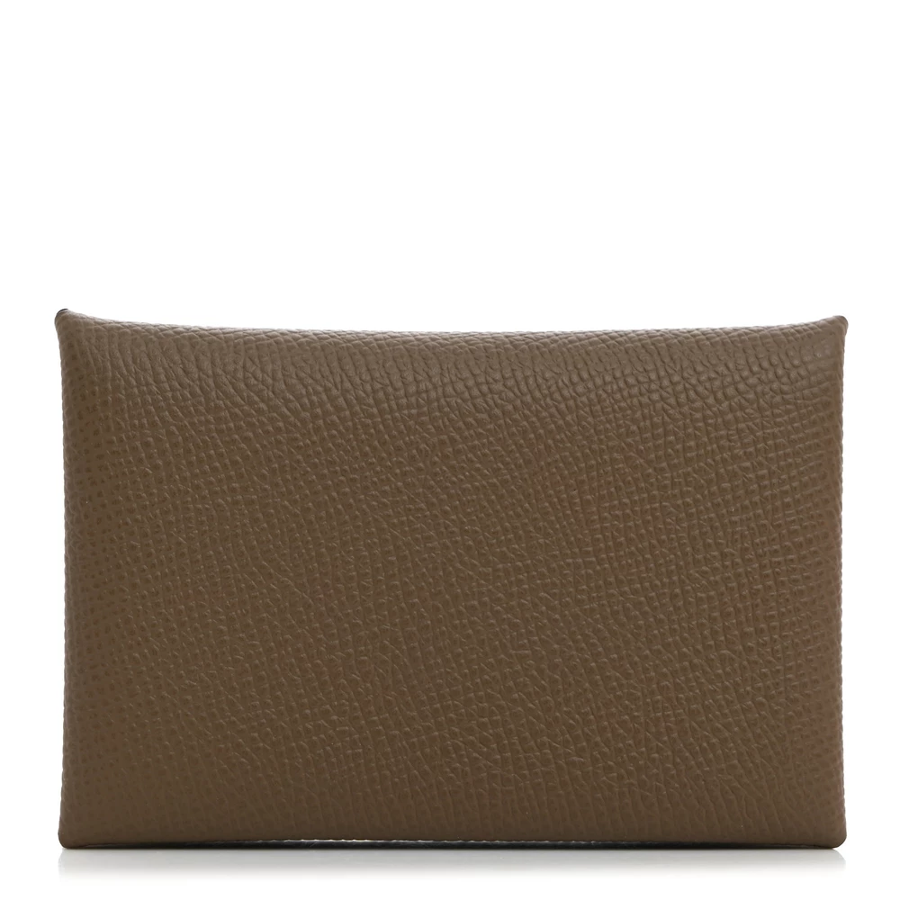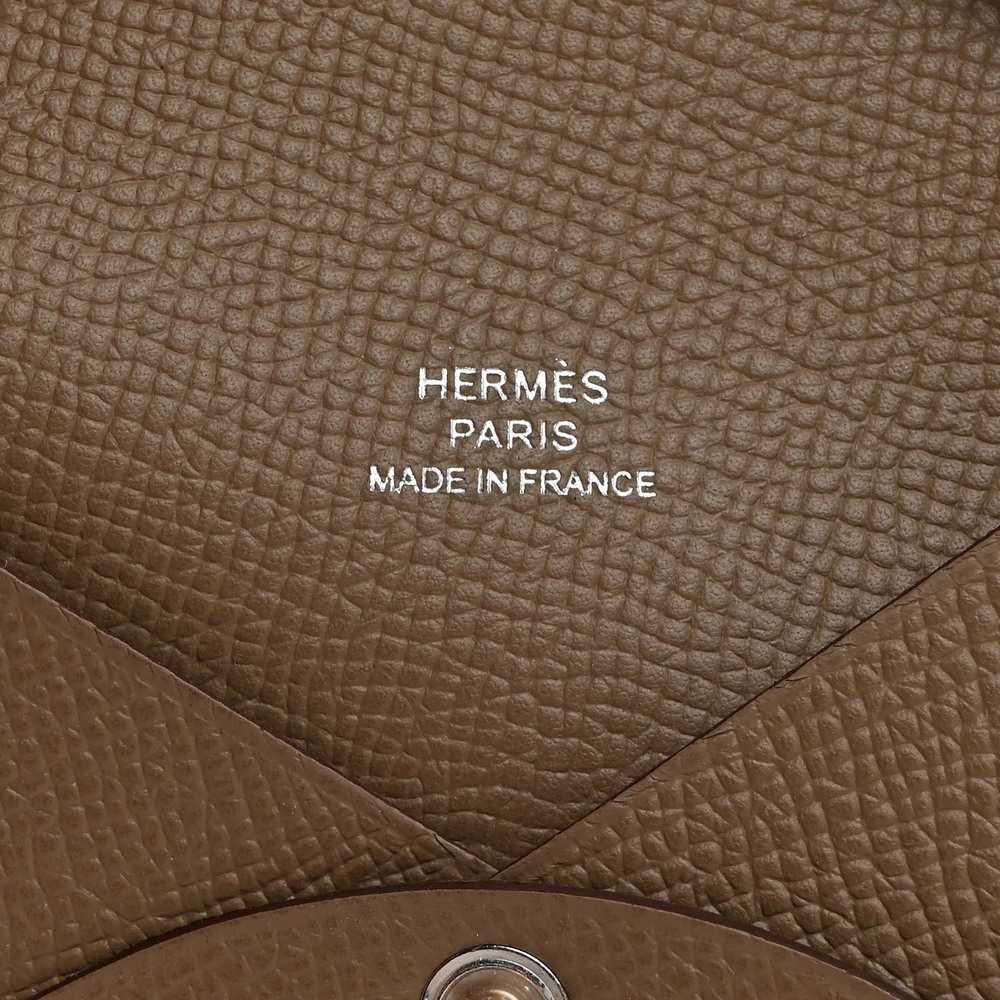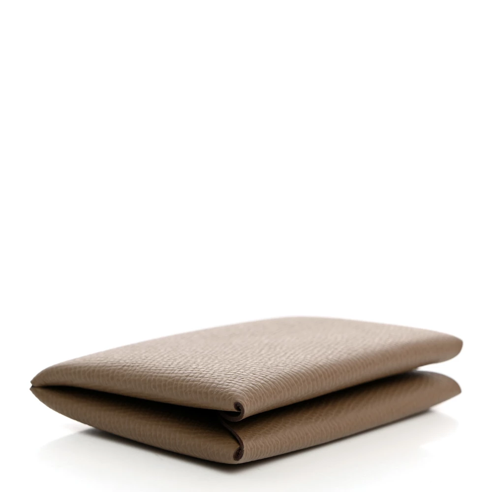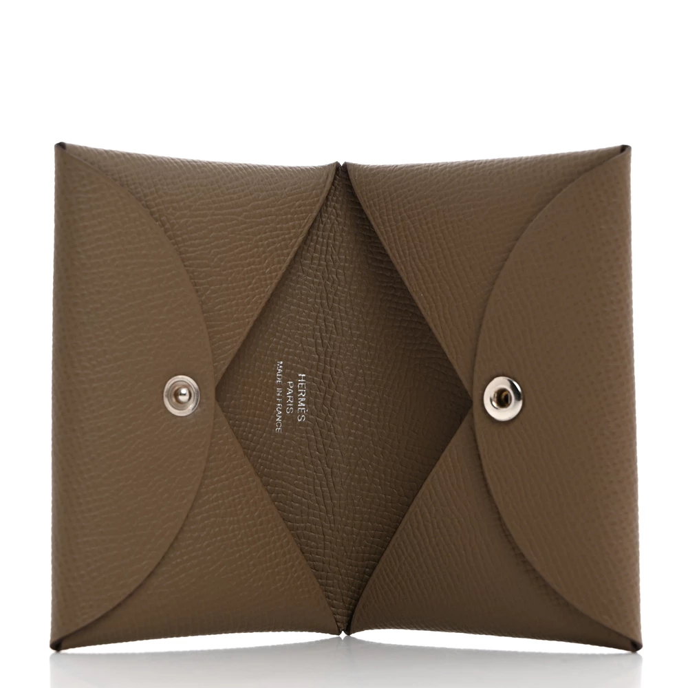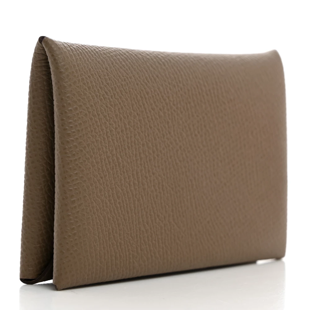 This Hermès Epsom Calvi Card Case in Etoupe is a sophisticated essential, crafted from richly grained Epsom calfskin leather in an elegant beige hue. The minimalist design opens with a snap closure to reveal an origami-style folded pocket and a flap pocket on either side, offering a sleek and practical solution for carrying cards or small essentials. Compact yet refined, this card case exemplifies Hermès’ dedication to craftsmanship and understated luxury.