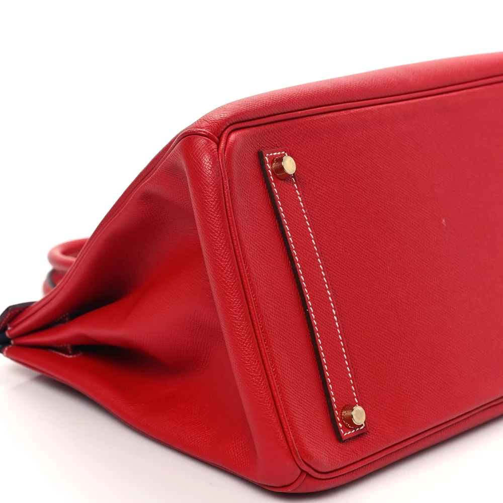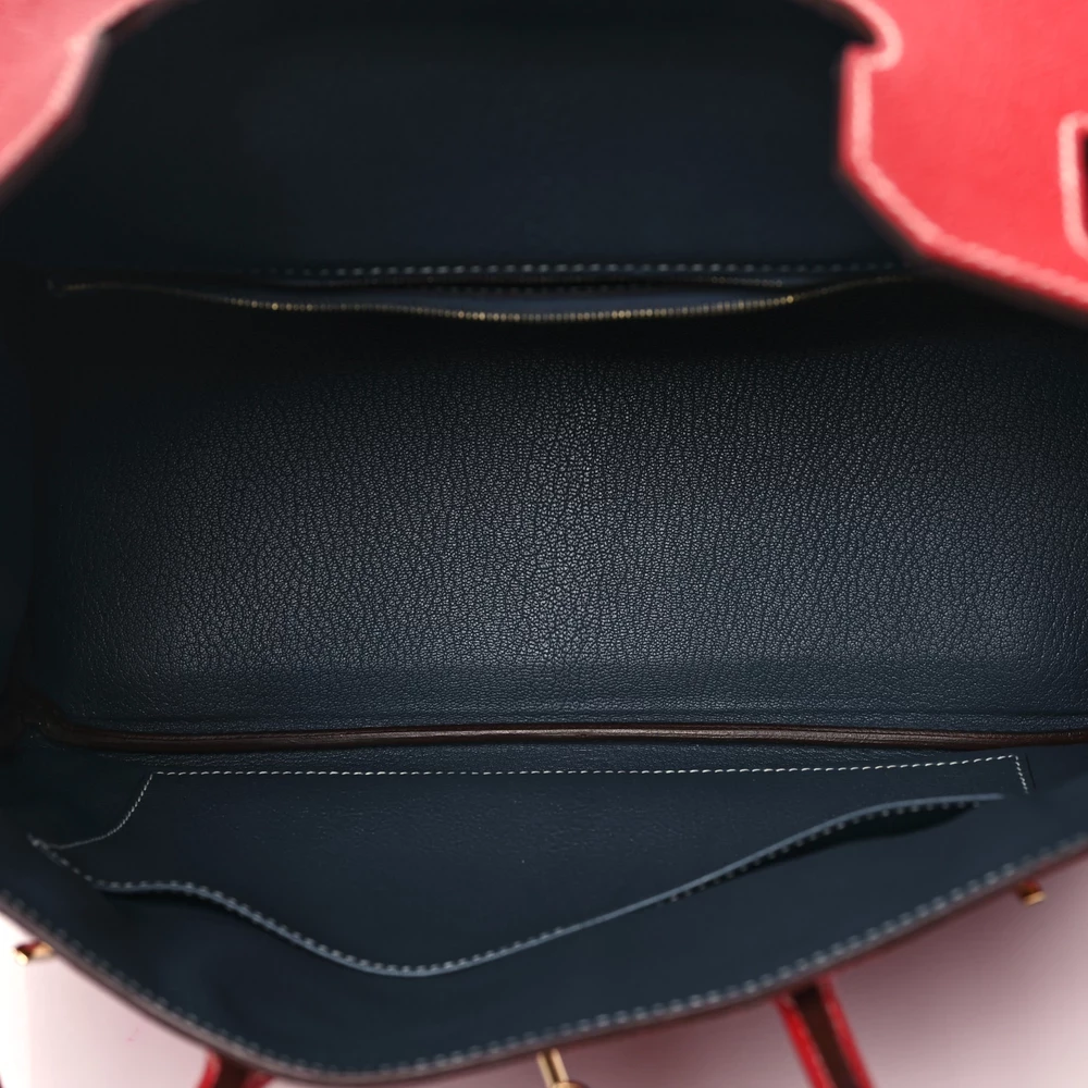 This Hermès Epsom Candy Birkin 35 in Rouge Casaque & Bleu Thalassa is a striking two-tone handbag from the rare Candy Collection. The exterior features a bold red shade, while the interior is lined with deep blue, creating an eye-catching contrast. The Epsom leather provides a structured shape with excellent resilience. Measuring 35 cm, this Birkin offers both practicality and a statement look. Palladium hardware completes the contemporary aesthetic of this vibrant collector’s piece.