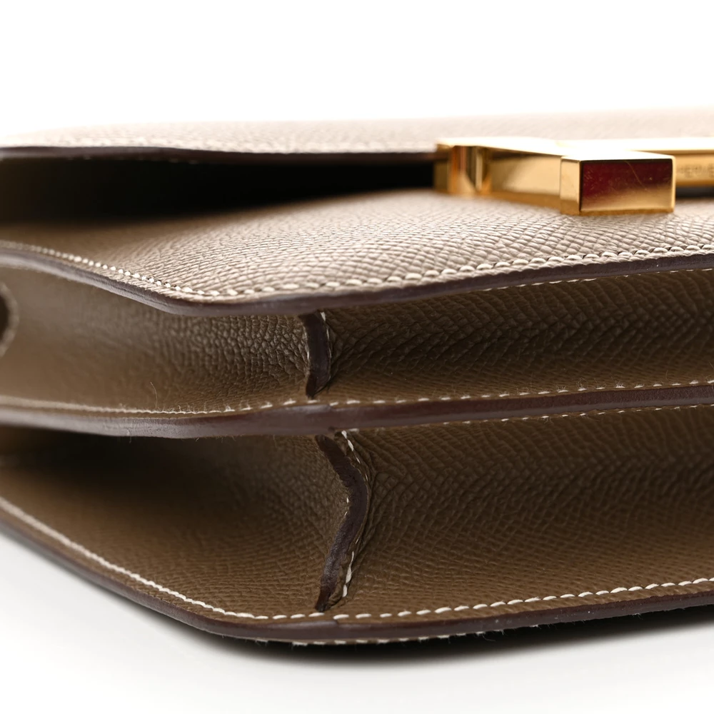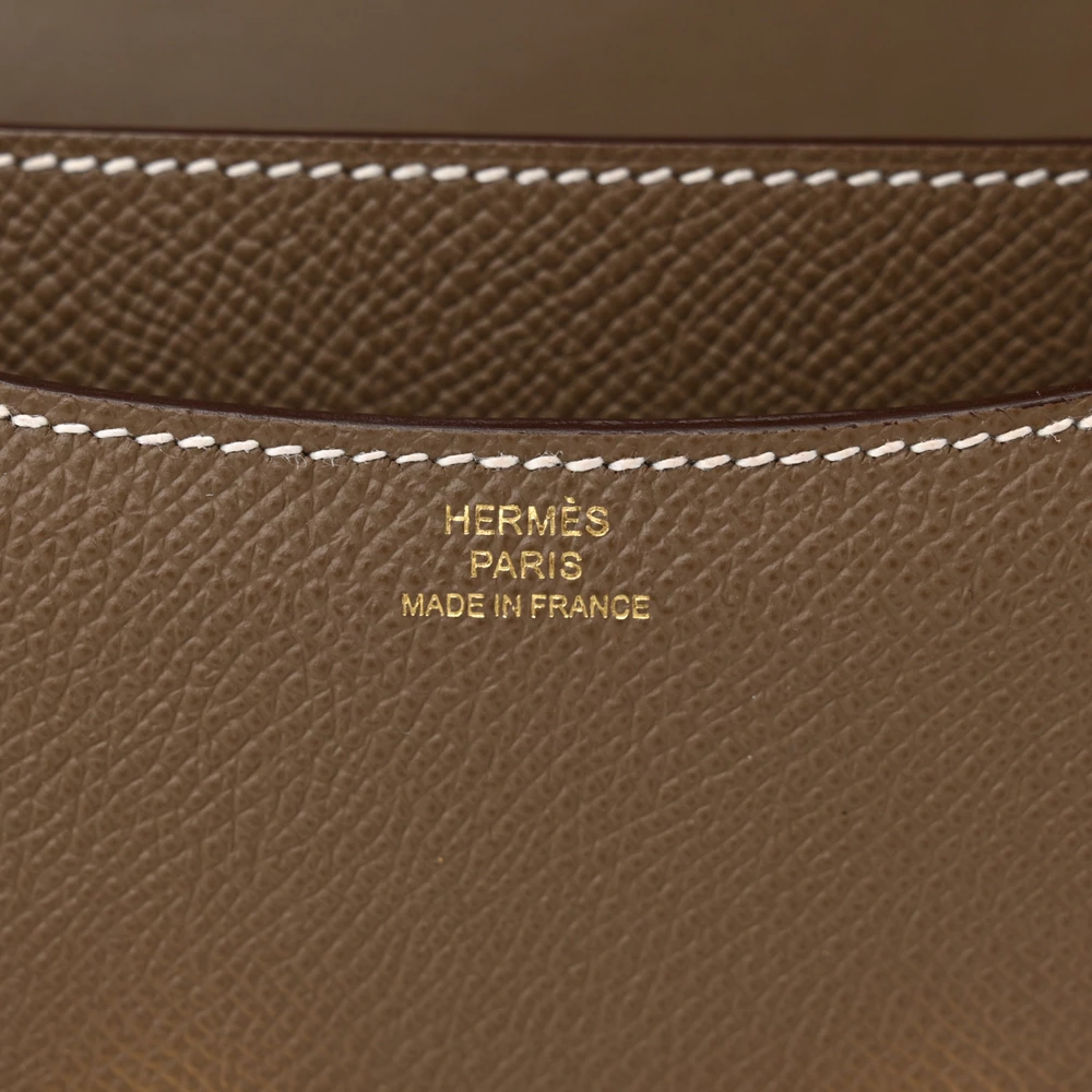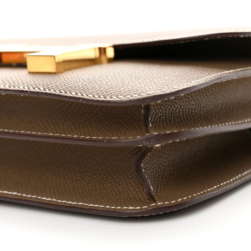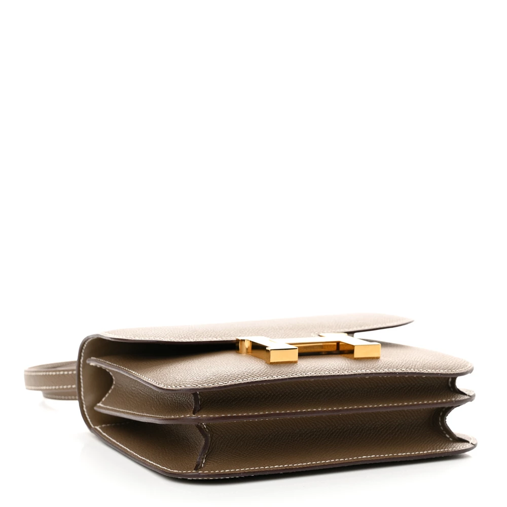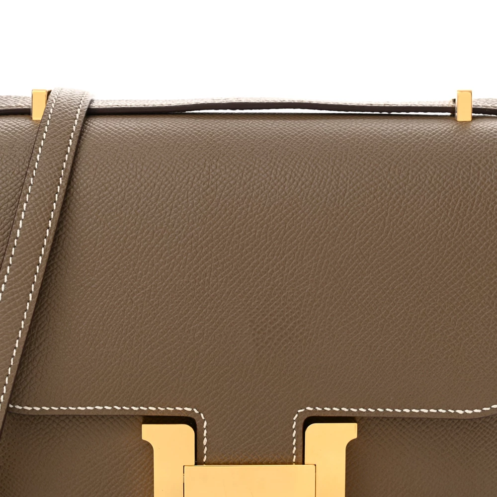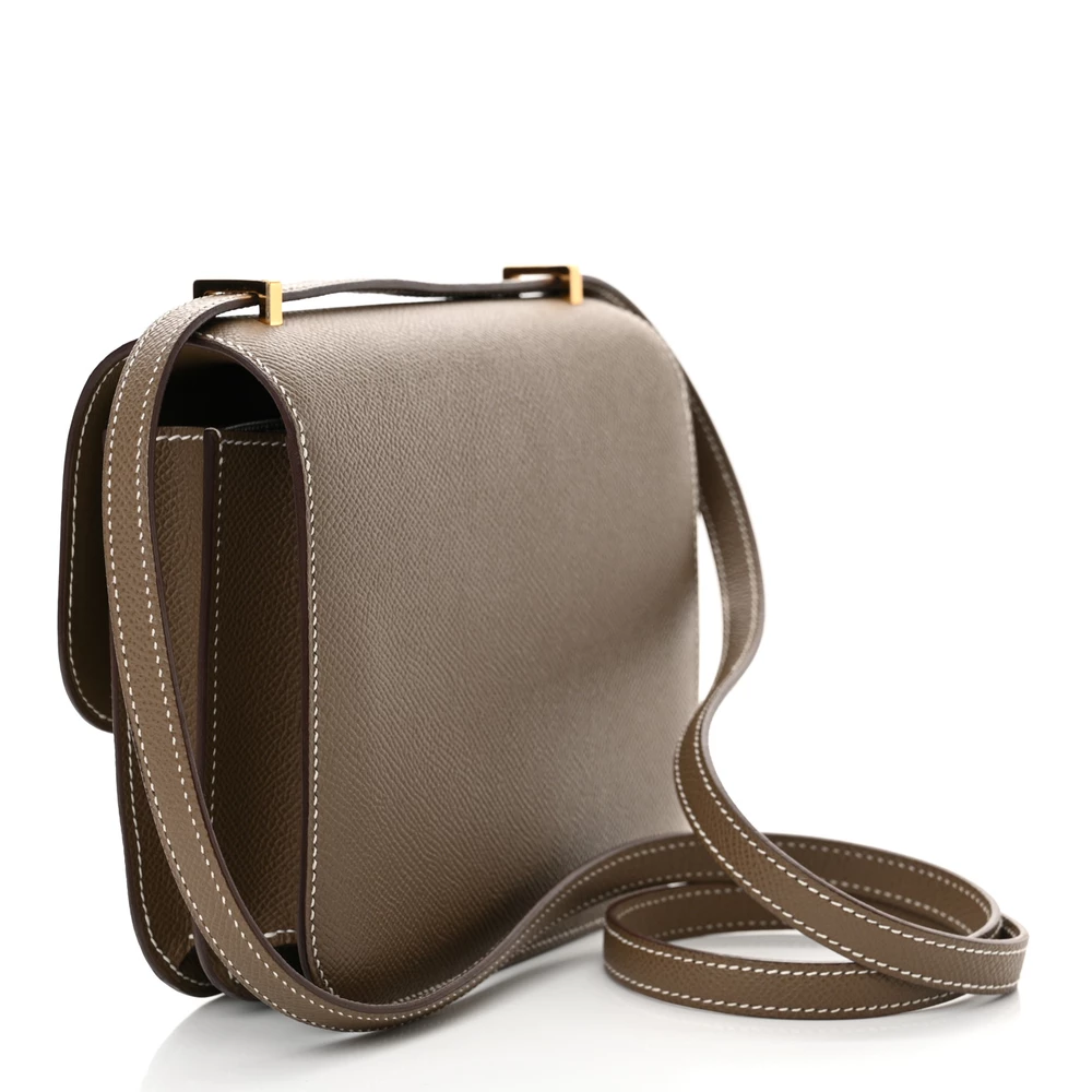This Hermès Epsom Constance 18 Etoupe is a refined and neutral handbag in a classic taupe shade. The Epsom leather ensures a structured, scratch-resistant finish, maintaining its crisp silhouette. The compact 18cm size makes it a versatile and sophisticated choice. Palladium hardware adds a modern and polished touch. This Constance is an elegant and timeless wardrobe staple.