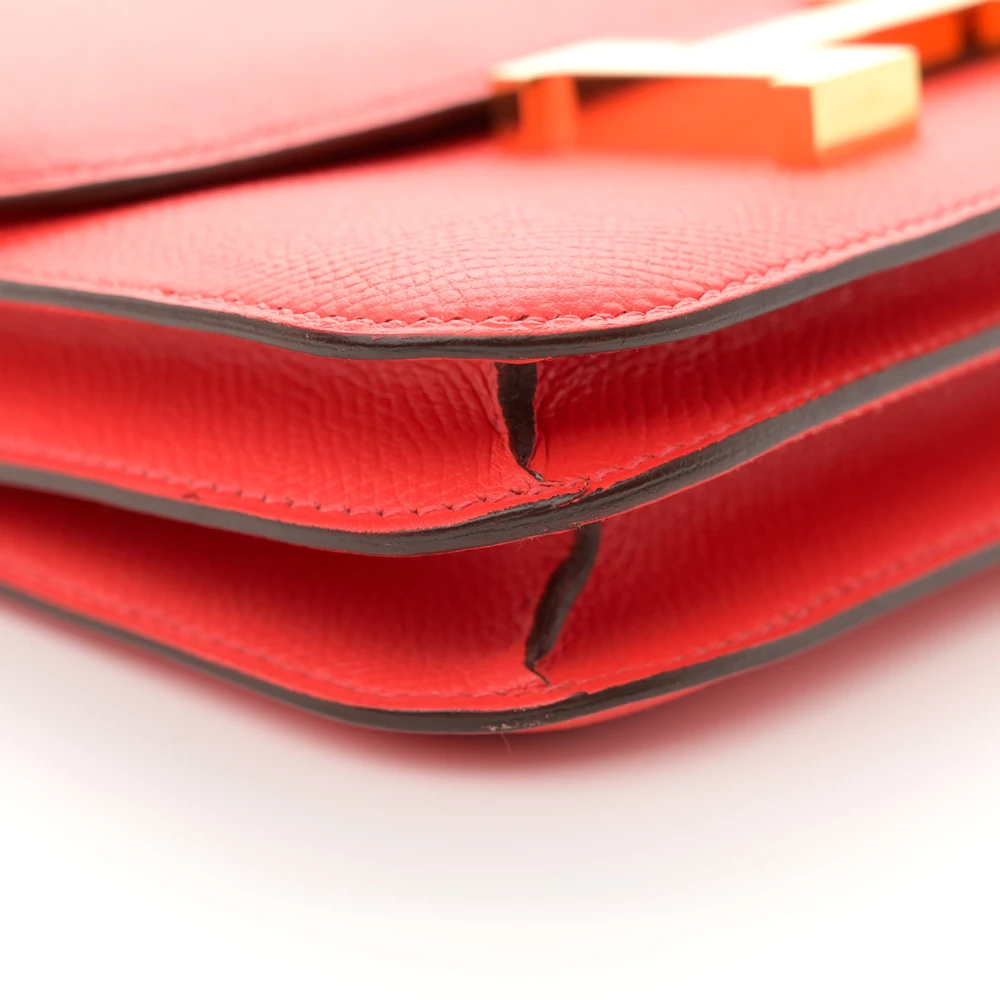 This Hermès Epsom Constance 18 Rose Jaipur is a lively and elegant handbag in a warm coral-pink shade. The Epsom leather provides a structured and scratch-resistant finish, ensuring durability while maintaining its sleek shape. The compact 18cm size makes it a versatile companion for any occasion. Gold hardware enhances its refined and sophisticated aesthetic. This Constance is a vibrant and timeless luxury statement.