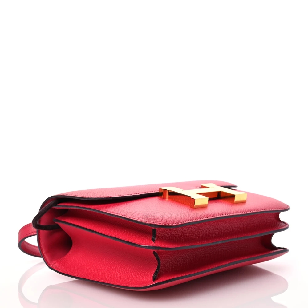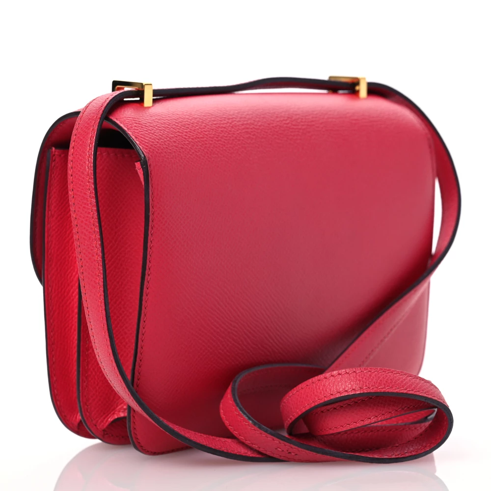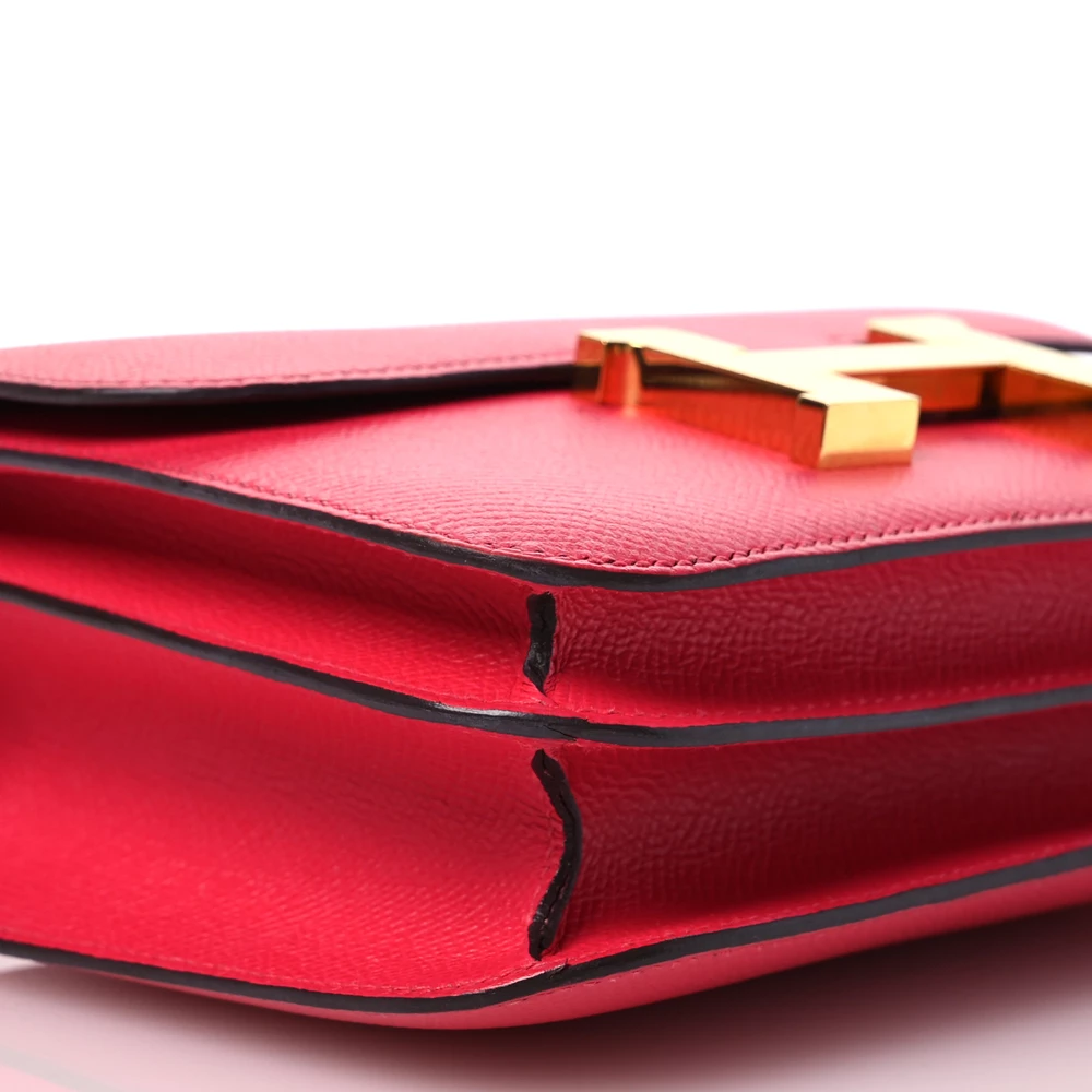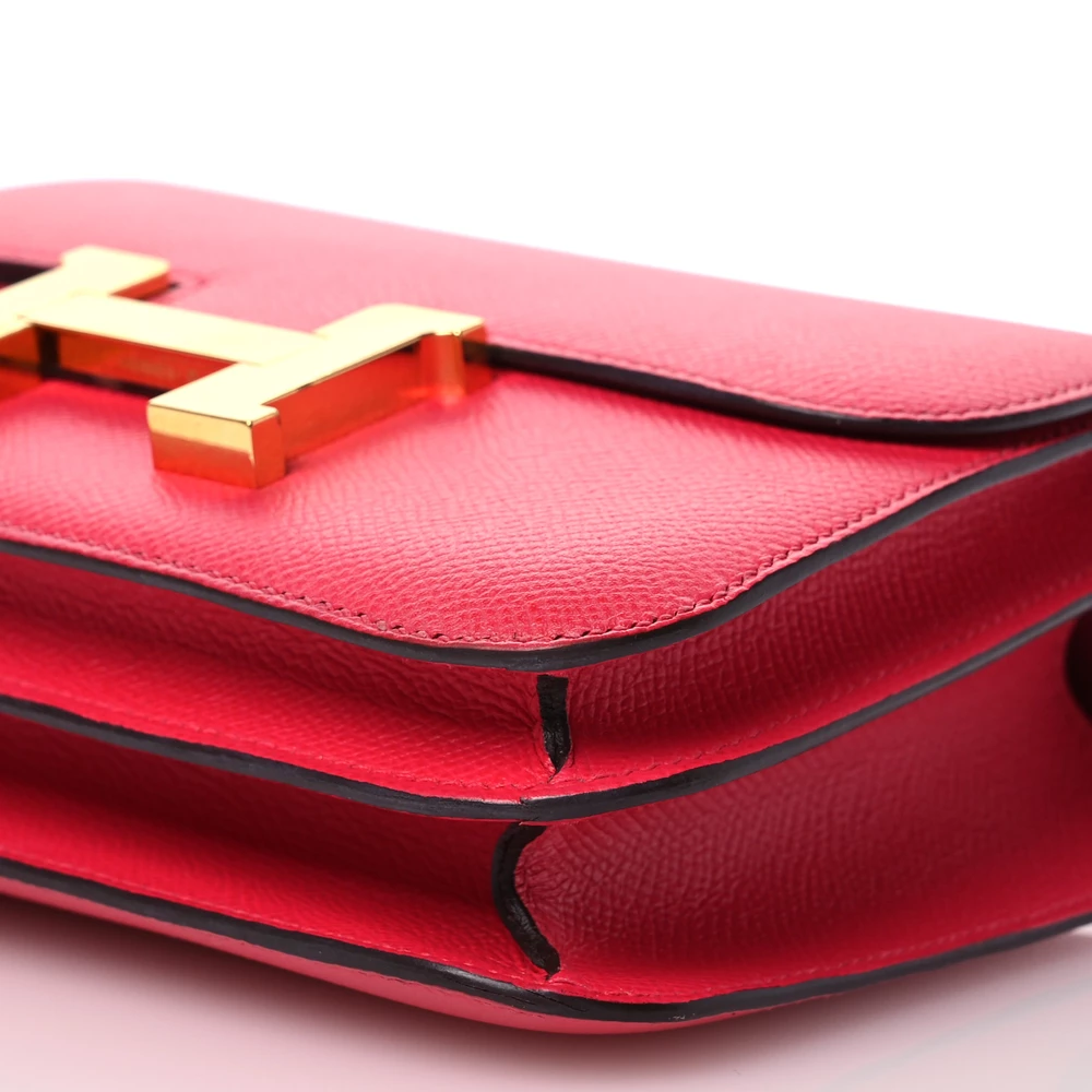 This Hermès Epsom Constance 18 Rouge de Cœur is a striking and passionate handbag in a rich red shade. The Epsom leather maintains a crisp and structured silhouette, offering both durability and elegance. The compact 18cm size makes it a versatile statement piece. Palladium hardware adds a modern and polished touch. This Constance is a timeless symbol of sophistication and confidence.