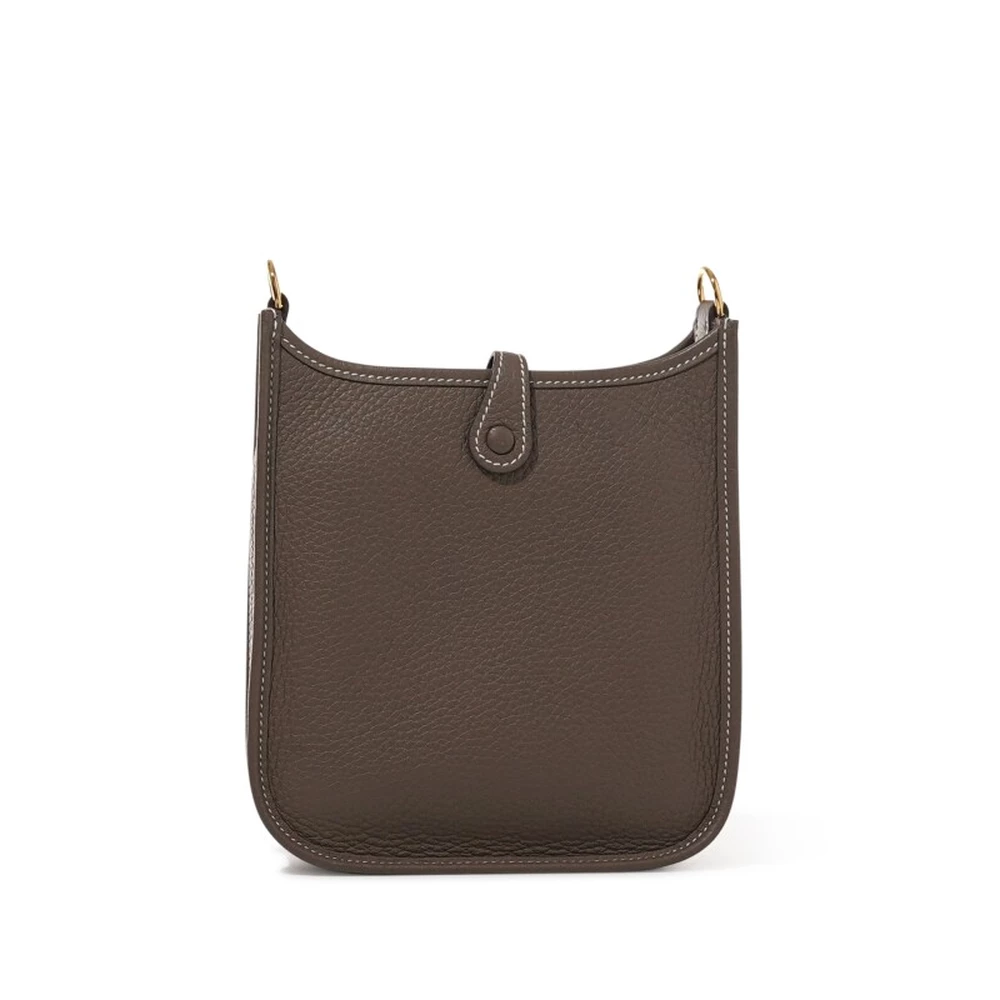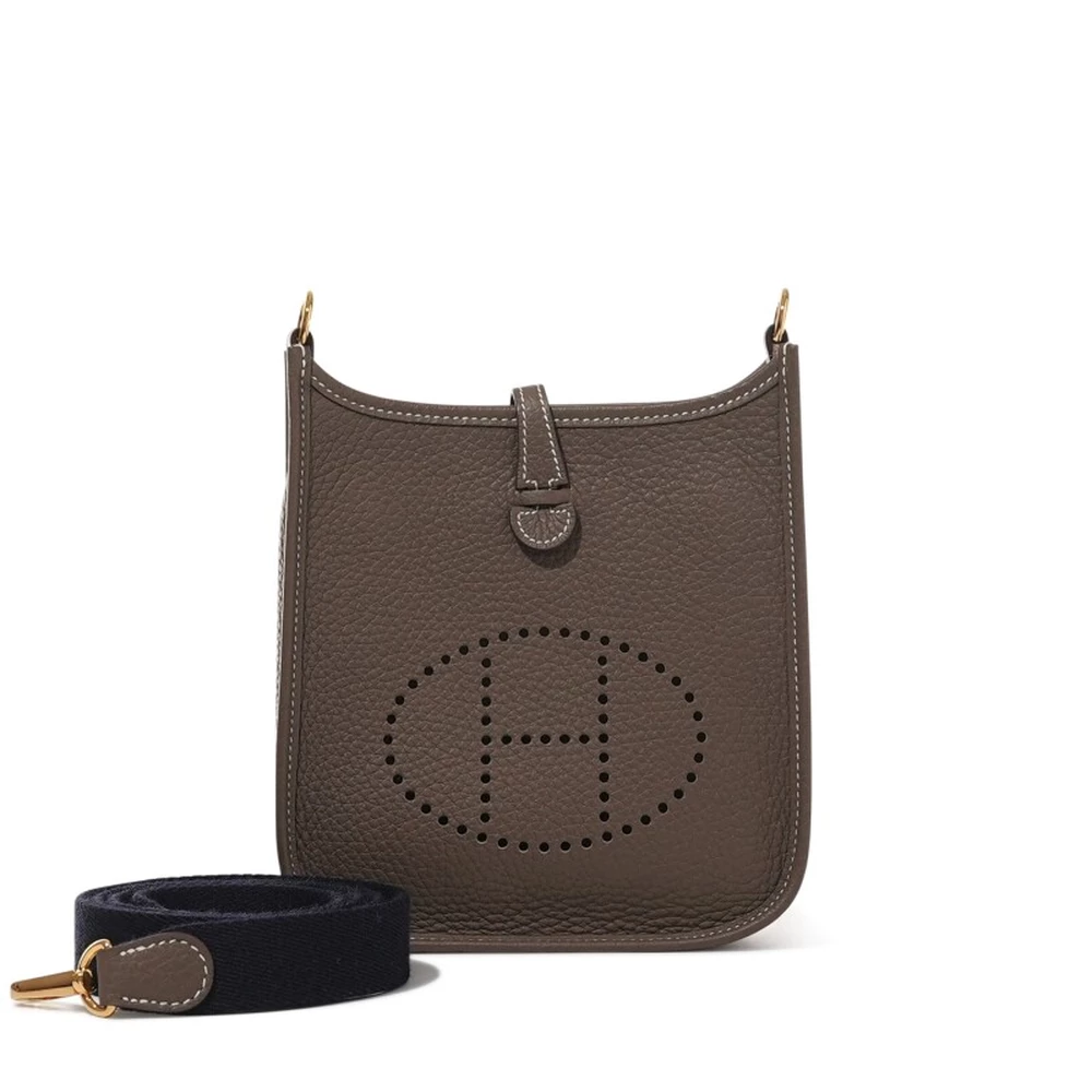 This Hermès Etoupe Clémence Mini Evelyne II TPM 16 with Gold Hardware is a timeless and versatile crossbody bag in one of Hermès’ most sought-after colors. The taupe Etoupe shade is complemented by contrast white stitching and gold hardware, creating an elegant yet understated look. The perforated “H” logo and adjustable strap make it a practical luxury accessory.