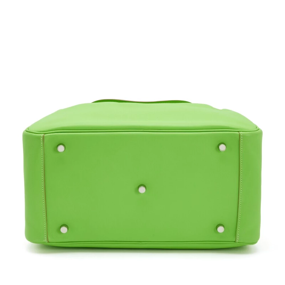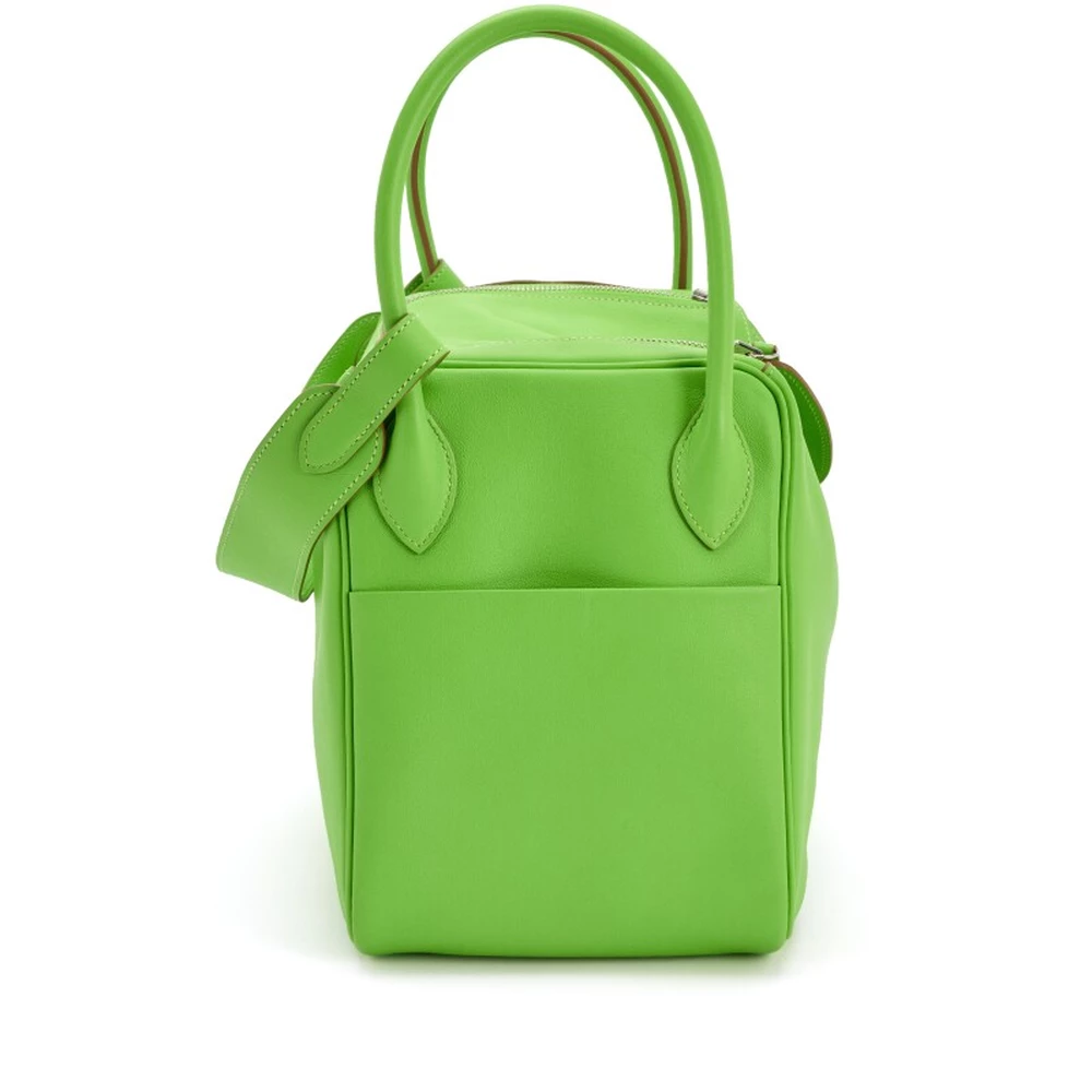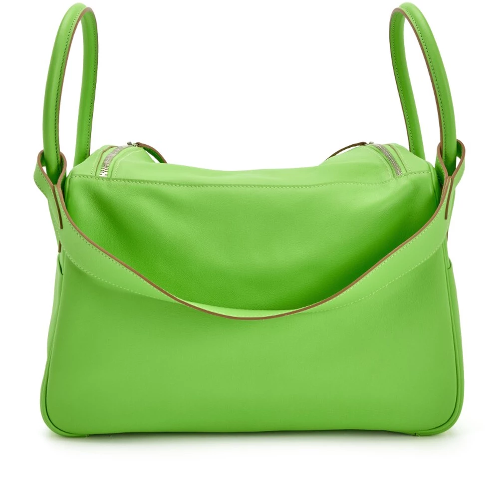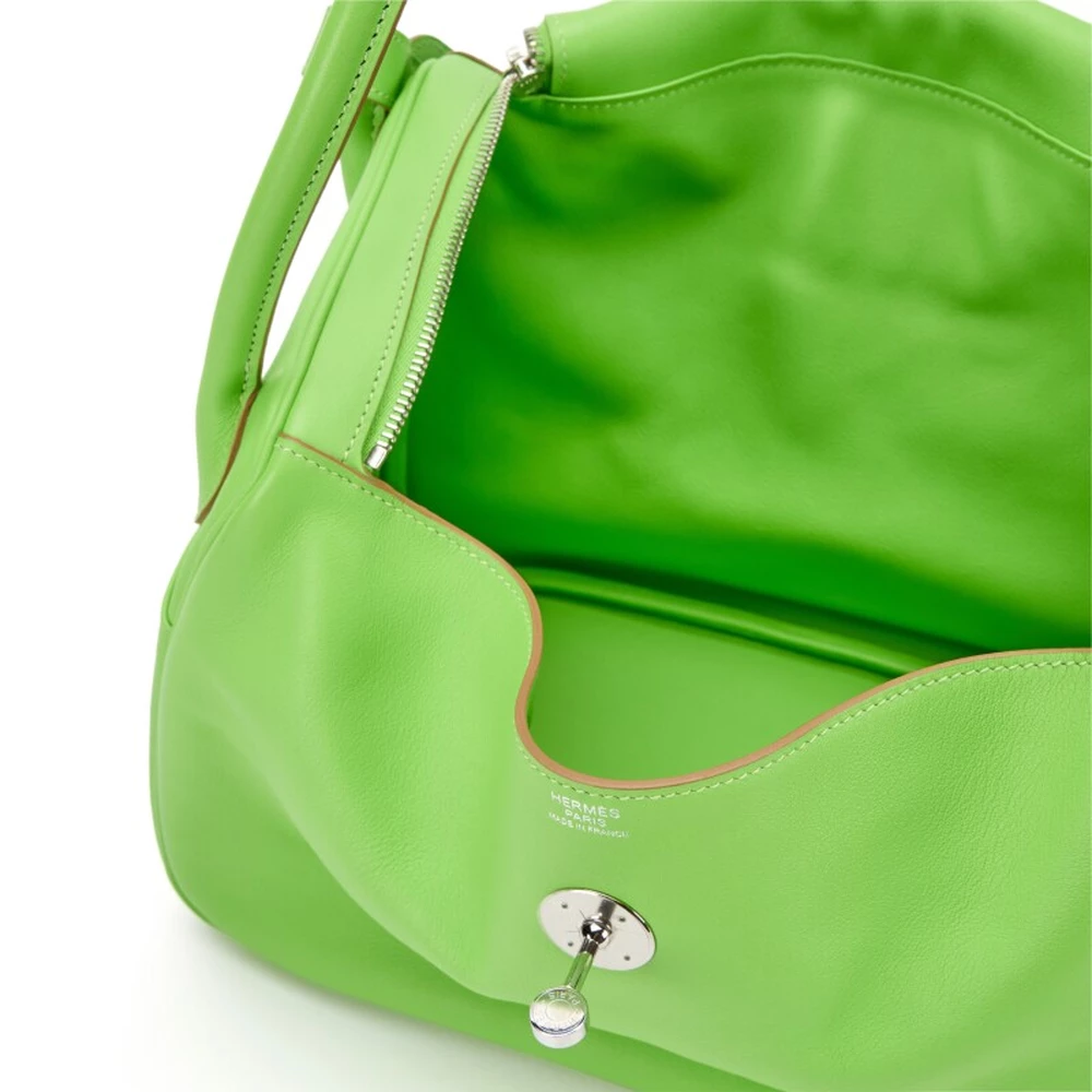 This Hermès Granny Green Swift Lindy 34 with Palladium Hardware is a striking and unique handbag in a bright green shade. The smooth Swift leather enhances its contemporary aesthetic, while the palladium hardware keeps the look refined. Its oversized design makes it both stylish and practical.