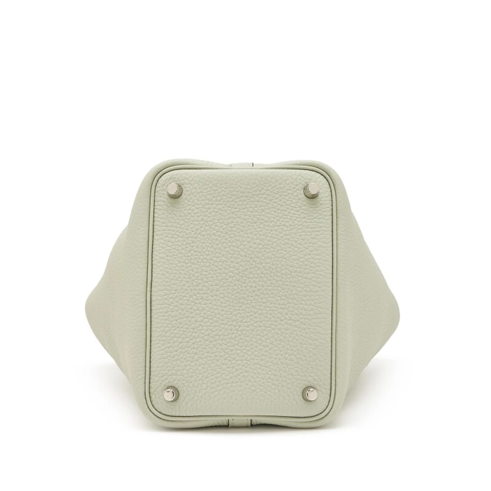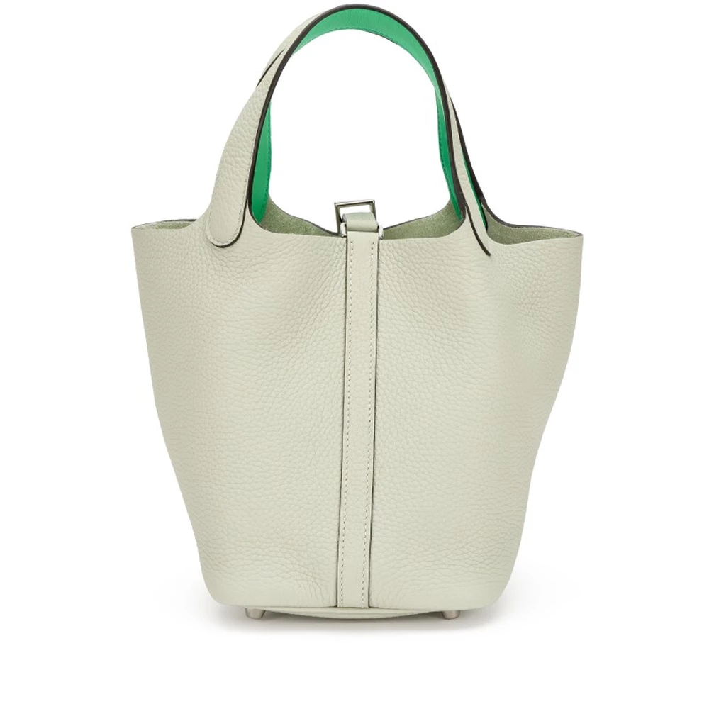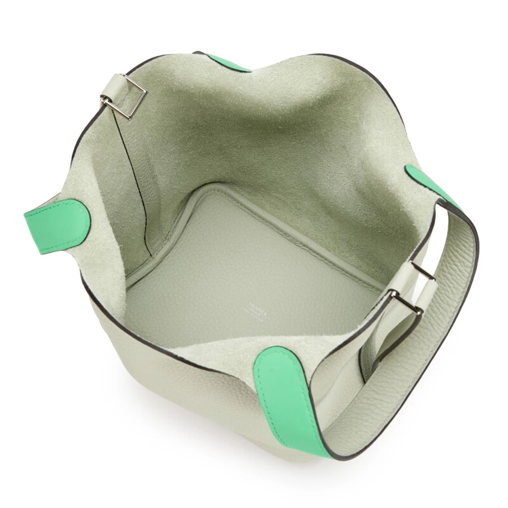 This Hermès Gris Neve Clémence and Vert Comics Swift Picotin Lock 18 with Palladium Hardware is a rare and playful handbag with a mix of soft gray and vibrant green leather. The contrast between Clémence and Swift leather adds depth to the design, while the palladium hardware enhances its contemporary appeal. This Picotin is a stylish and artistic piece for those who love color contrasts.