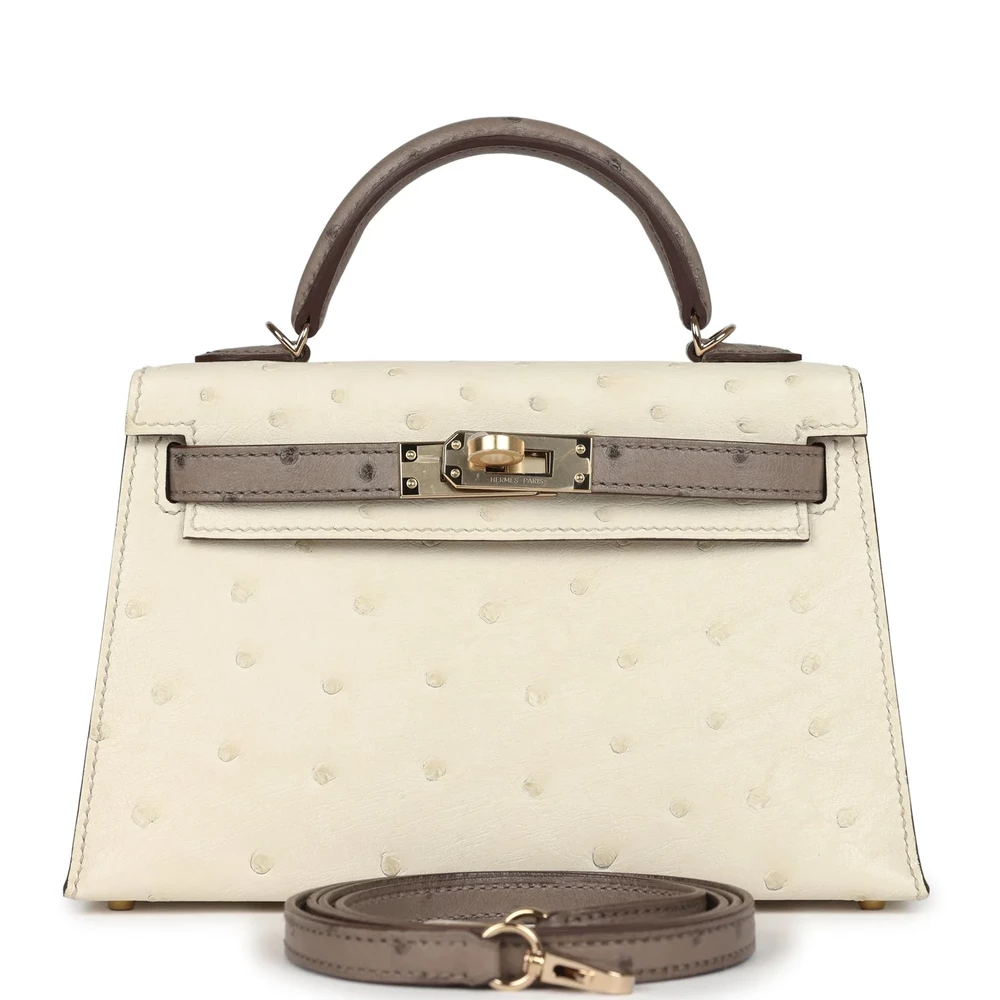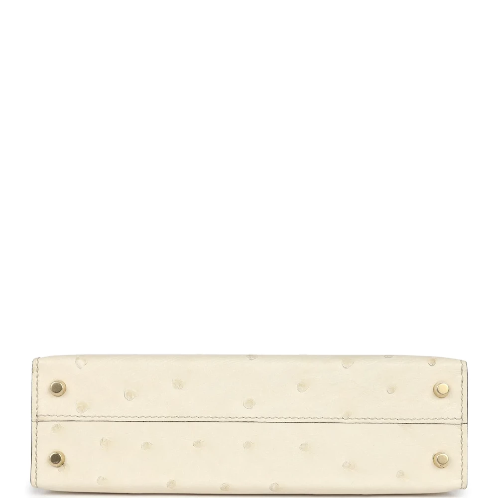 This Hermès special order Kelly Sellier 20 is designed in Beton and Gris Tourterelle ostrich leather with permabrass hardware, showcasing contrast stitching, two front straps with a toggle closure, a single rolled handle, and a removable shoulder strap. The interior is lined with Beton leather and offers one open pocket on the back wall. The ostrich leather creates a unique texture and appearance. The permabrass hardware complements the light hues of the bag. The compact 20 cm size is perfect for formal events or evening wear.