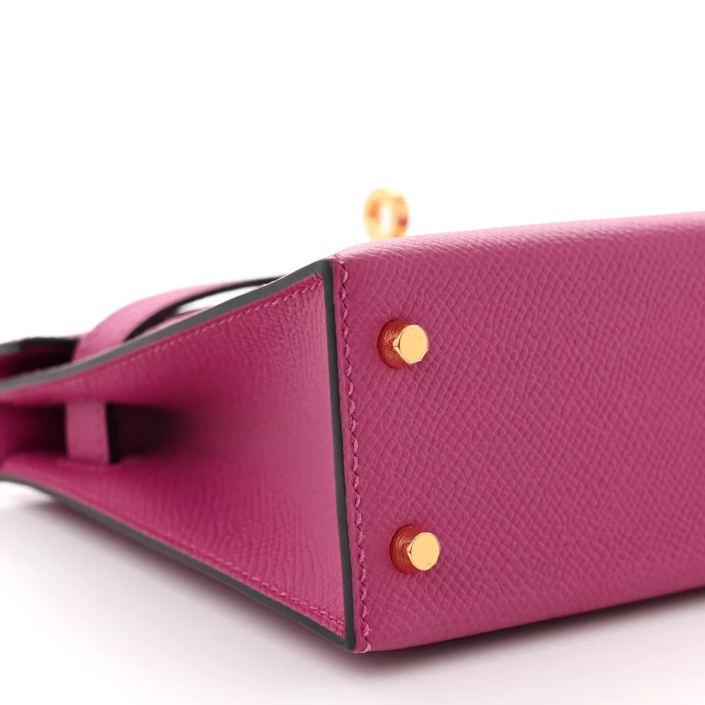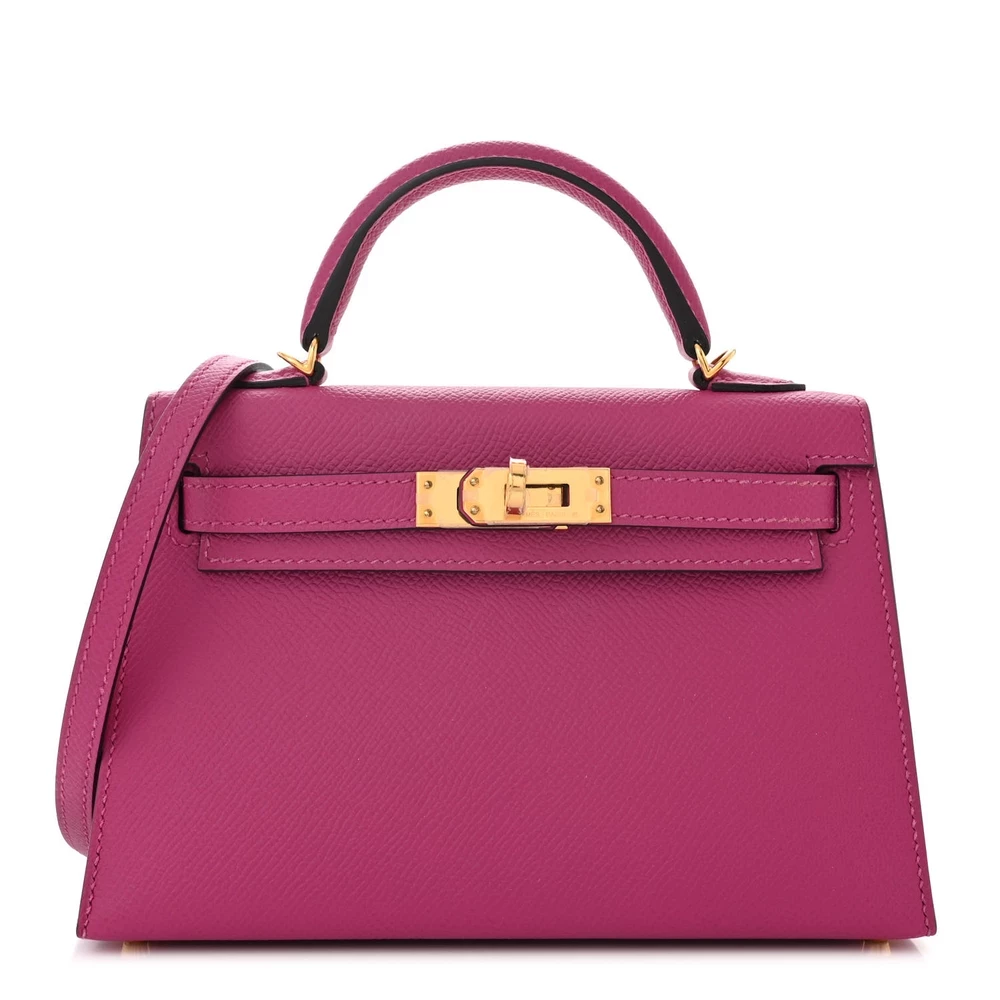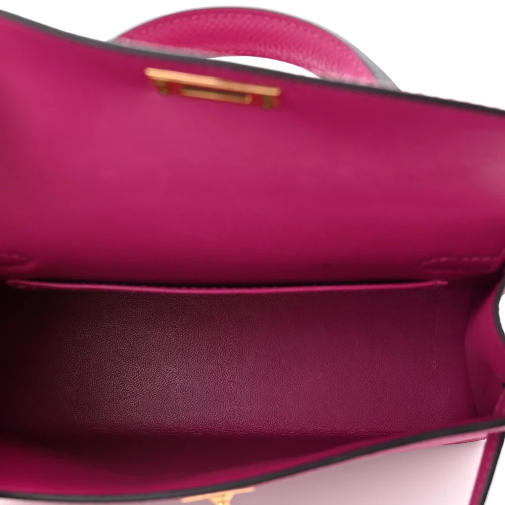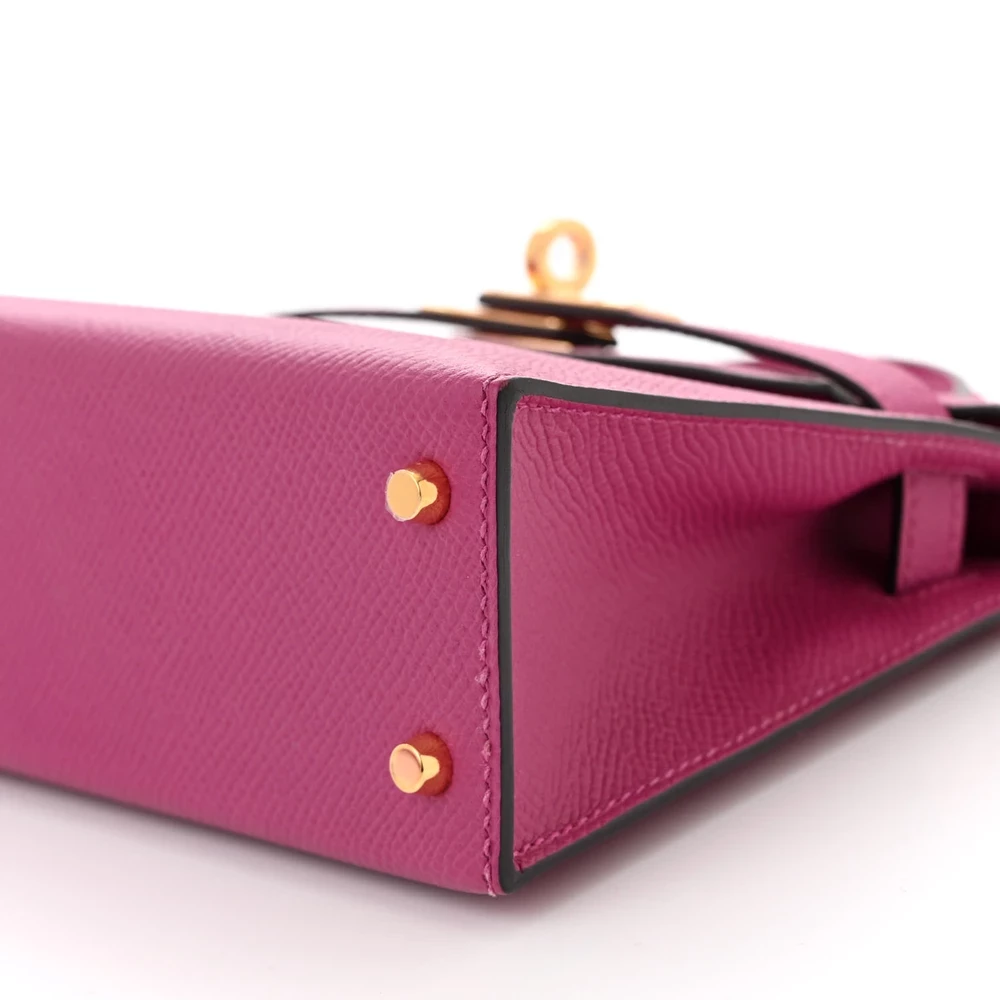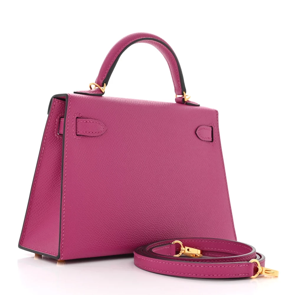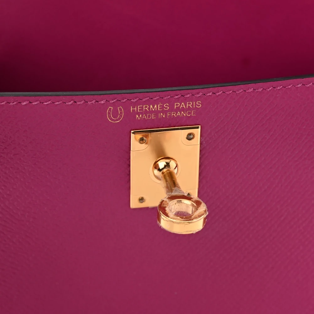 This Hermès Epsom Horseshoe Mini Kelly Sellier 20 Rose Pourpre is a rare and exclusive handbag with a custom Horseshoe Stamp. The Epsom leather ensures a structured and polished appearance, highlighting the deep pink Rose Pourpre shade. Gold hardware enhances its warm and luxurious appeal. The compact 20 cm size makes it a charming and collectible piece. This Mini Kelly is a vibrant statement bag for those who appreciate rarity.