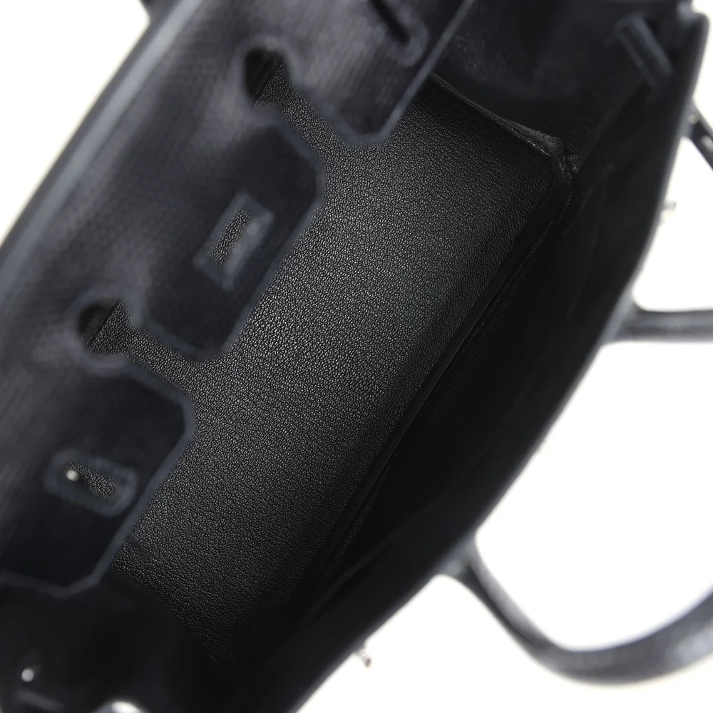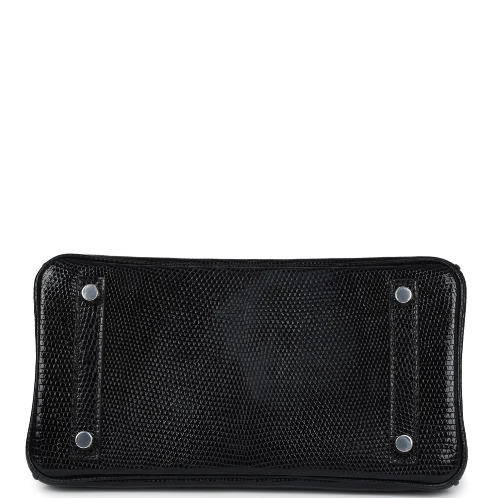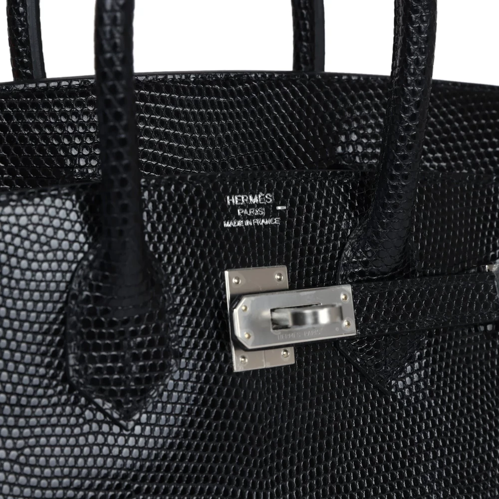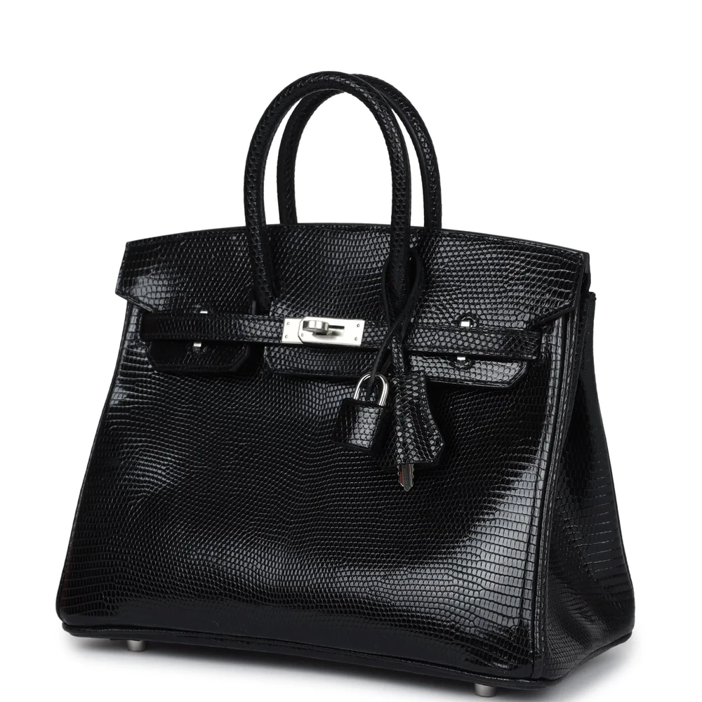 This Hermès Birkin 25 is designed in black shiny Varanus Niloticus lizard leather with palladium hardware, featuring tonal stitching, a front flap with two straps and a center toggle closure, a clochette with lock and two keys, and double rolled handles. The interior is lined with black chèvre leather and includes one zip pocket with an Hermès engraved zipper pull and an open pocket on the opposite side. The shiny lizard leather gives this 25 cm Birkin a sleek and polished appearance. The palladium hardware provides a subtle yet luxurious touch. This Birkin’s unique texture makes it stand out in any collection. The luxurious interior lining offers both elegance and durability.