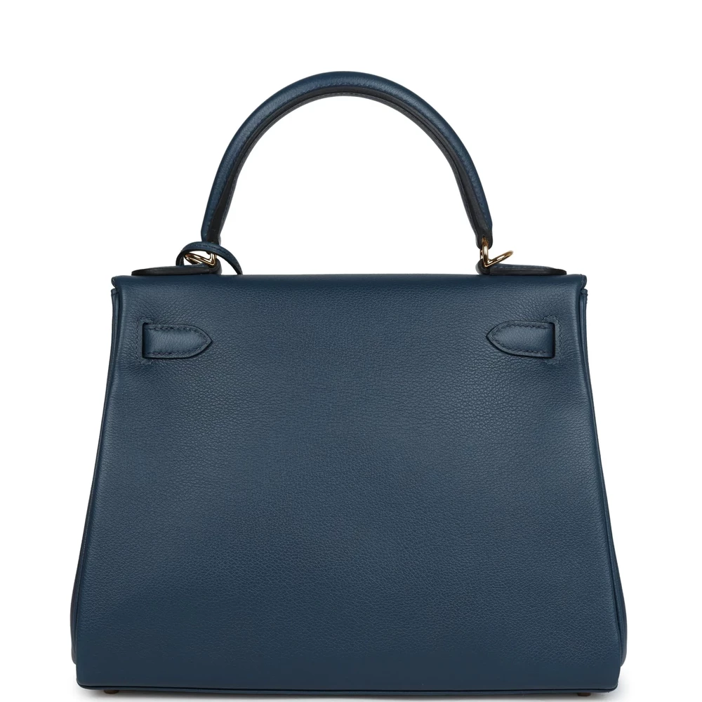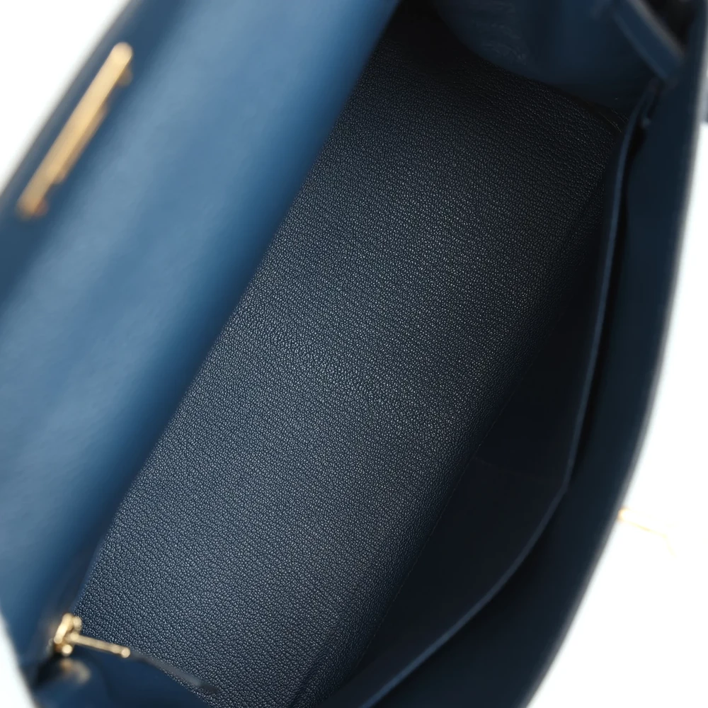 This Hermès Kelly Retourne 28 in Deep Bleu is a timeless and elegant choice. Made from durable Evercolor leather, it features a slouchy silhouette. The Gold hardware adds a touch of opulence. Its deep blue hue is perfect for adding sophistication to any outfit. The spacious interior offers practicality and style. A must-have for any Hermès enthusiast. This bag is a true investment piece.