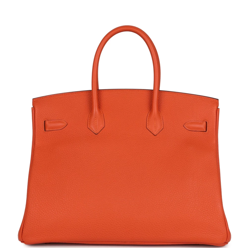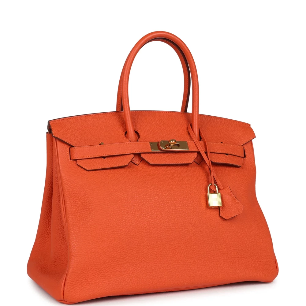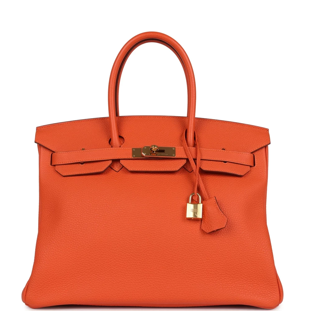 This Hermès Birkin 35 is crafted from Feu (orange) Togo leather with gold hardware. It features tonal stitching, a front flap with two straps and a center toggle closure, a clochette with lock and two keys, and double rolled handles. The interior is lined with Feu chèvre leather and includes one zip pocket with an Hermès engraved zipper pull and an open pocket on the opposite side. The vibrant orange Feu leather adds a bold, energetic touch to this timeless design. The 35 cm size is practical yet elegant for everyday use. Gold hardware enhances the bag’s luxurious appeal.