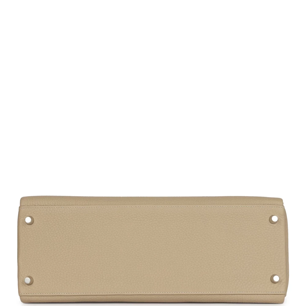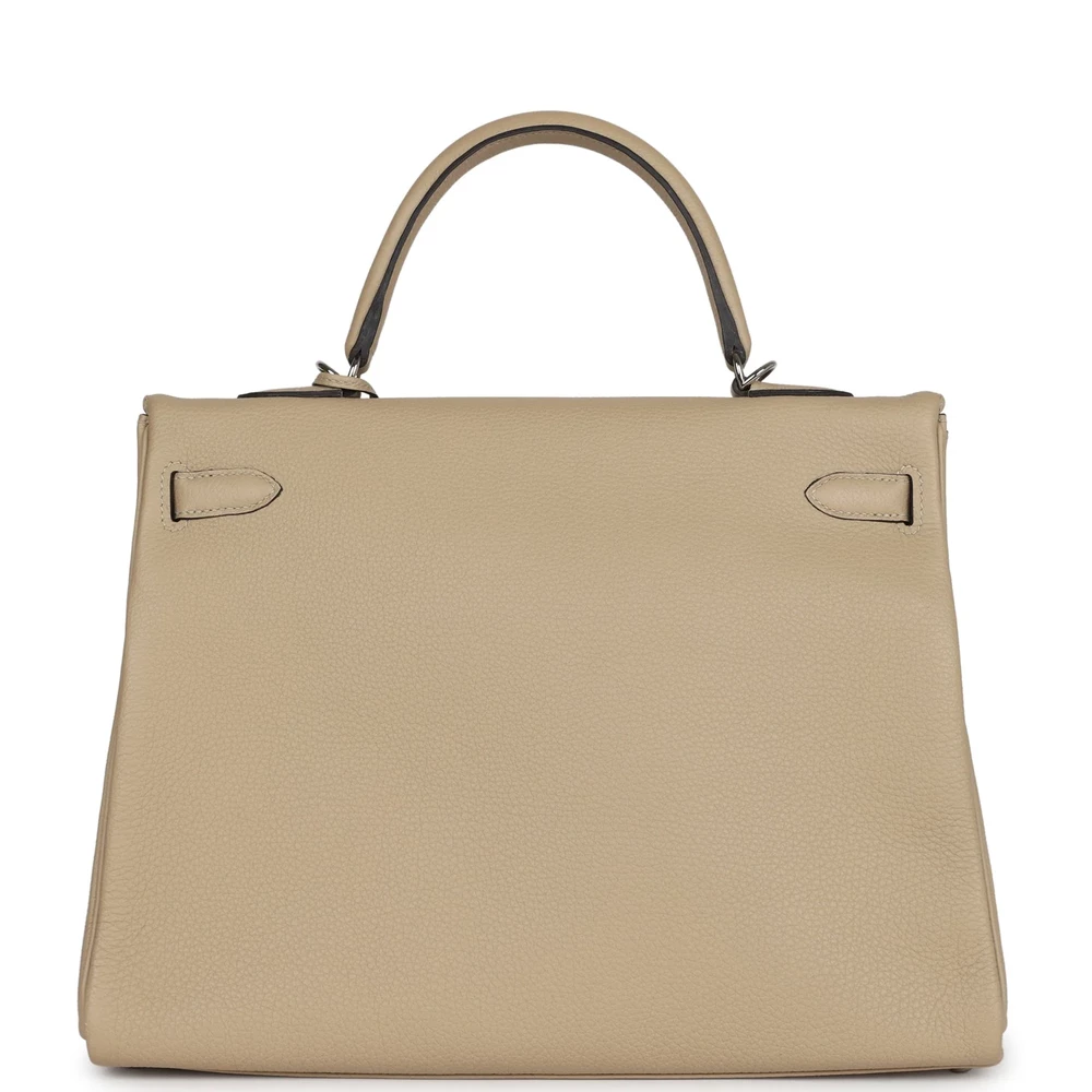 This Hermès Kelly Retourne 35 in Trench is a timeless and elegant choice. Made from durable Togo leather, it features a slouchy silhouette. The Palladium hardware adds a modern touch. Its warm beige hue is perfect for adding sophistication to any outfit. The spacious interior offers practicality and style. A must-have for collectors. This bag is a true Hermès treasure.
