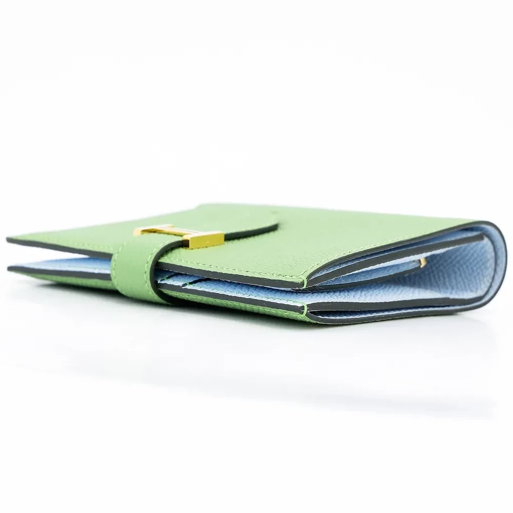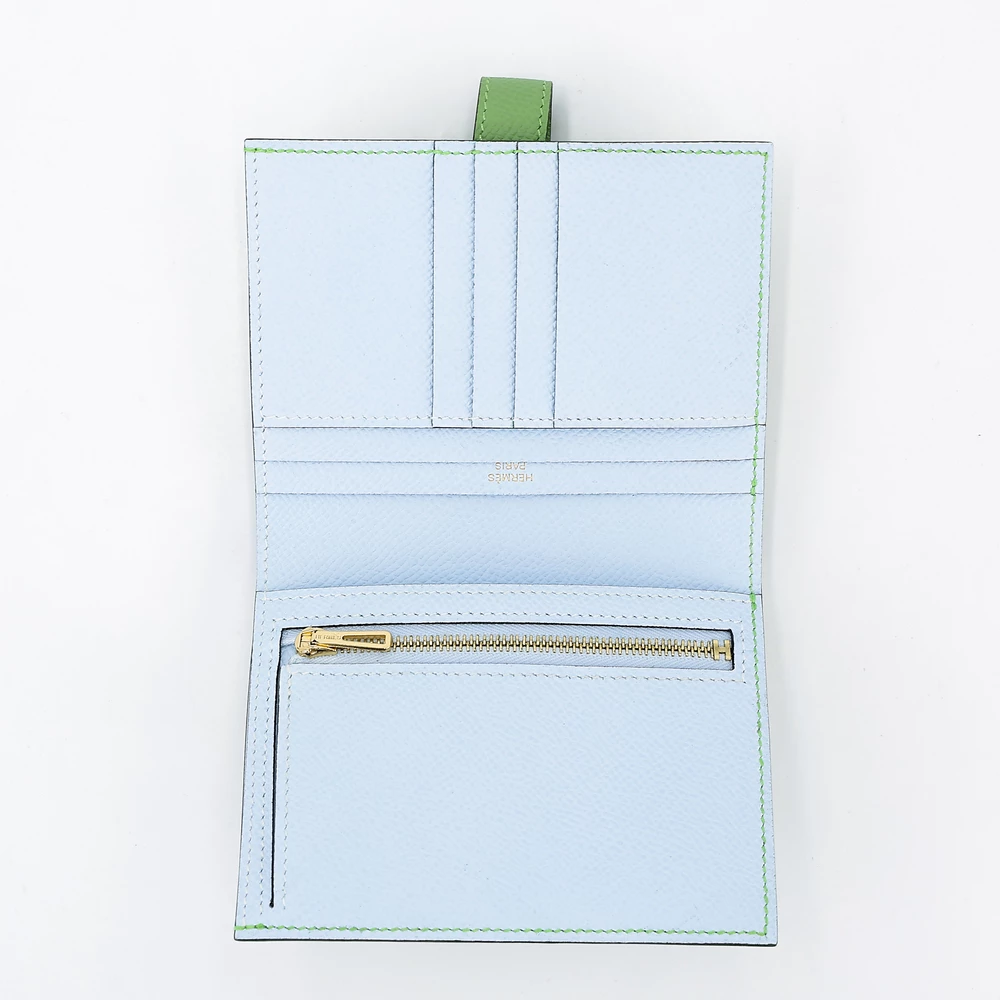 This Hermès Bearn Compact wallet is a refined and stylish accessory, crafted from durable Epsom leather in a striking combination of Vert Criquet (3I) and Bleu Pale (08). The refreshing green and soft blue tones create a unique contrast, beautifully complemented by radiant gold hardware for an elegant touch. Stamped with a “Y” for 2020, this piece reflects Hermès’ dedication to impeccable craftsmanship and timeless design. Measuring approximately 12cm in width, 9.5cm in height, and 3cm in depth, it offers a compact yet functional layout for organizing essentials. Accompanied by its original box, this exquisite wallet is available in Hong Kong, making it a sought-after addition for collectors and fashion enthusiasts alike.