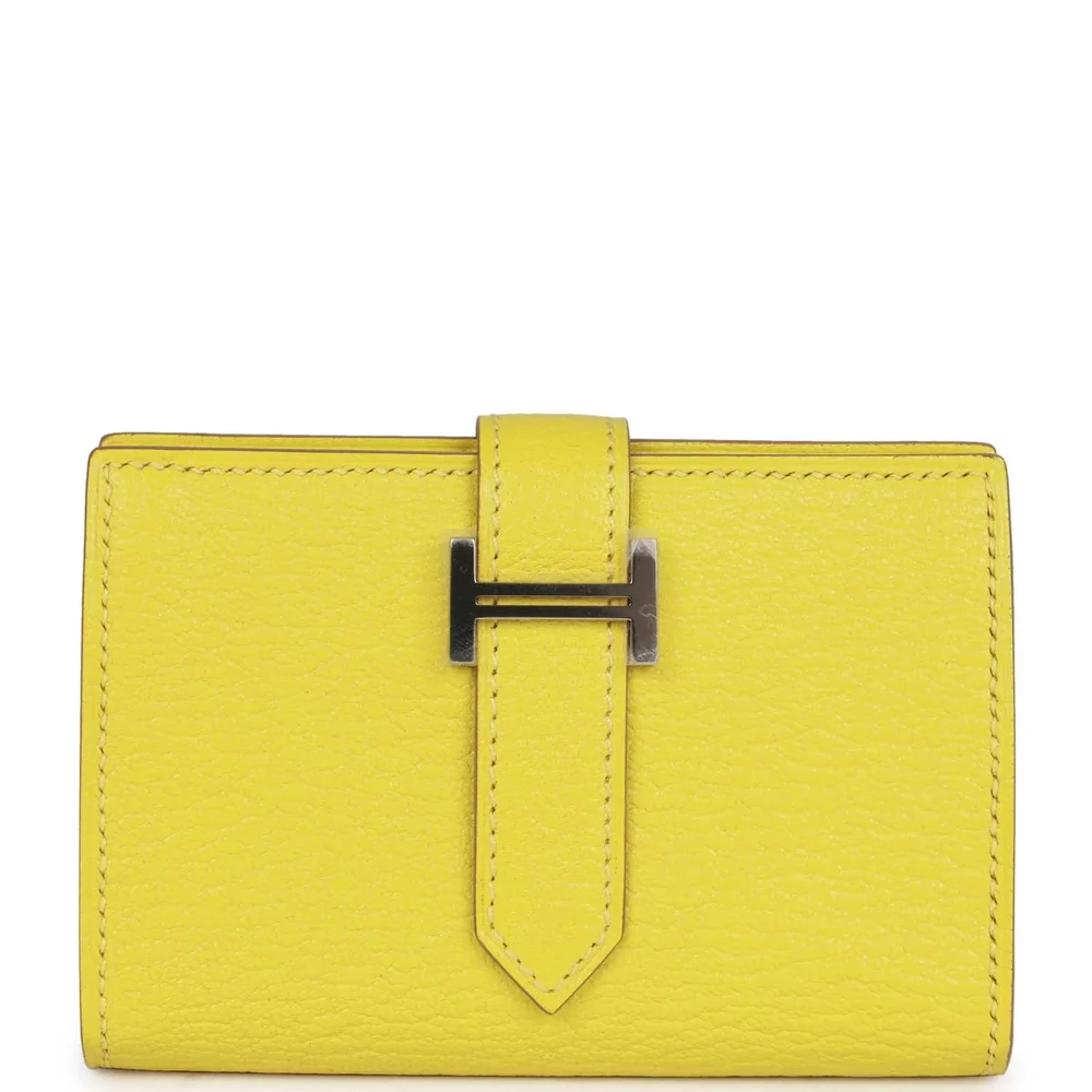 This Hermès Béarn Mini Wallet in Lime is a compact treasure of refined craftsmanship. Made from Chèvre Mysore leather, its supple texture enhances the vibrant lime hue, creating a fresh and modern appeal. The iconic “H” clasp in gold hardware adds a touch of classic Hermès elegance, while the well-organized interior provides ample space for cards and essentials. Sleek and sophisticated, this wallet is perfect for those who appreciate understated luxury.