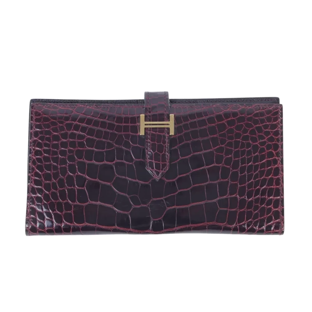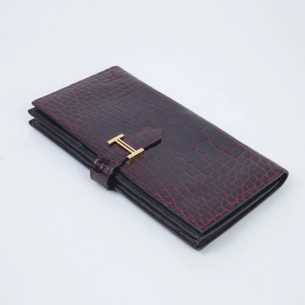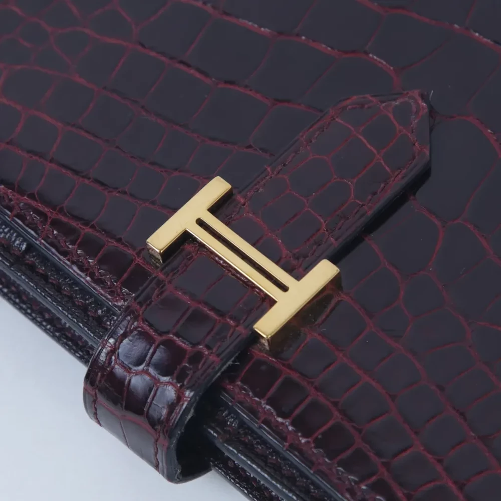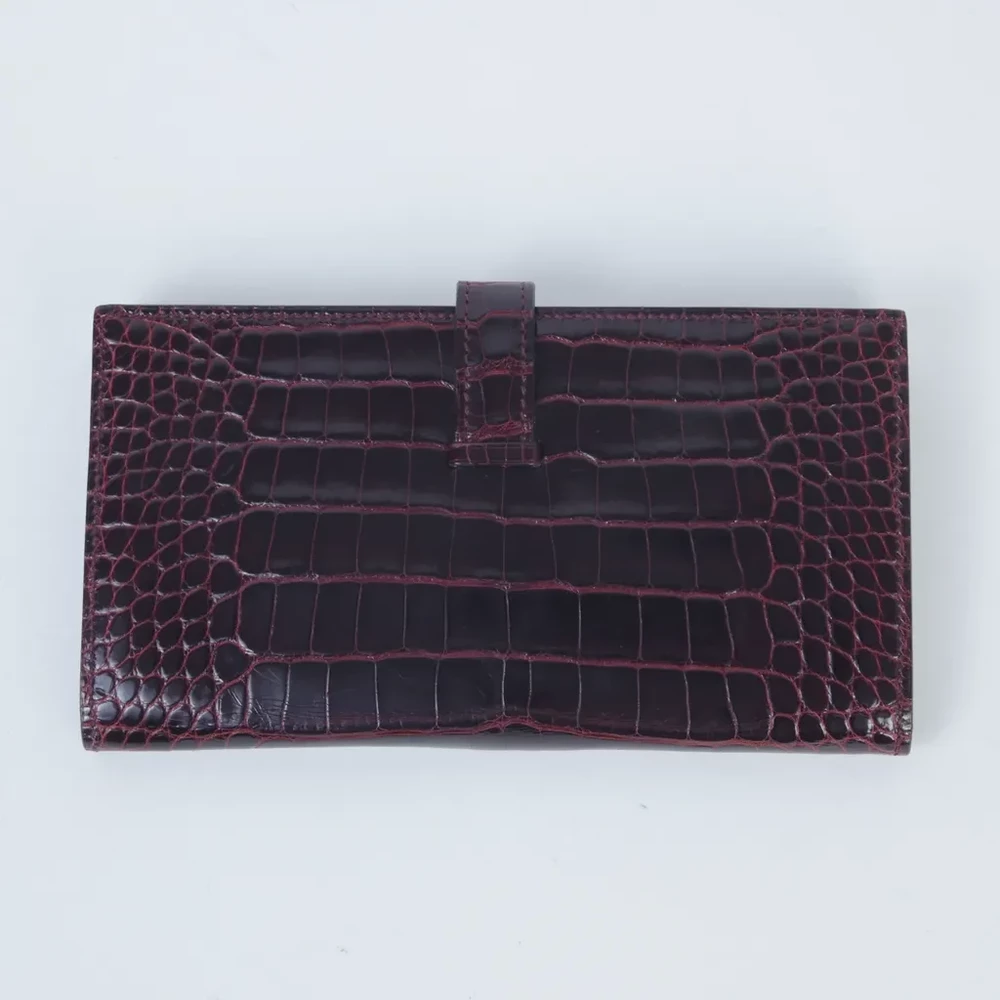 This Hermès Bearn Souffle wallet is a timeless expression of luxury, crafted from exquisite alligator leather in the deep and sophisticated Rouge H (55) shade. The rich texture of the exotic leather is beautifully complemented by radiant gold hardware, adding a touch of opulence to its classic design. Stamped with a Square M for 2009, this wallet reflects Hermès’ longstanding tradition of exceptional craftsmanship. Measuring approximately 17.5cm in width, 10cm in height, and 2cm in depth, it offers a sleek yet functional design perfect for organizing essentials. While it does not include accessories, its enduring elegance and rarity make it a highly desirable piece. Currently available in Japan, this wallet is an exquisite addition to any luxury collection.