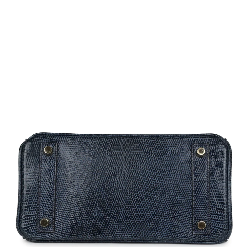 This Hermès Birkin is made from Bleu De Malte Varanus Niloticus lizard leather with gold hardware, showcasing tonal stitching, a front flap with two straps and a center toggle closure, a clochette with lock and two keys, and double rolled handles. The interior is lined with matching chèvre leather and offers one zip pocket with an Hermès-engraved zipper pull and an open pocket on the opposite side.