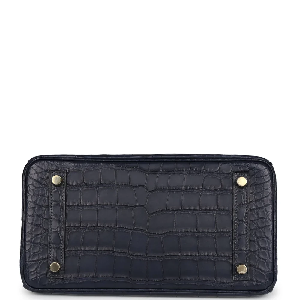 This Hermès Birkin is crafted from Bleu Indigo matte Alligator Mississippiensis leather with gold hardware, featuring tonal stitching, a front flap with two straps and a center toggle closure, a clochette with lock and two keys, and double rolled handles. The interior is lined with Bleu Indigo chèvre leather and includes one zip pocket with an Hermès-engraved zipper pull and an open pocket on the opposite side.