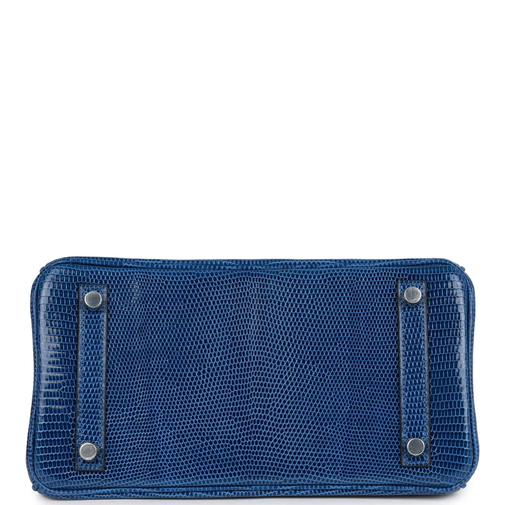 This Hermès Birkin is crafted from Bleu Saphir lizard leather with palladium hardware, featuring tonal stitching, a front flap with two straps and a center toggle closure, a clochette with lock and two keys, and double rolled handles. The interior is lined with Bleu Saphir chèvre leather and includes one zip pocket with an Hermès-engraved zipper pull and an open pocket on the opposite side.