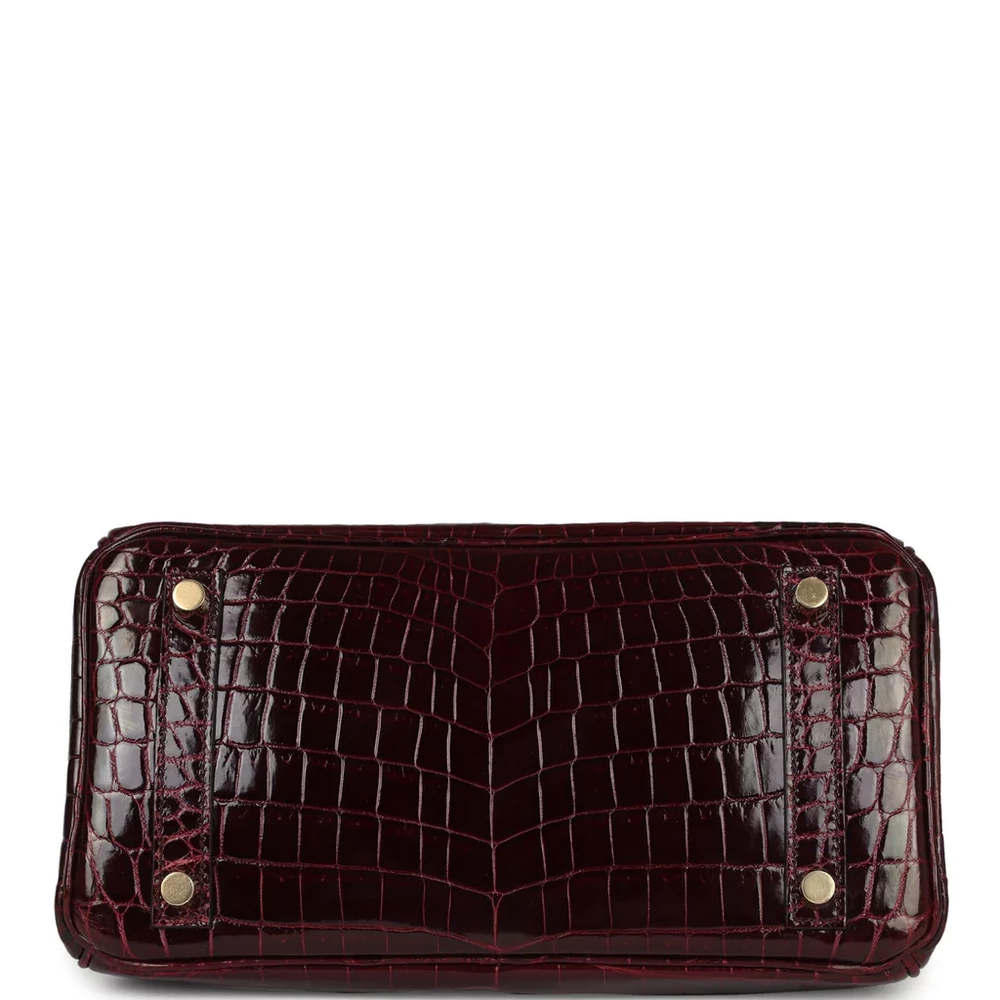 This Hermès Birkin is made from Bordeaux Shiny Niloticus Crocodile leather with gold hardware, showcasing an exotic and elegant design. The bag features tonal stitching, a front flap with two straps, and a front toggle closure for added security. A clochette with a lock and two keys adds extra elegance, while the double rolled handles provide comfort. The interior is lined with Bordeaux Chevre leather, offering a refined and luxurious touch. It includes one zip pocket with an Hermès engraved zipper pull and an open pocket on the opposite side for practical organization.