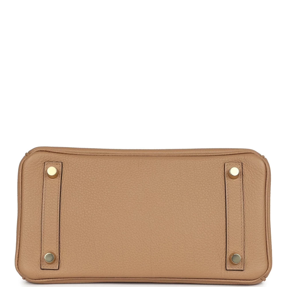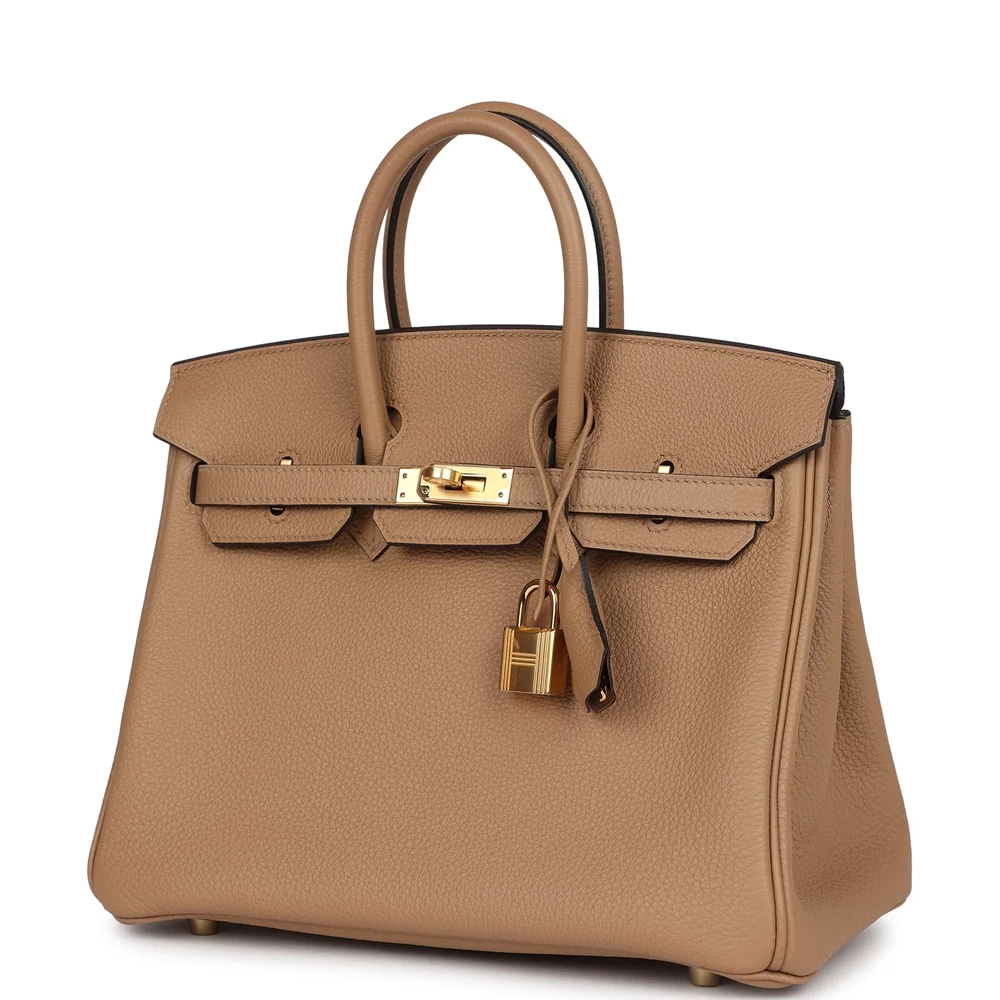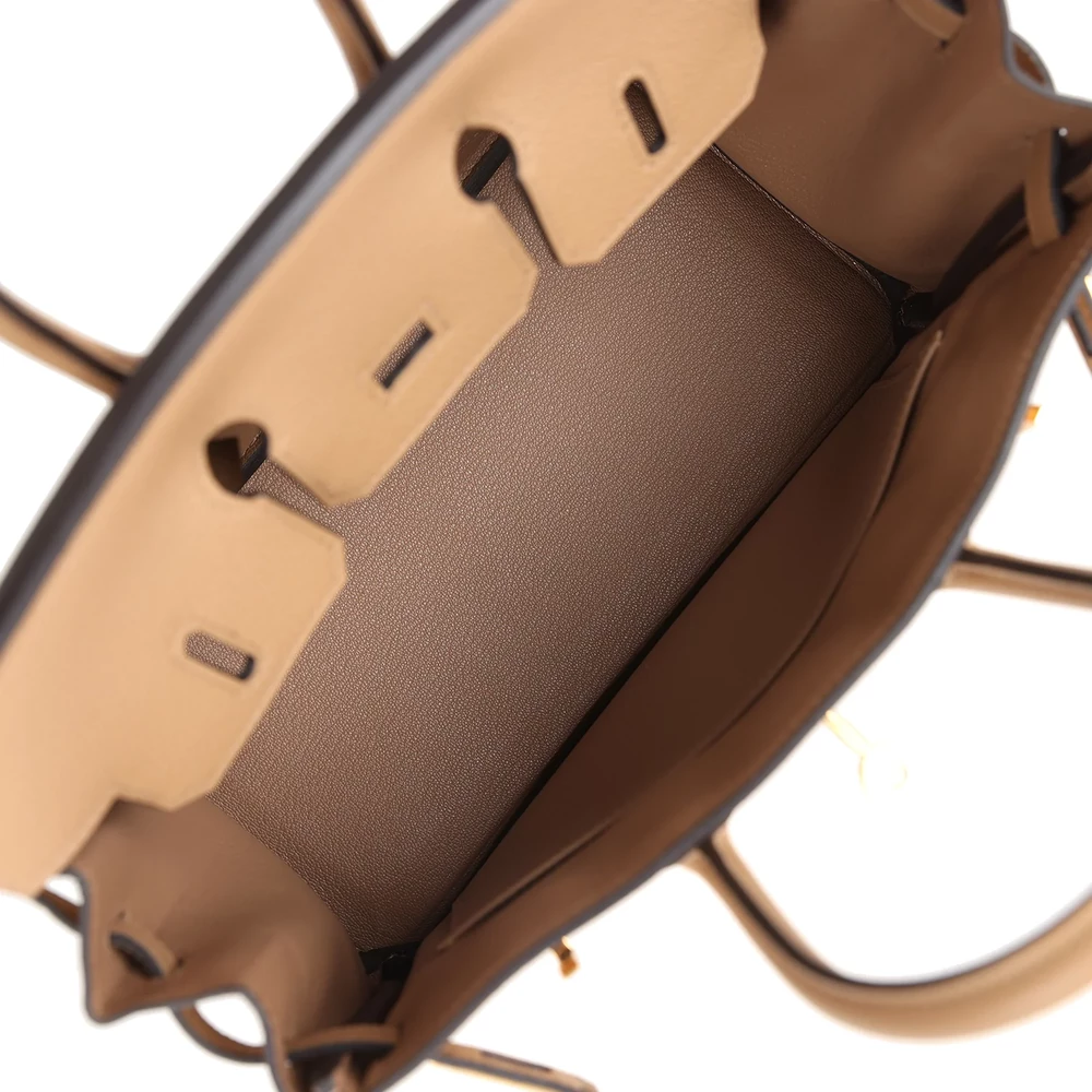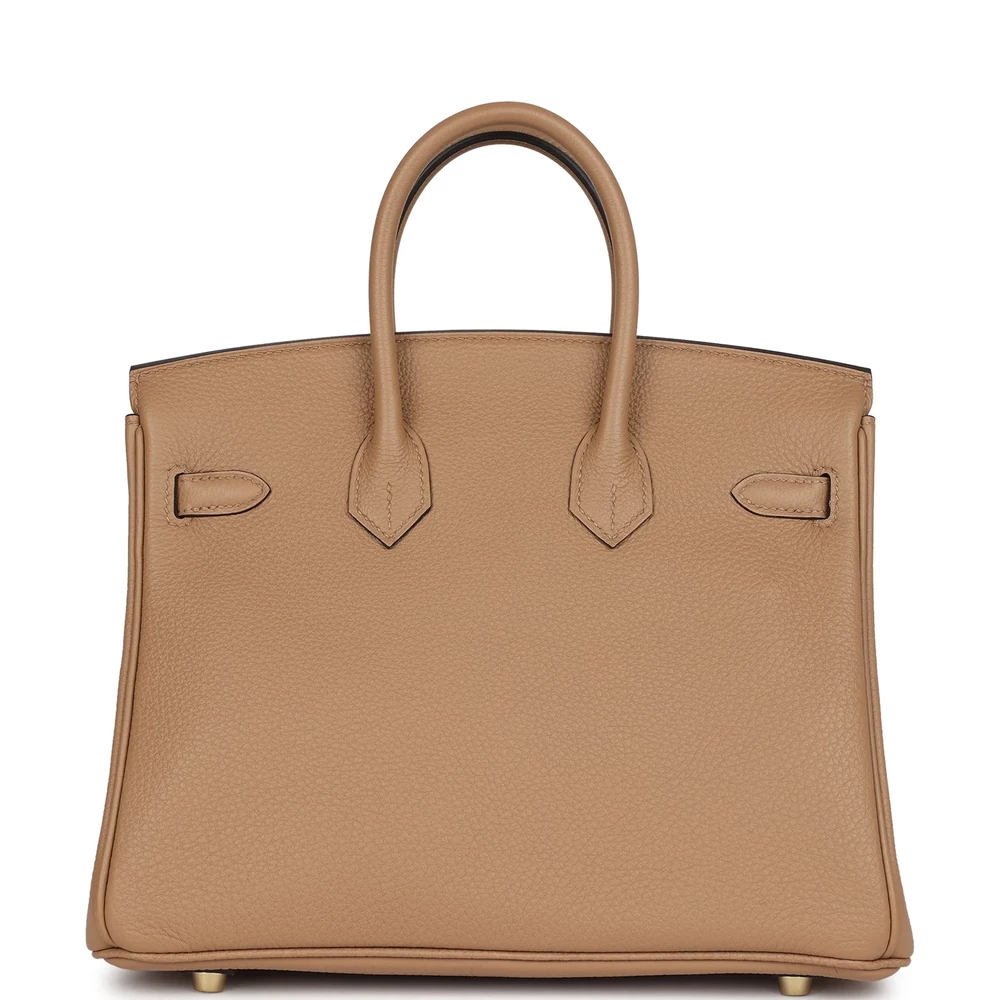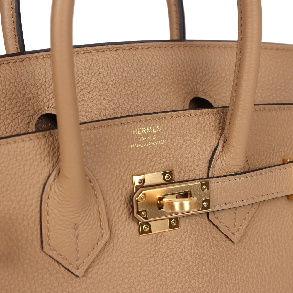 This Hermès Birkin 25 is crafted from Chai Togo leather with gold hardware, featuring tonal stitching, a front flap with two straps and a center toggle closure, a clochette with lock and two keys, and double rolled handles. The interior is lined with matching chèvre leather and includes one zip pocket with an Hermès engraved zipper pull and an open pocket on the opposite side. The Chai Togo leather gives this Birkin a rich, neutral tone that pairs well with any outfit. The 25 cm size is perfect for those who prefer a compact and practical bag. The gold hardware enhances the elegant look of this design.