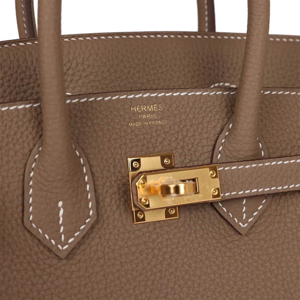 This Hermès Birkin is made from Etoupe Togo leather with gold hardware. It includes contrast stitching, a front flap with two straps and a center toggle closure, a clochette with lock and two keys, and double rolled handles. The interior is lined with Etoupe chèvre leather and has one zip pocket with an Hermès-engraved zipper pull and an open pocket on the opposite side. The soft, textured Togo leather gives this Birkin a timeless, elegant appearance. The gold hardware provides a classic contrast to the rich Etoupe leather. The interior offers ample room for all your essentials and more.