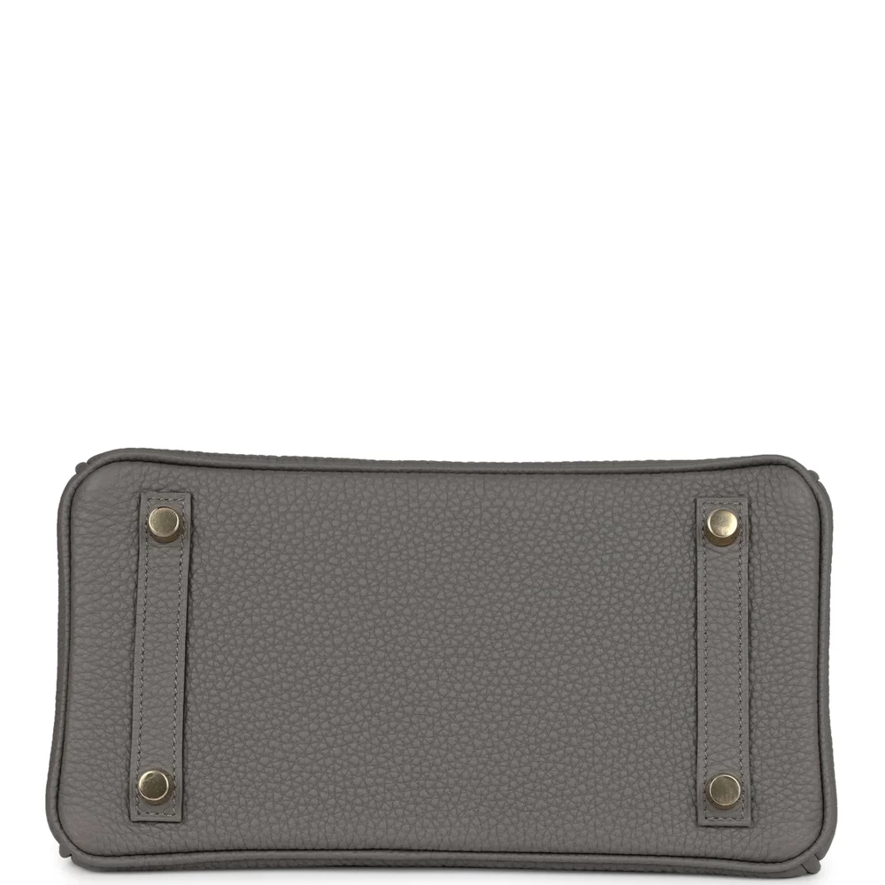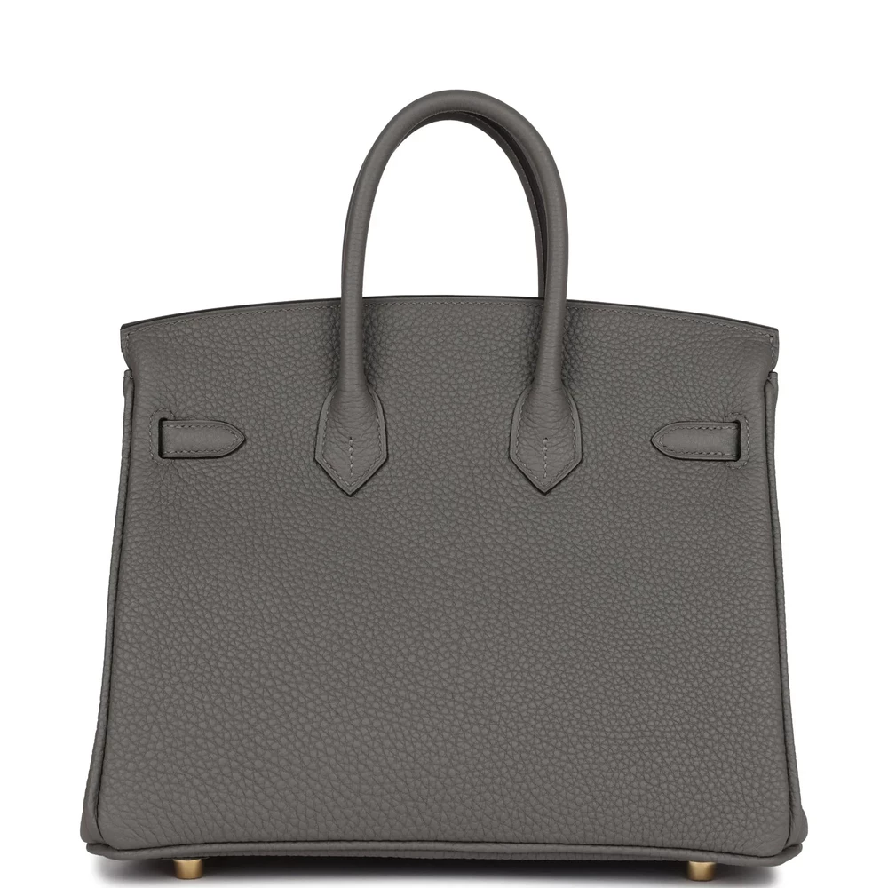 This Hermès Birkin 25 is crafted from Gris Meyer Togo leather with permabrass hardware, featuring tonal stitching, a front flap, two straps with a center toggle closure, a clochette with lock and two keys, and double rolled handles. The interior is lined with Gris Meyer chèvre leather and includes one zip pocket with an Hermès engraved zipper pull and an open pocket on the opposite side. The combination of Gris Meyer Togo leather and permabrass hardware gives it a sophisticated yet subtle look. The 25 cm size is perfect for a compact yet versatile everyday bag. The bag’s timeless design ensures it will always remain in style. The high-quality chèvre lining ensures durability and elegance.