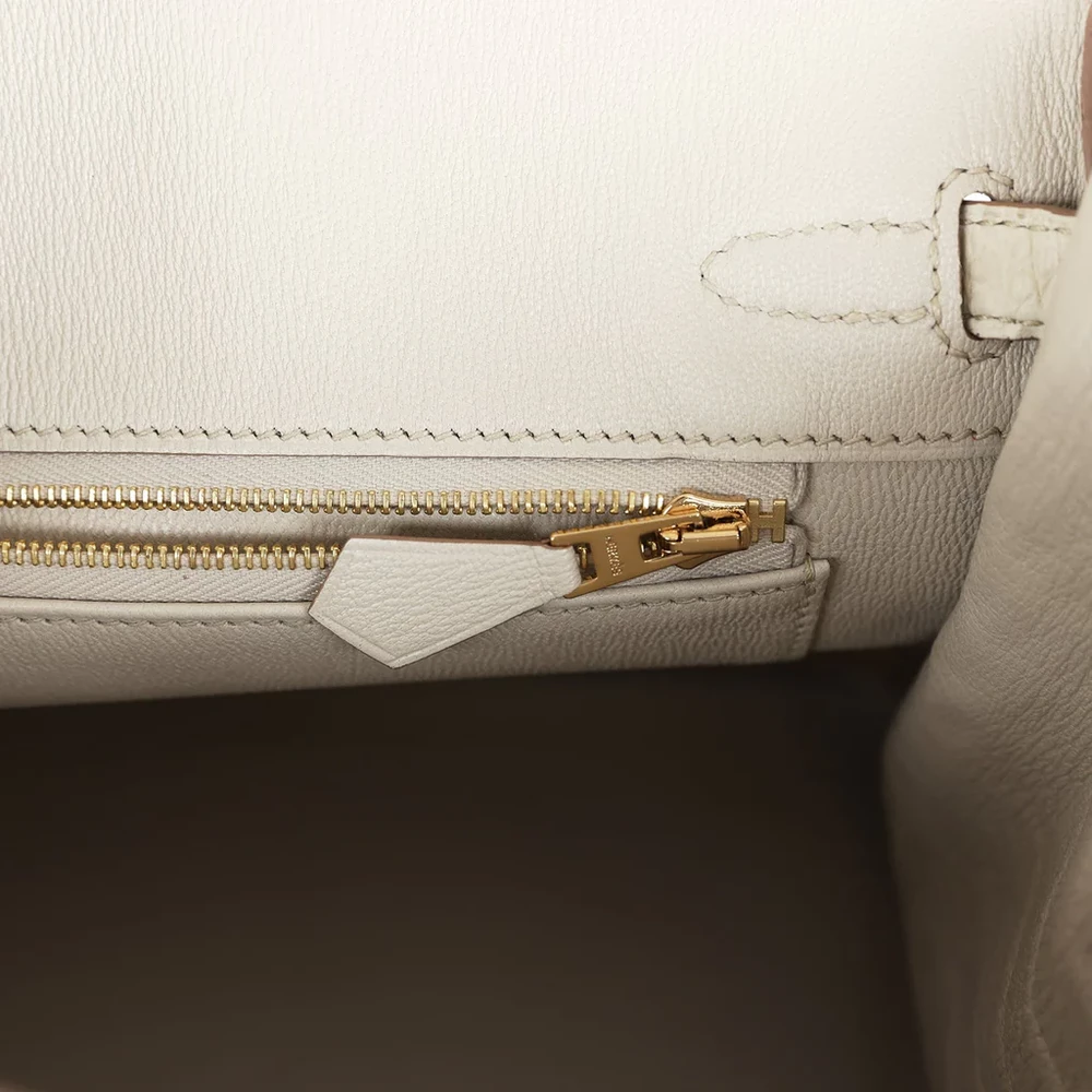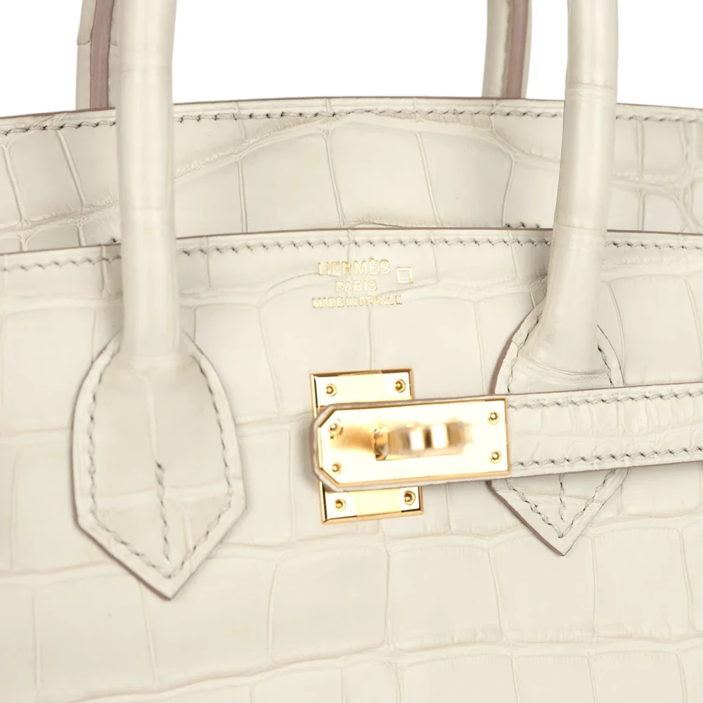 This Hermès Birkin is crafted from Beton Matte Mississippienis alligator leather with gold hardware for a striking, sophisticated design. It features tonal stitching and a front strap with two straps secured by a center toggle closure. The bag also includes a clochette with a lock and two keys, along with double rolled handles for easy carrying. The interior is lined with Beton Chevre leather, offering a smooth, premium finish. It has one zip pocket with an Hermès engraved zipper pull and an open pocket on the opposite side for practical organization.