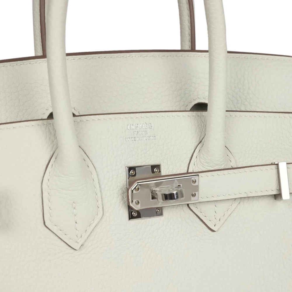 This Hermès Birkin is made from Mushroom Togo leather with palladium hardware. The bag features tonal stitching and a front flap, with two straps and a center toggle closure for secure fastening. A clochette with a lock and two keys adds a touch of elegance, while the double rolled handles ensure easy carrying. The interior is lined with Mushroom Chevre leather, offering a soft, premium finish. It has one zip pocket with an Hermès engraved zipper pull and an open pocket on the opposite side, providing ample space for your essentials.