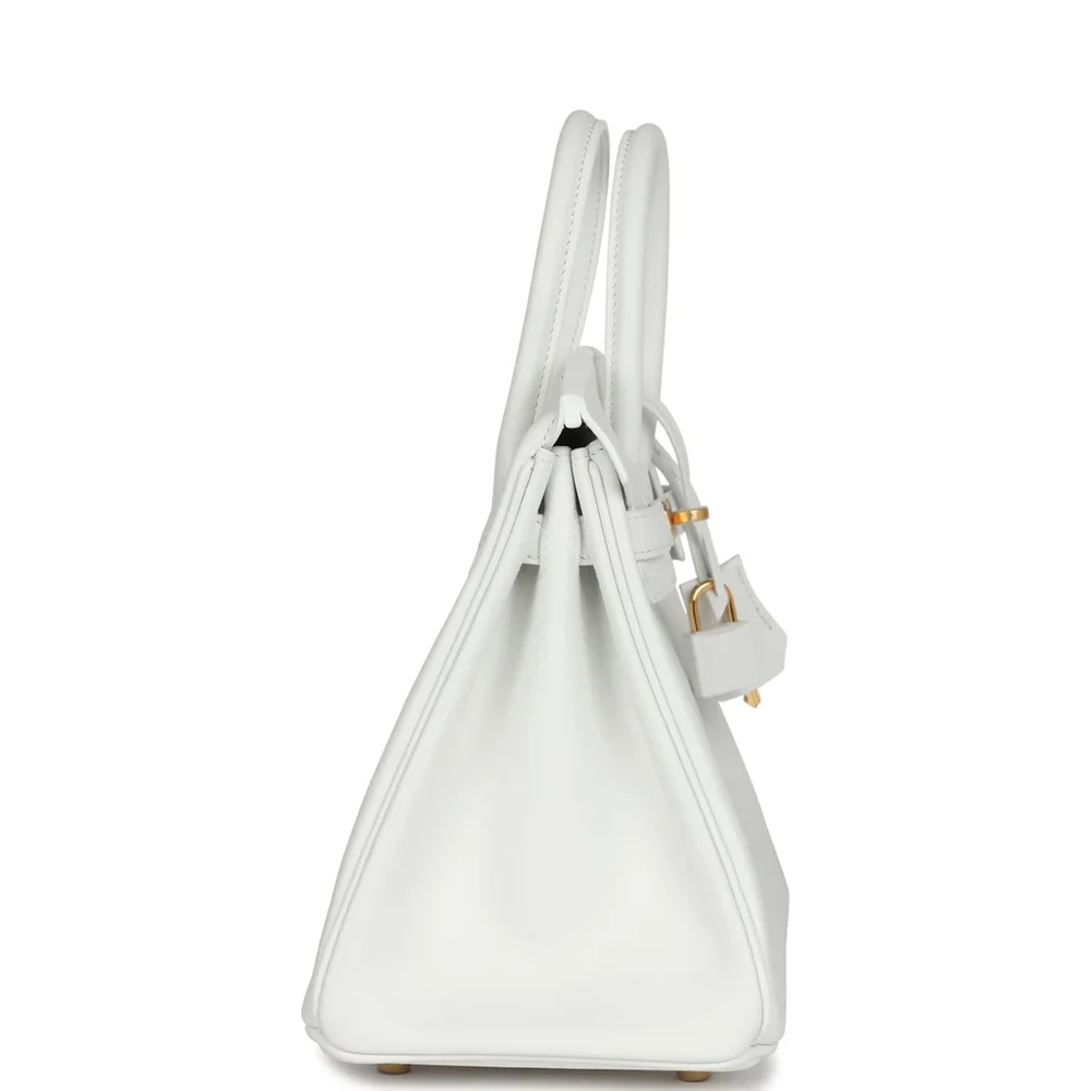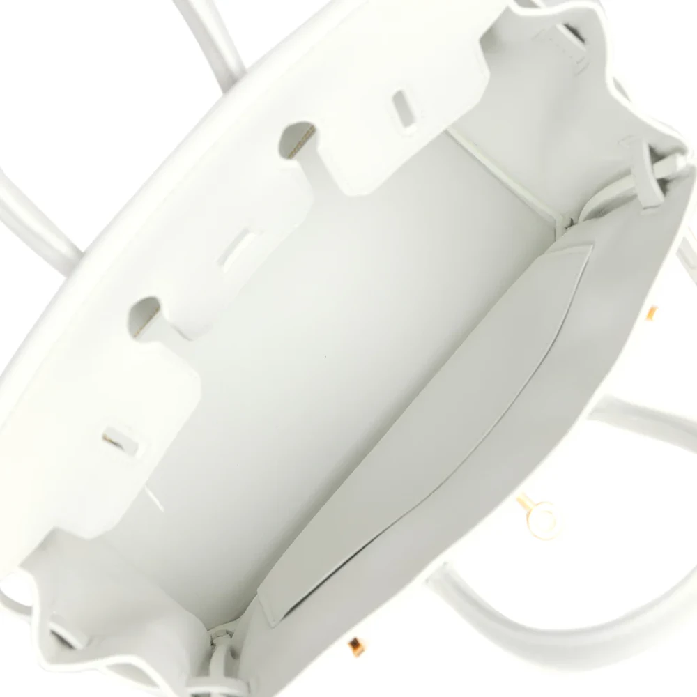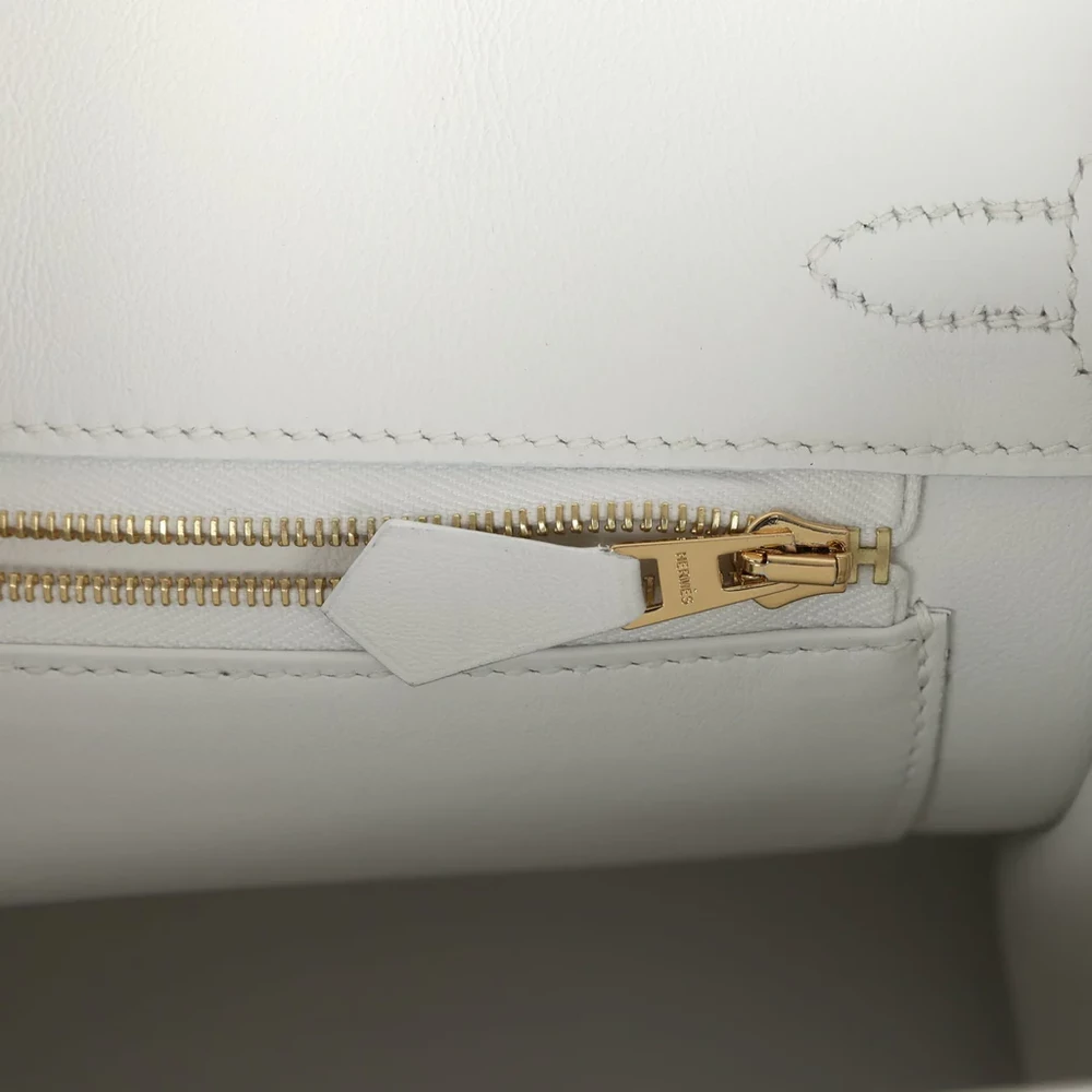 This Hermès Birkin is crafted from New White Swift leather with gold hardware. It features tonal stitching and a front flap with two straps and a center toggle closure. The bag also includes a clochette with a lock and two keys, along with double rolled handles for easy carrying. The interior is lined with New White Swift leather and offers one zip pocket with an Hermès engraved zipper pull, as well as an open pocket on the opposite side.