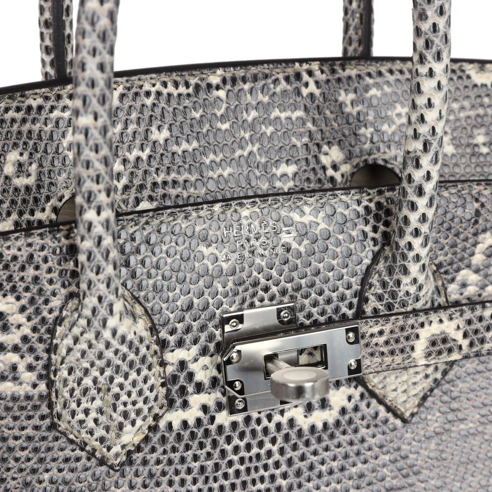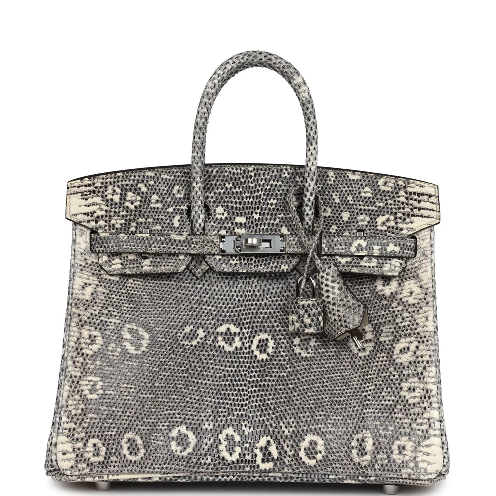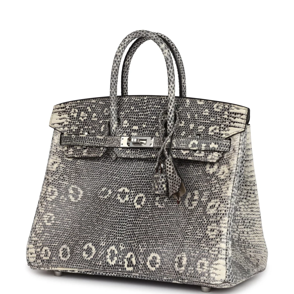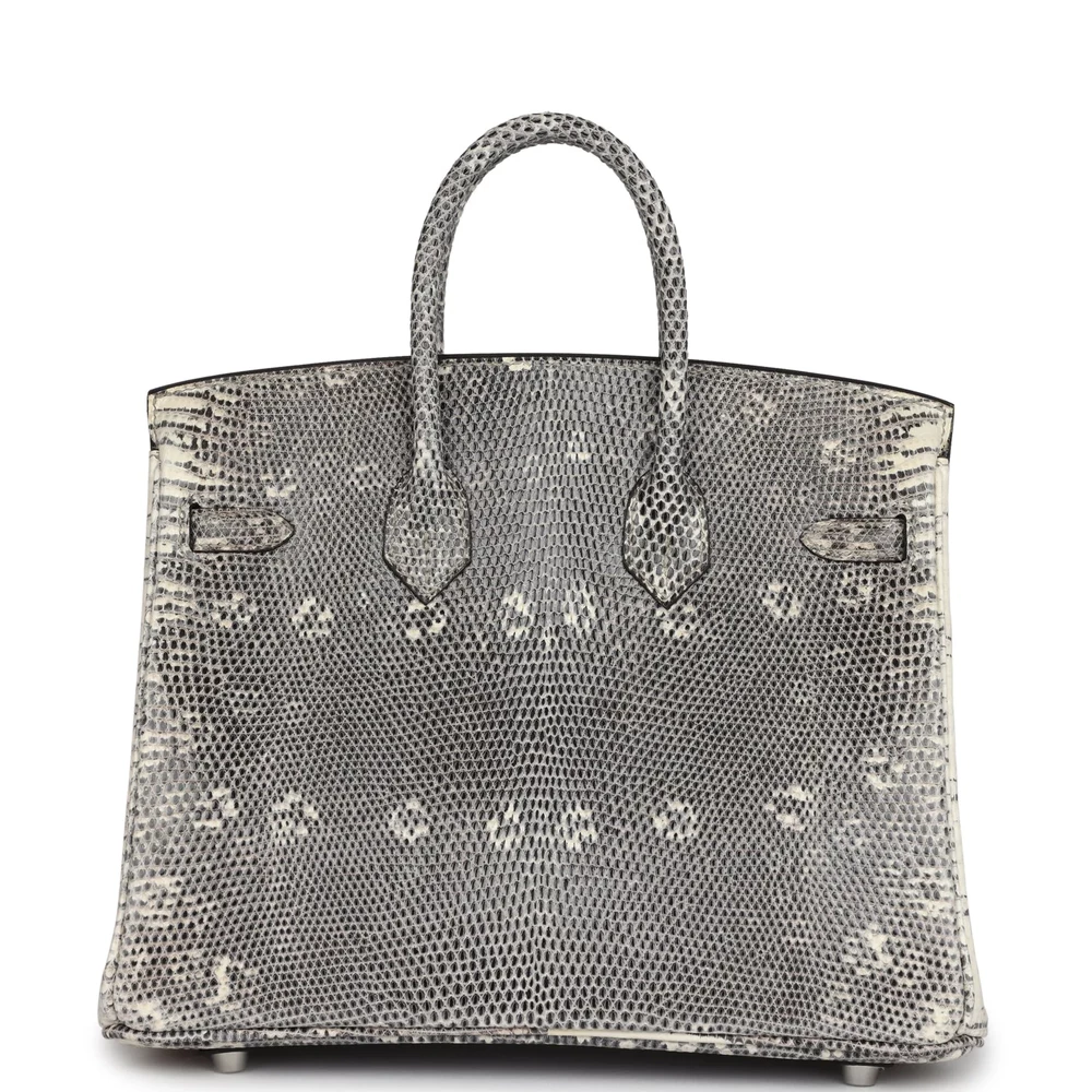 This Hermès Birkin 25 is crafted from Ombre Varanus Salvator lizard skin with palladium hardware, featuring tonal stitching, a front flap, two straps with a center toggle closure, a clochette with lock and two keys, and double rolled handles. The interior is lined with matching chèvre leather and includes one zip pocket with an Hermès engraved zipper pull and an open pocket on the opposite side. This bag is in new and never worn condition. The Ombre lizard skin provides a unique and sophisticated look with subtle color transitions. The palladium hardware adds a modern contrast to the rich texture of the leather. This Birkin is a statement piece for any collection.
